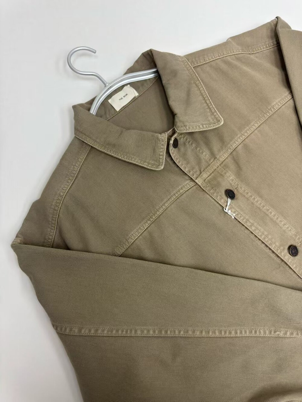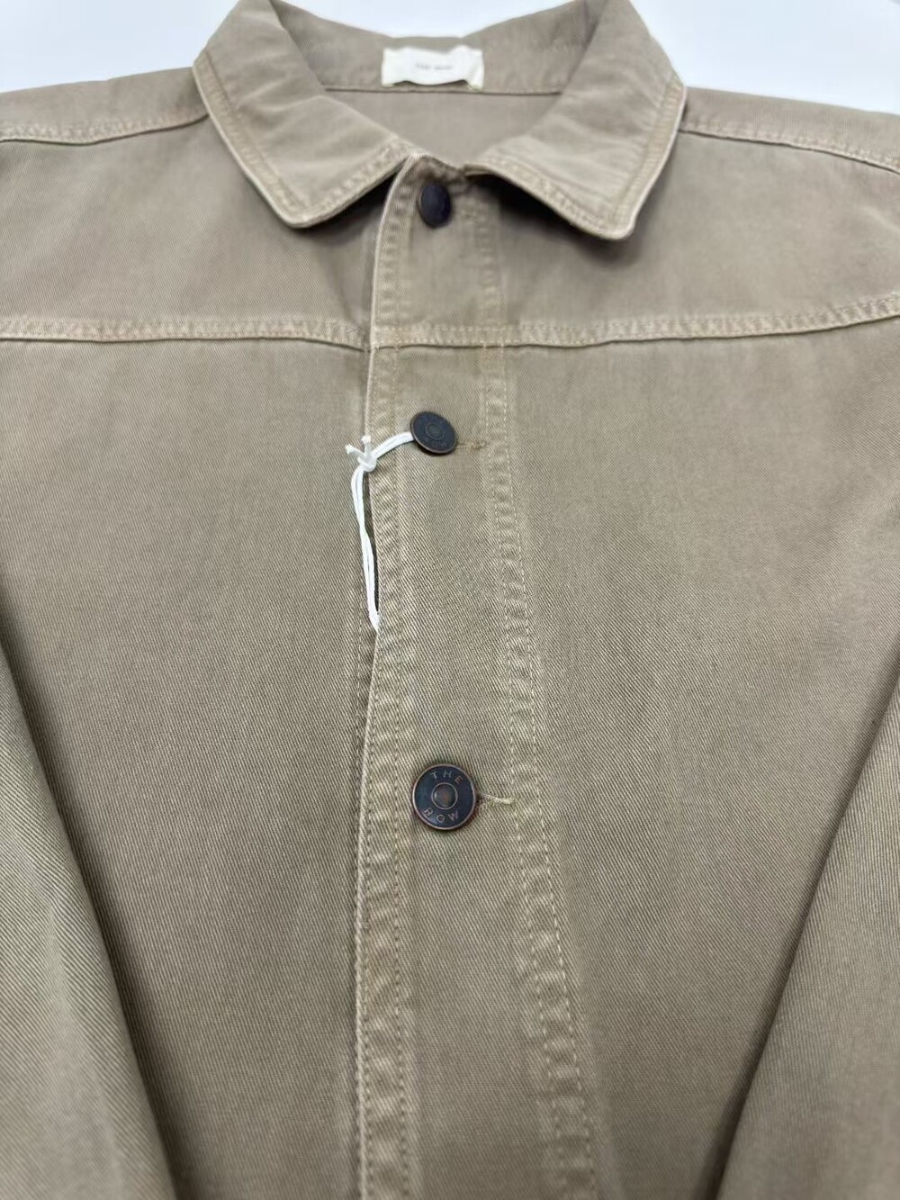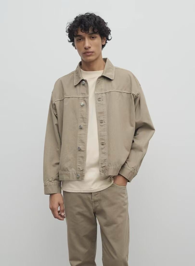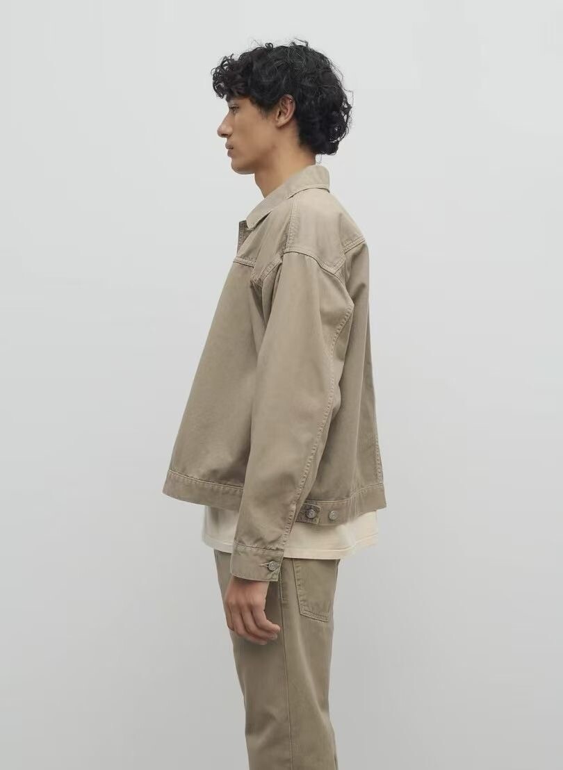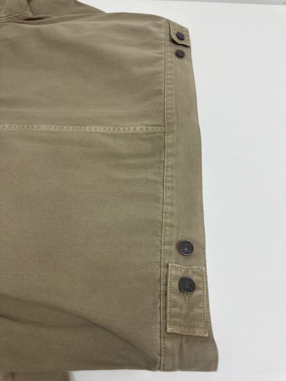 100% 면 소재의 루즈핏 셔츠입니다. 앞면 버튼 여밈 방식이며, 버튼 커프스 디테일이 있습니다.