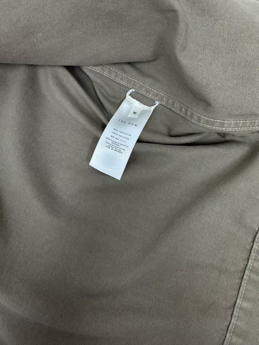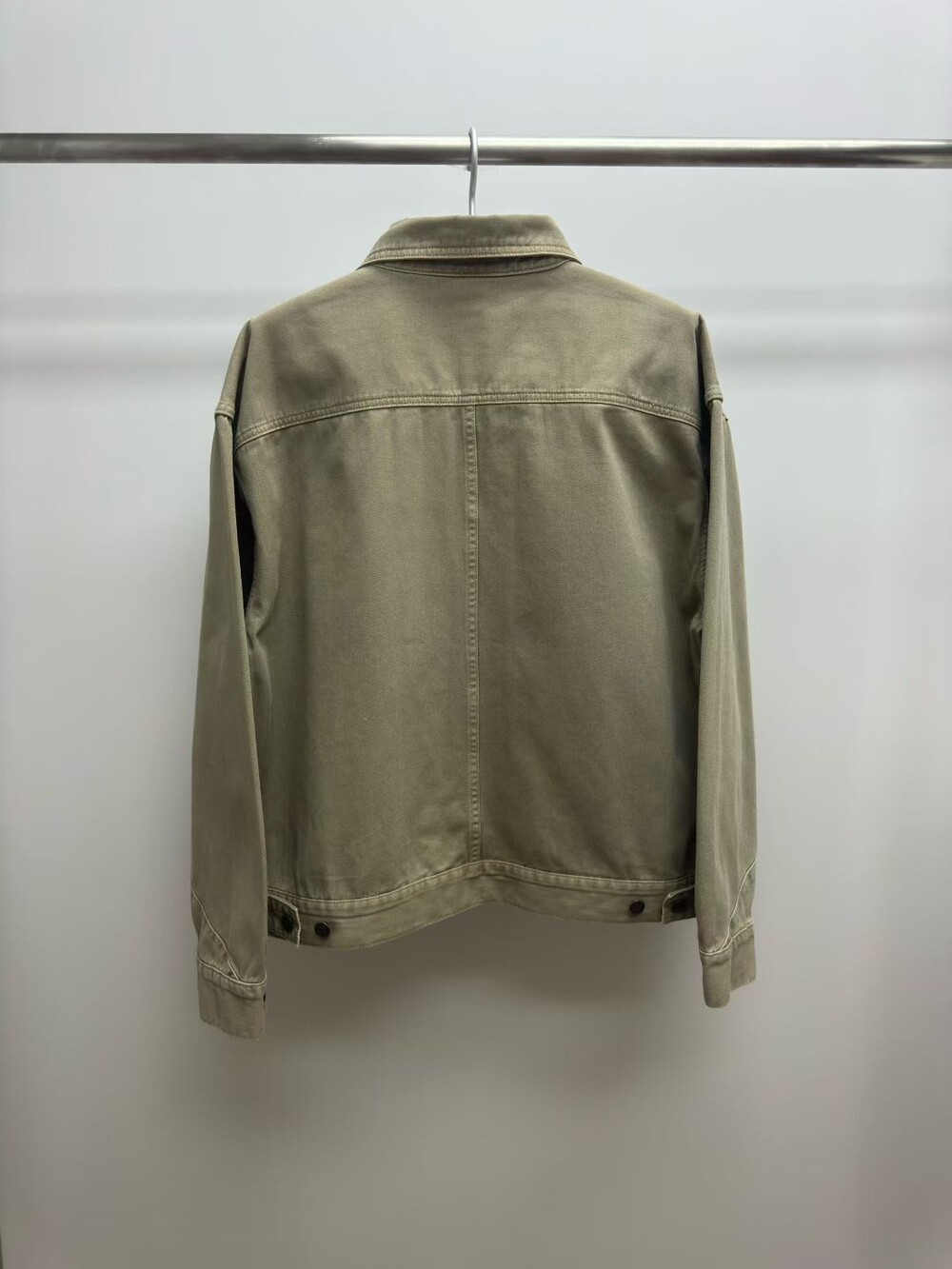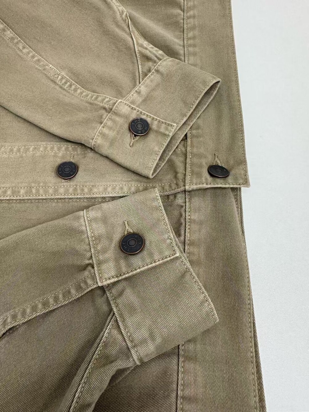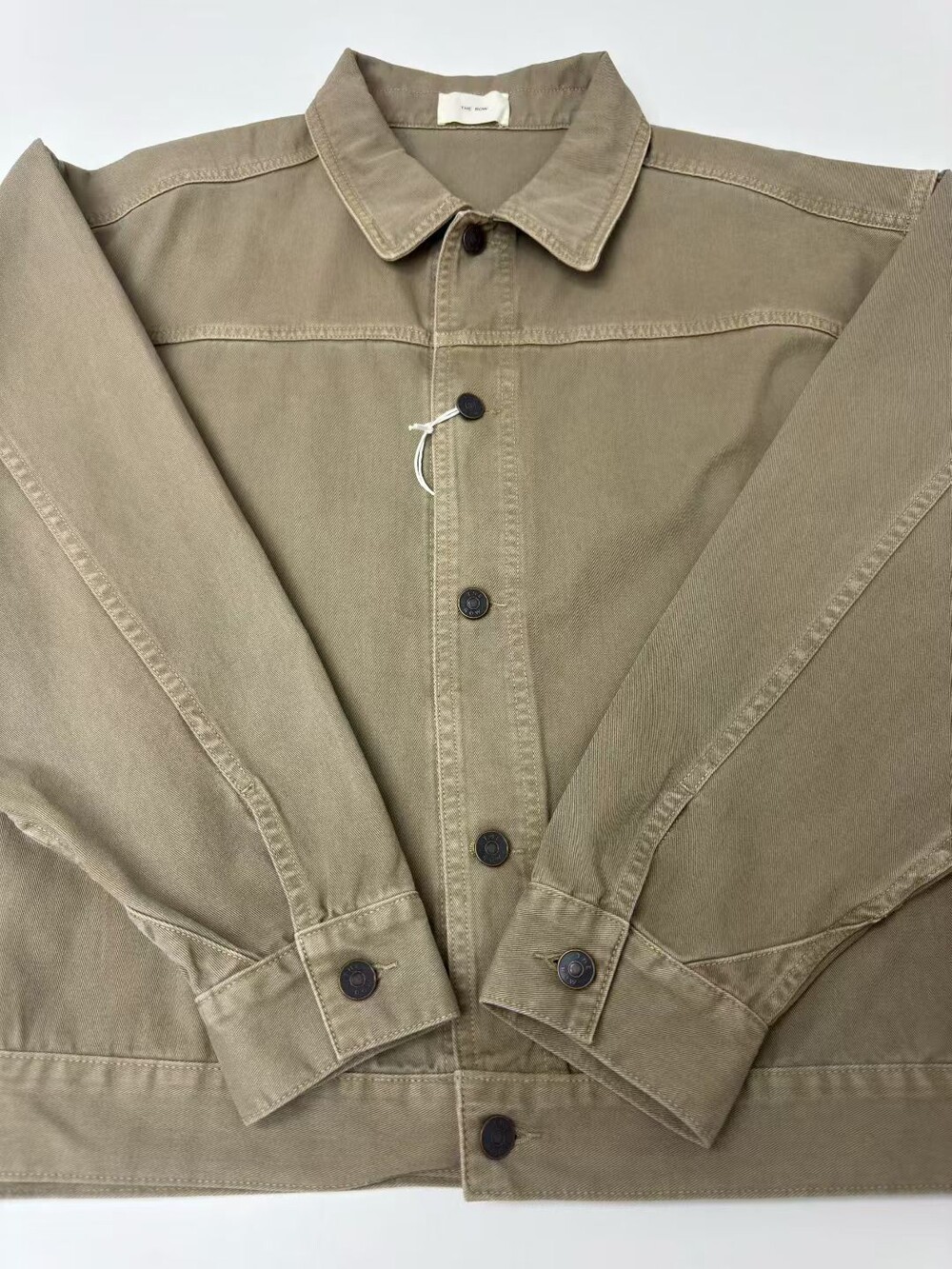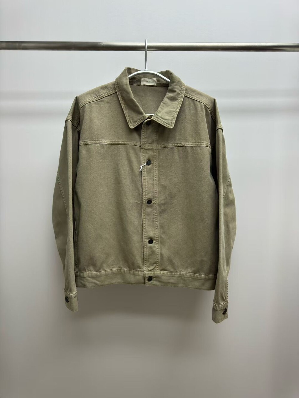 100% 면 소재의 루즈핏 셔츠입니다. 앞면 버튼 여밈 방식이며, 버튼 커프스 디테일이 있습니다.