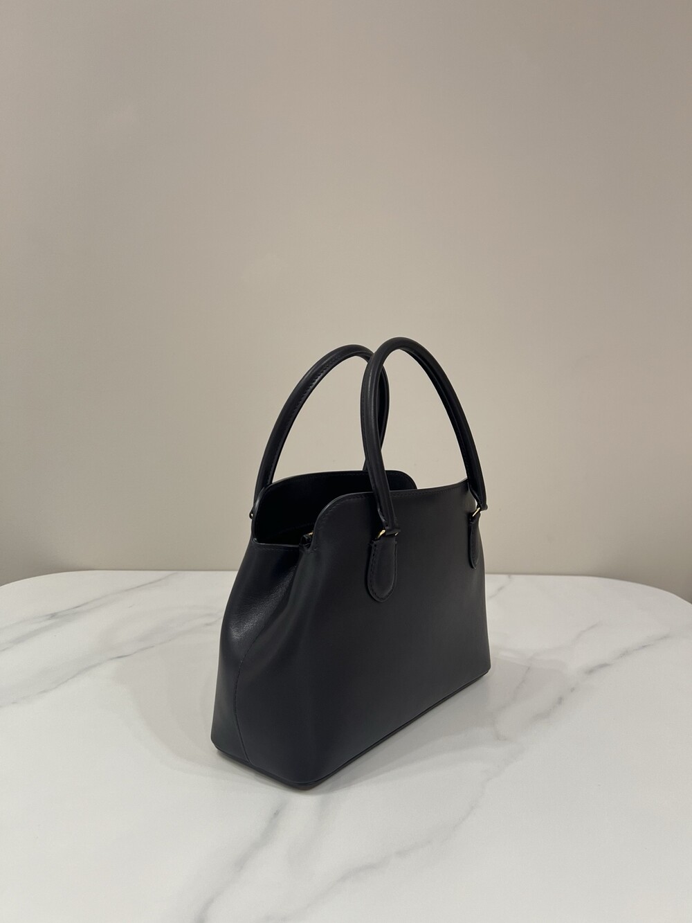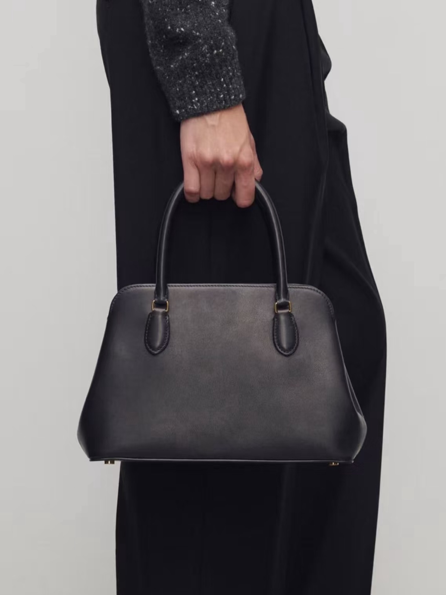 부드러운 곡선의 실루엣, 튜브형 핸들, 맞춤형 금속 하드웨어가 특징인 광택 마감된 새들 가죽 소재의 탑 핸들 백. 내부 수납 공간 3개와 내부 지퍼 포켓 1개를 갖춘 콤팩트한 구조가 세련된 아름다움와 기능성을 모두 제공합니다. 가공하지 않고 드럼 염색한 가죽은 시간이 지나고 사용할수록 독특한 개성을 얻습니다.