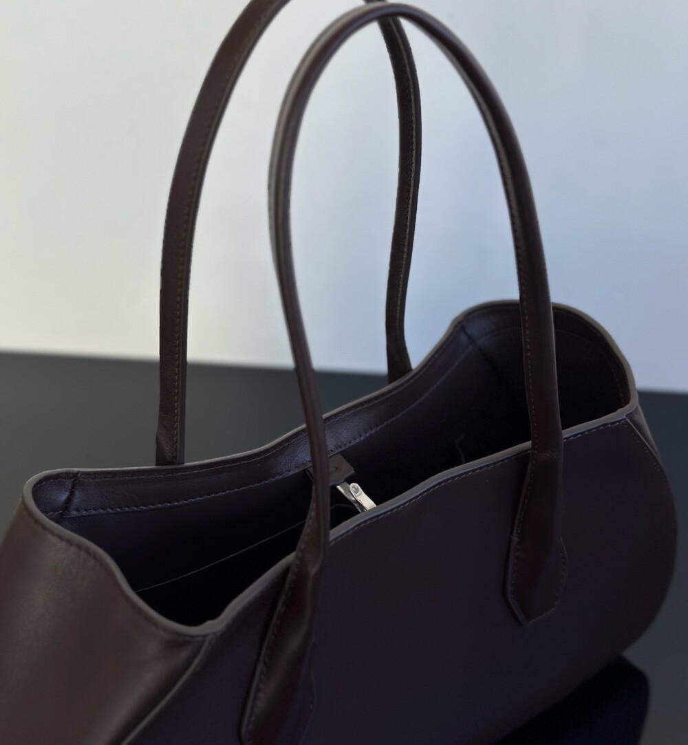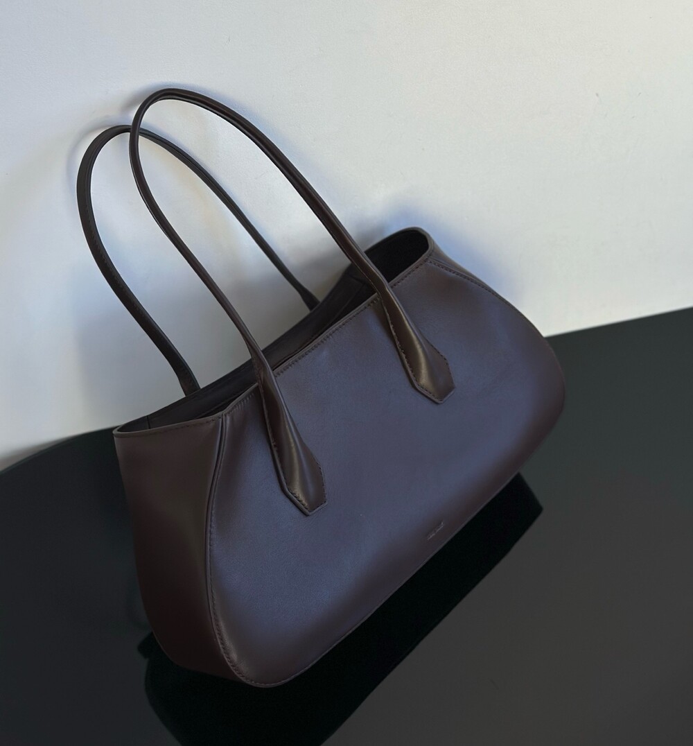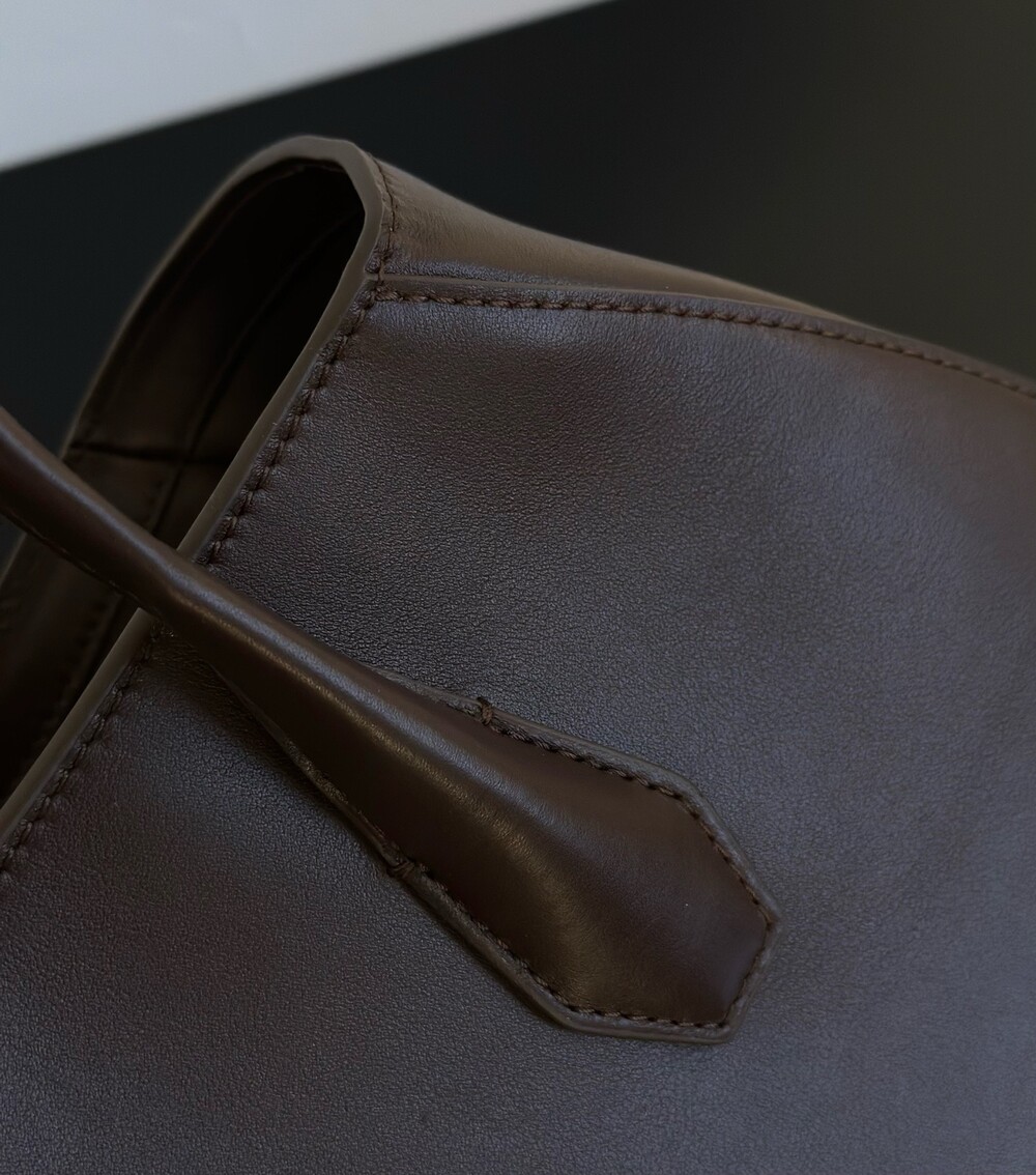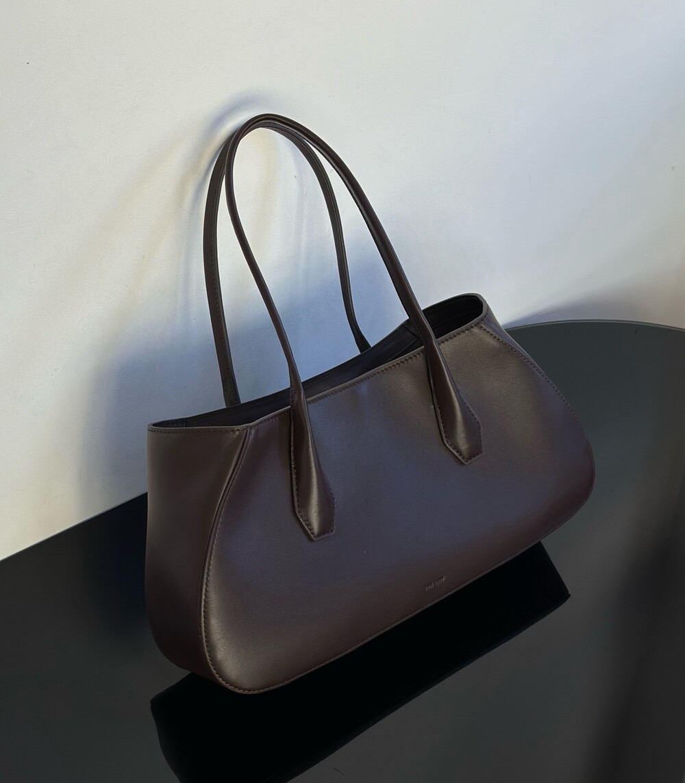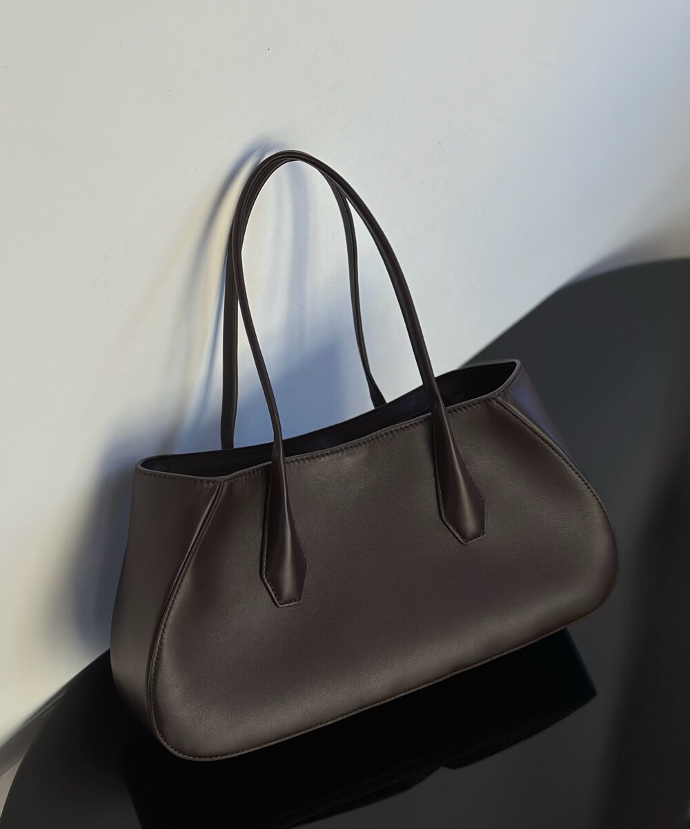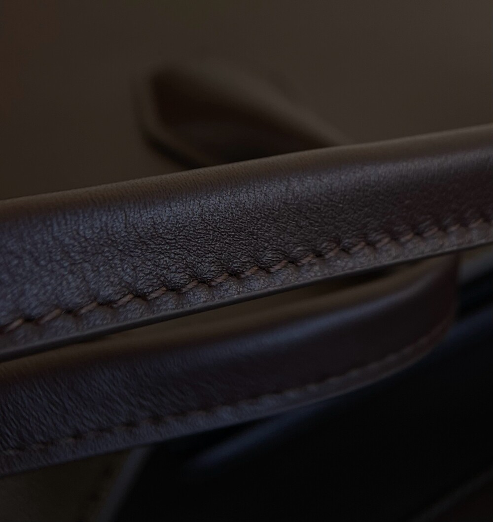광택 있는 새들 가죽 소재에 튜브형 손잡이, 평평한 바닥, 그리고 수작업 스티치 마감이 특징입니다.