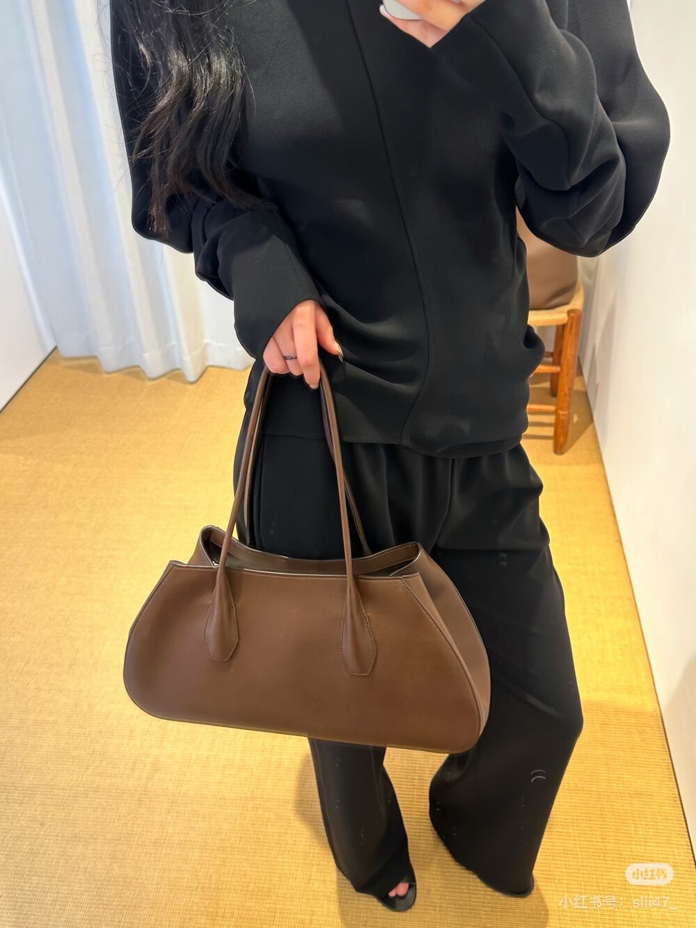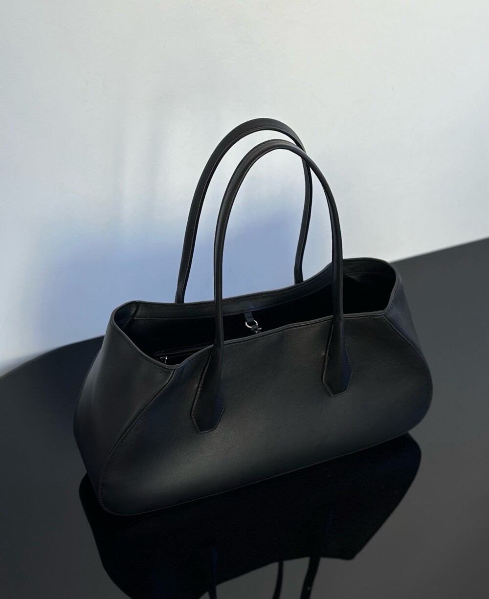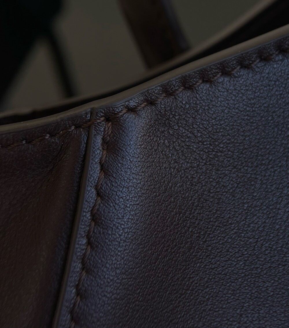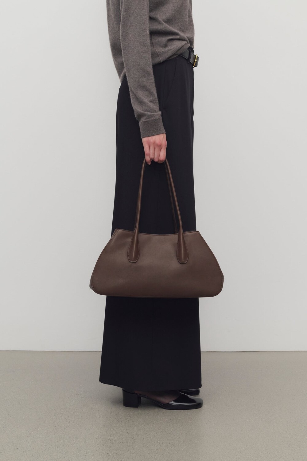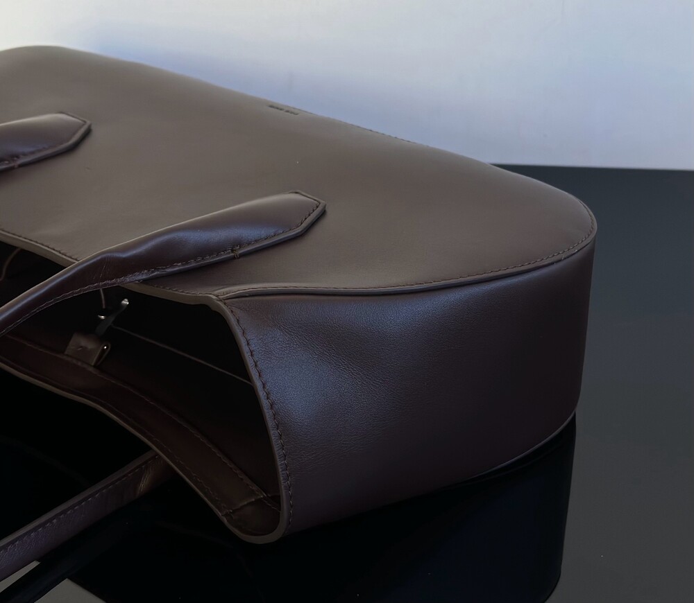 광택 있는 새들 가죽 소재에 튜브형 손잡이, 평평한 바닥, 그리고 수작업 스티치 마감이 특징입니다.