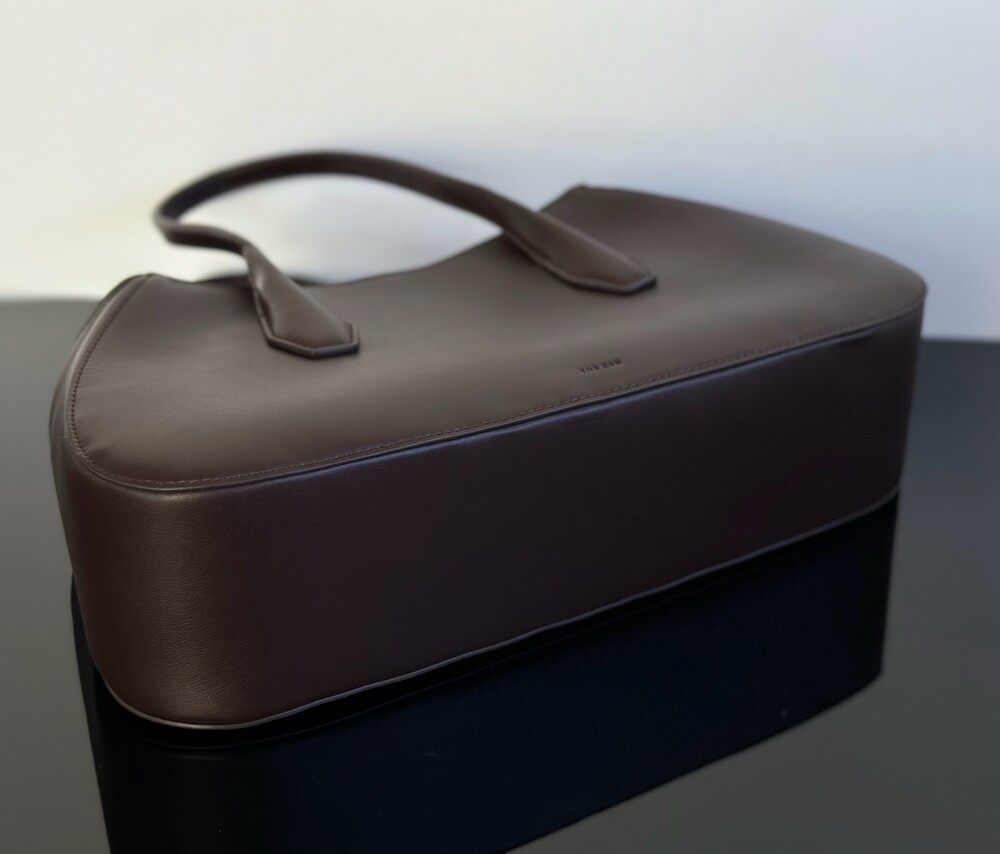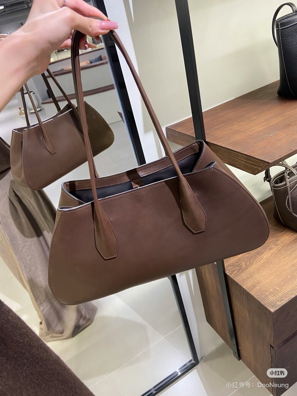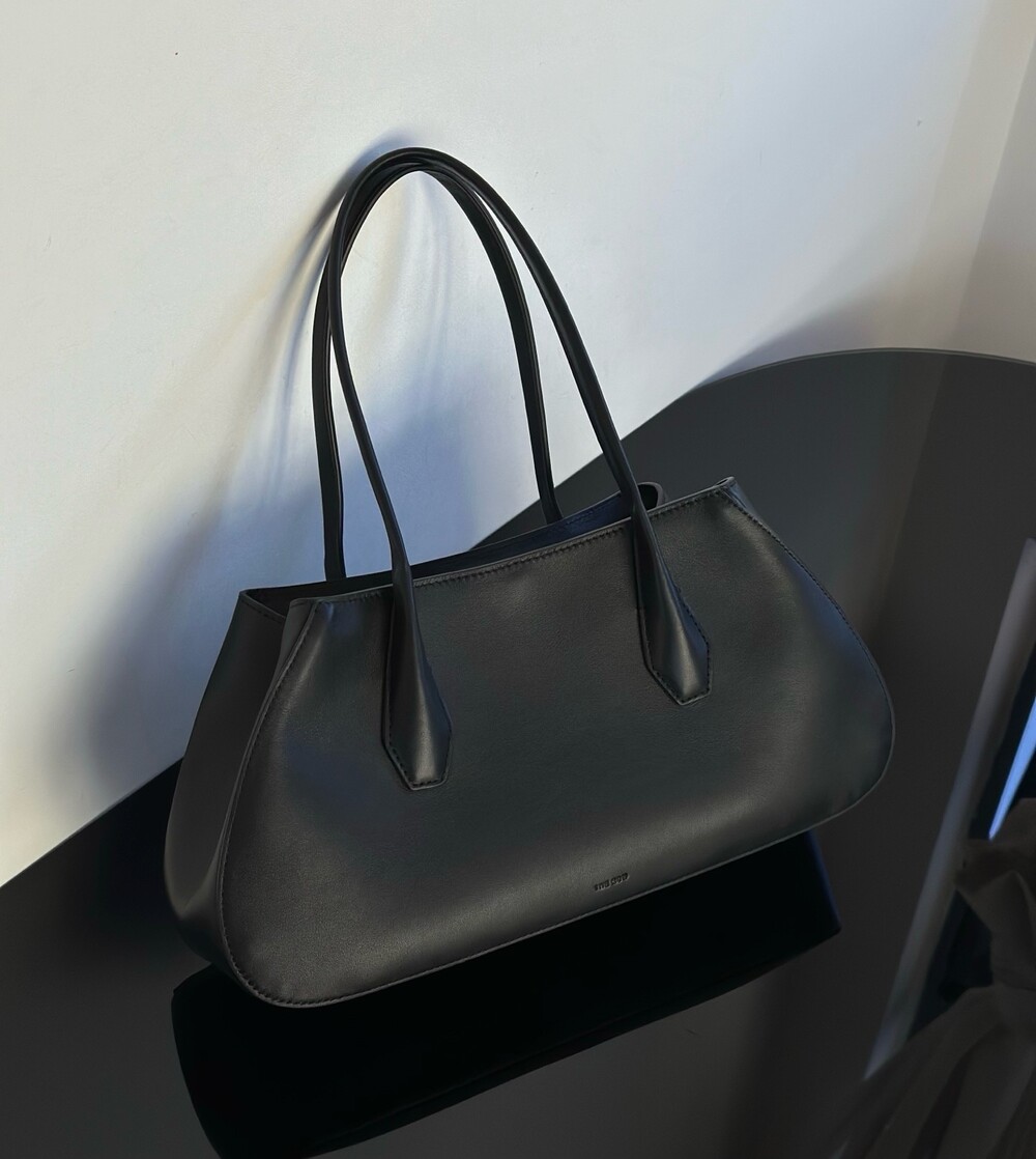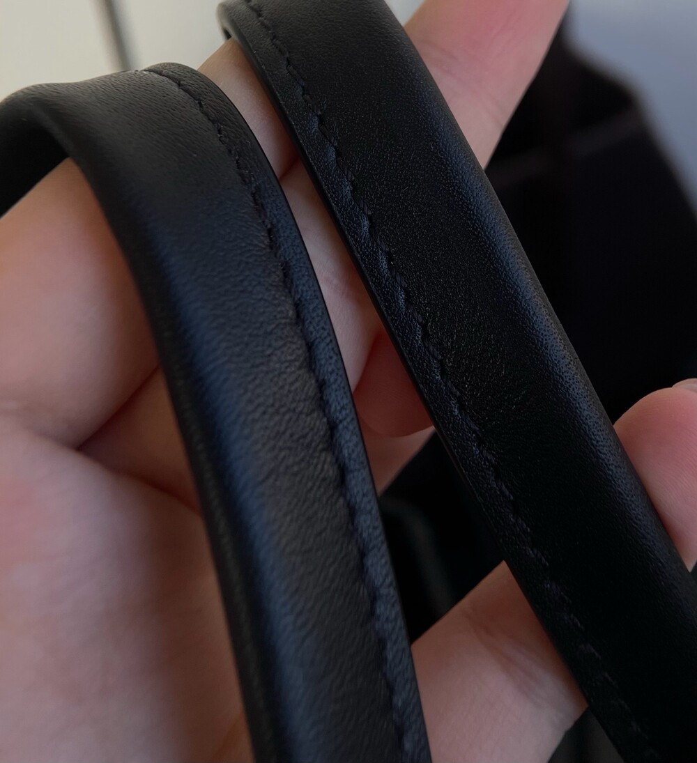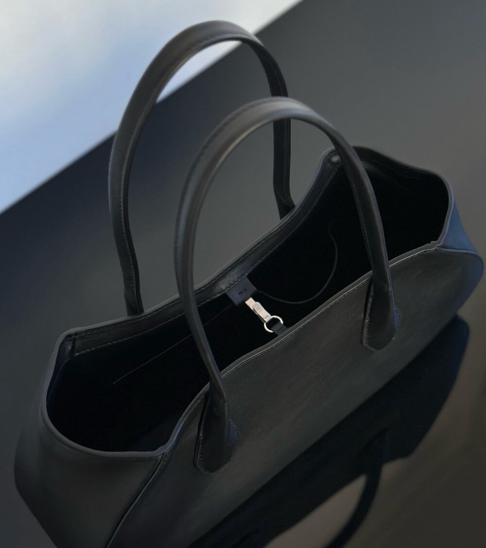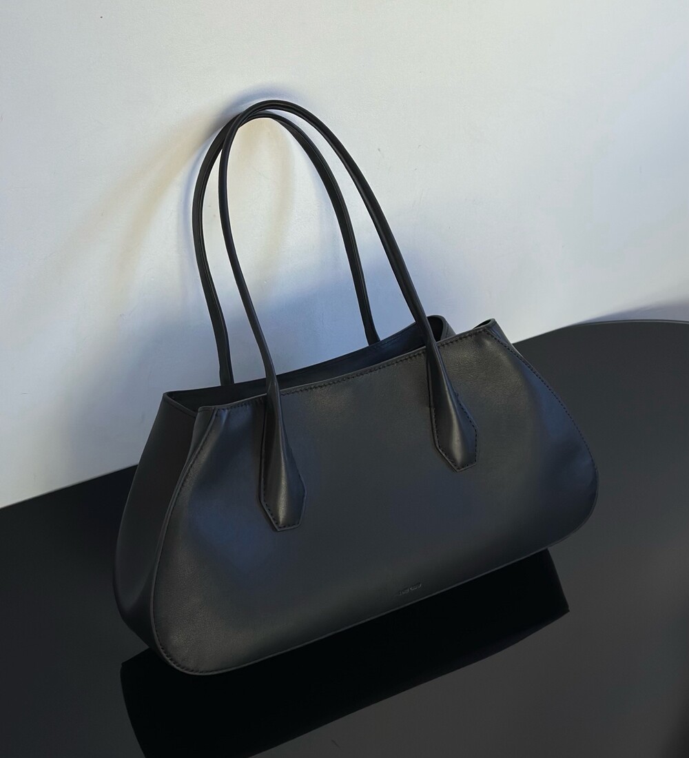 광택 있는 새들 가죽 소재에 튜브형 손잡이, 평평한 바닥, 그리고 수작업 스티치 마감이 특징입니다.