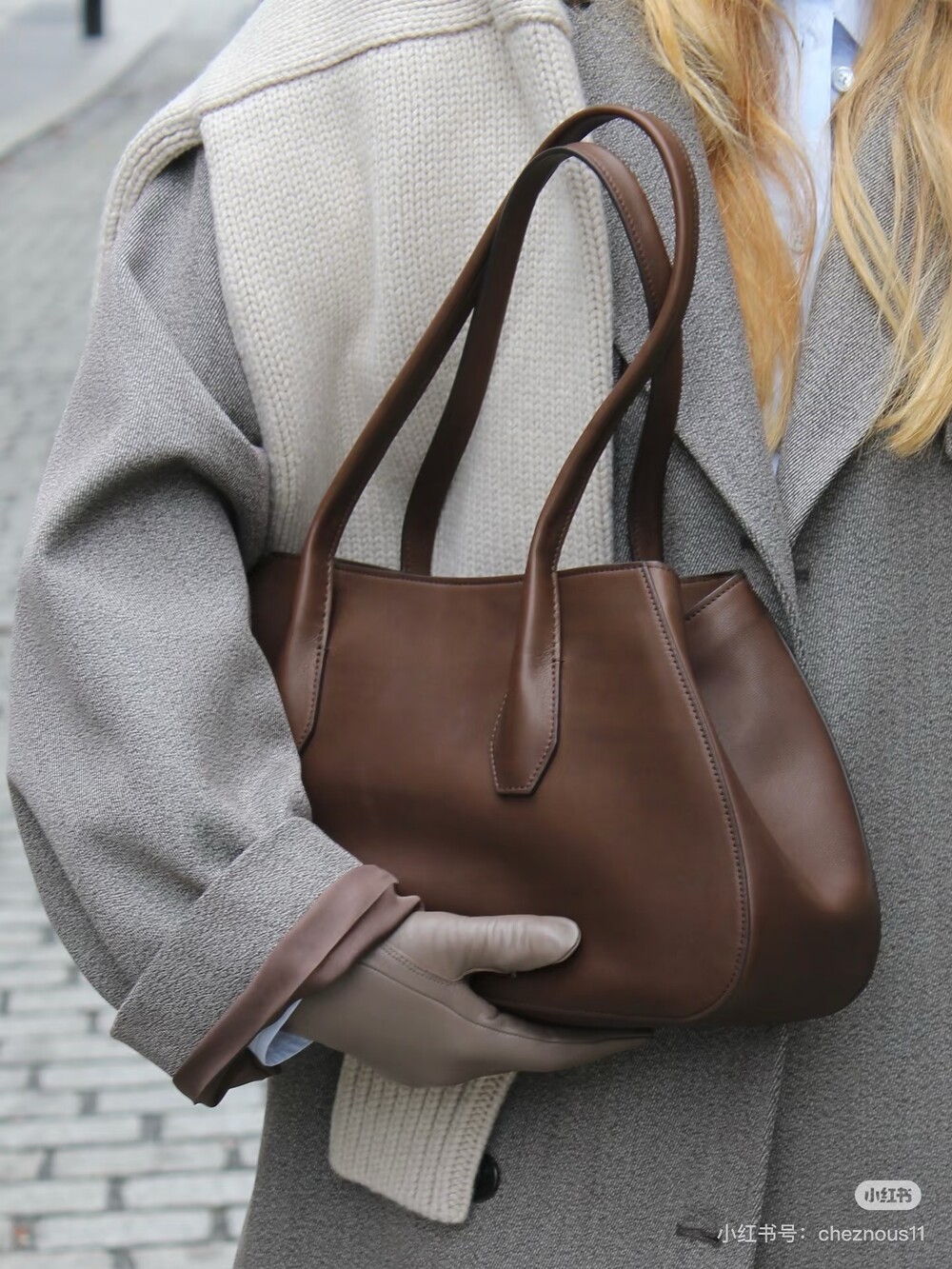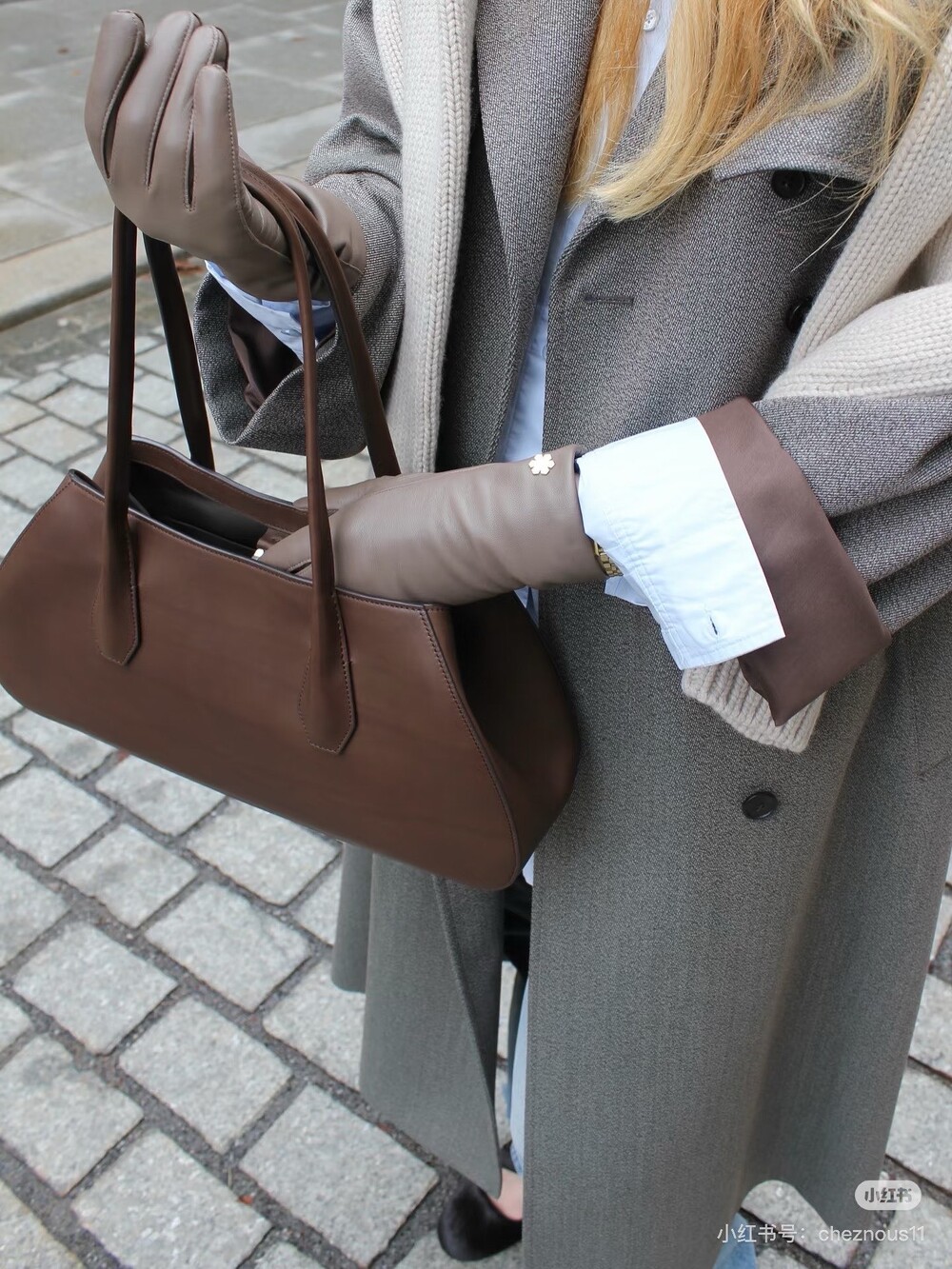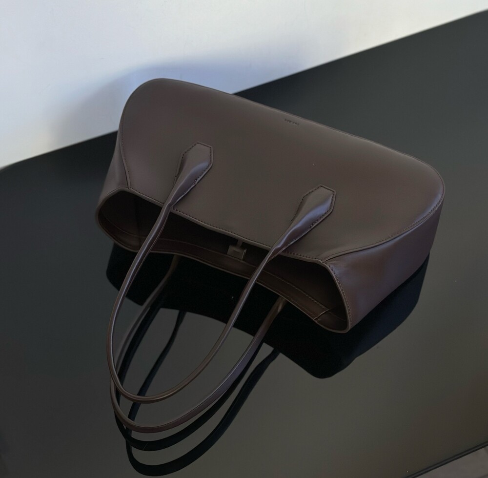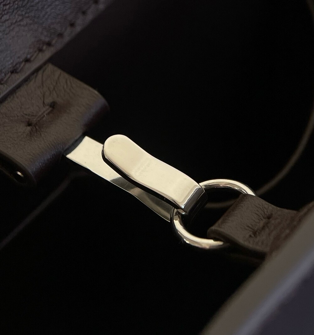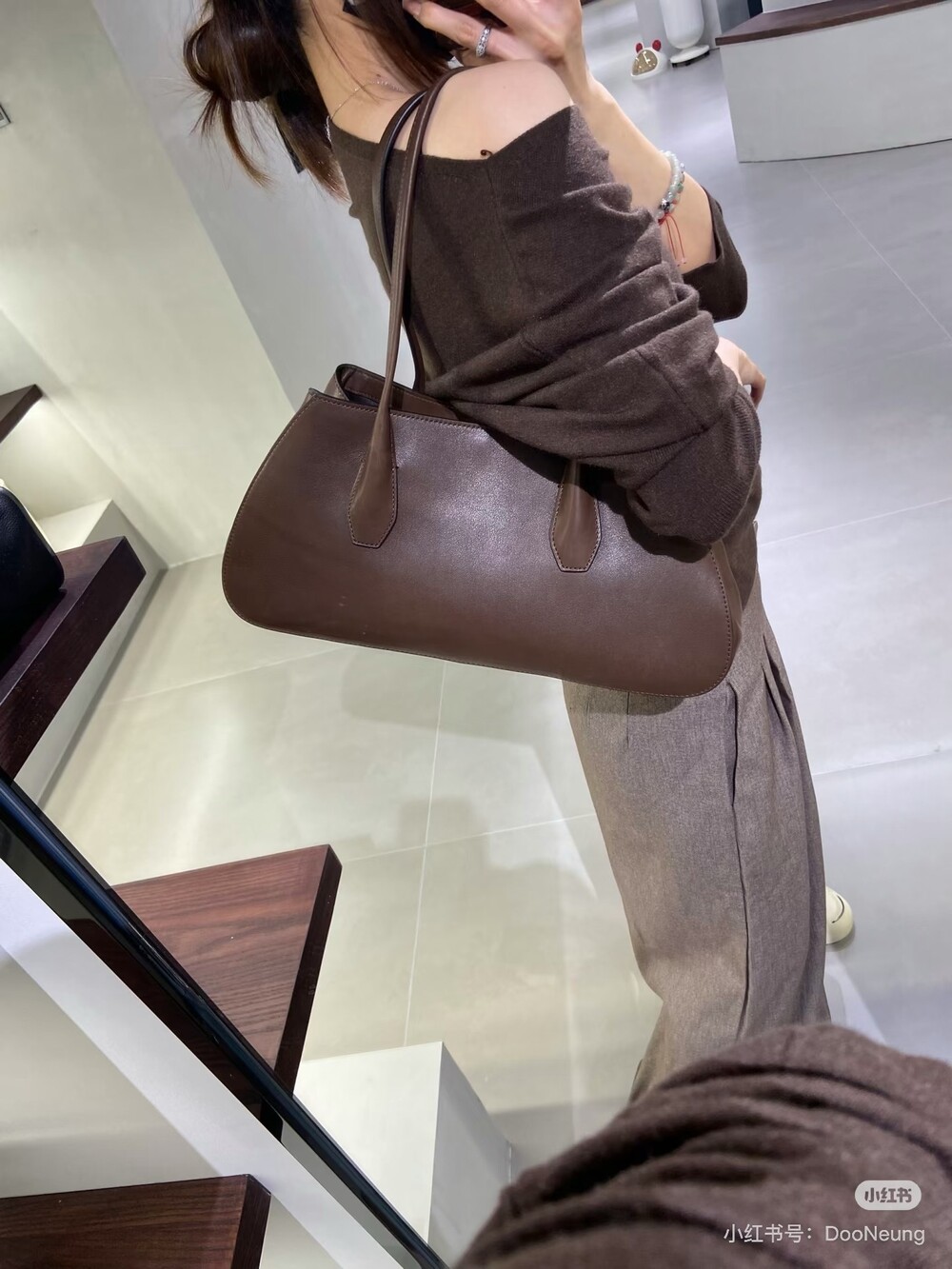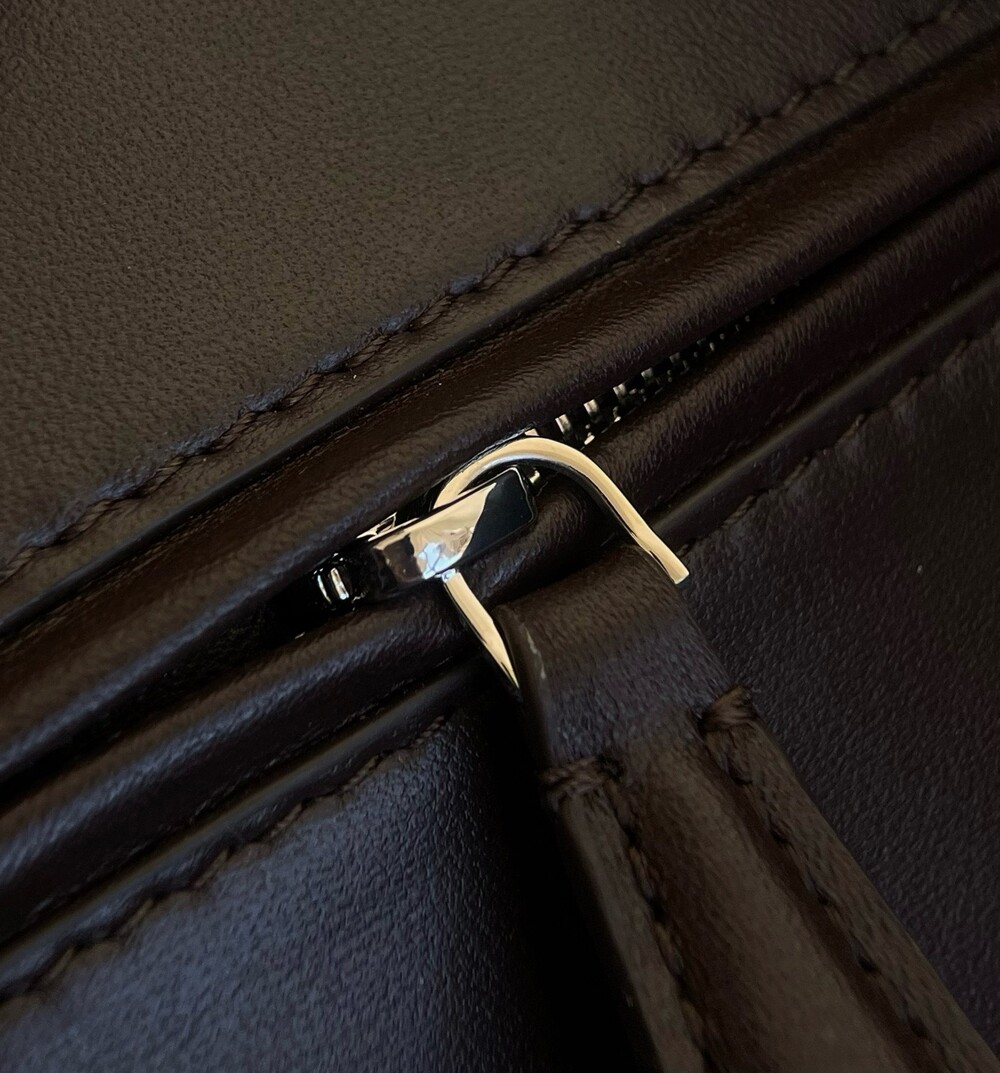광택 있는 새들 가죽 소재에 튜브형 손잡이, 평평한 바닥, 그리고 수작업 스티치 마감이 특징입니다.