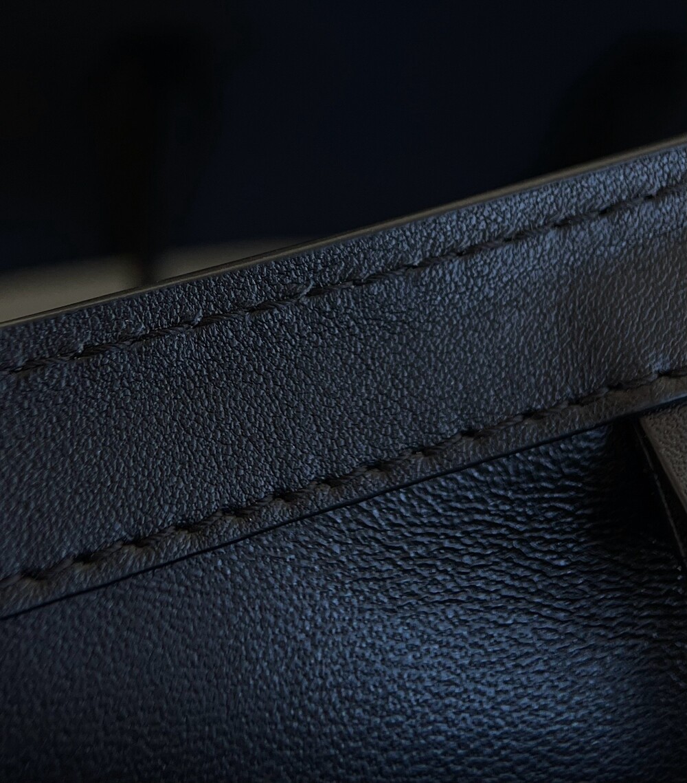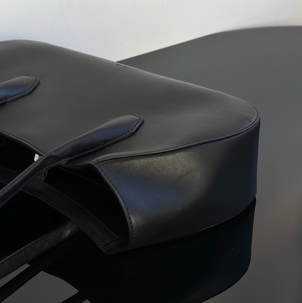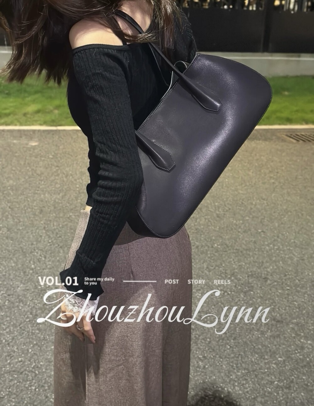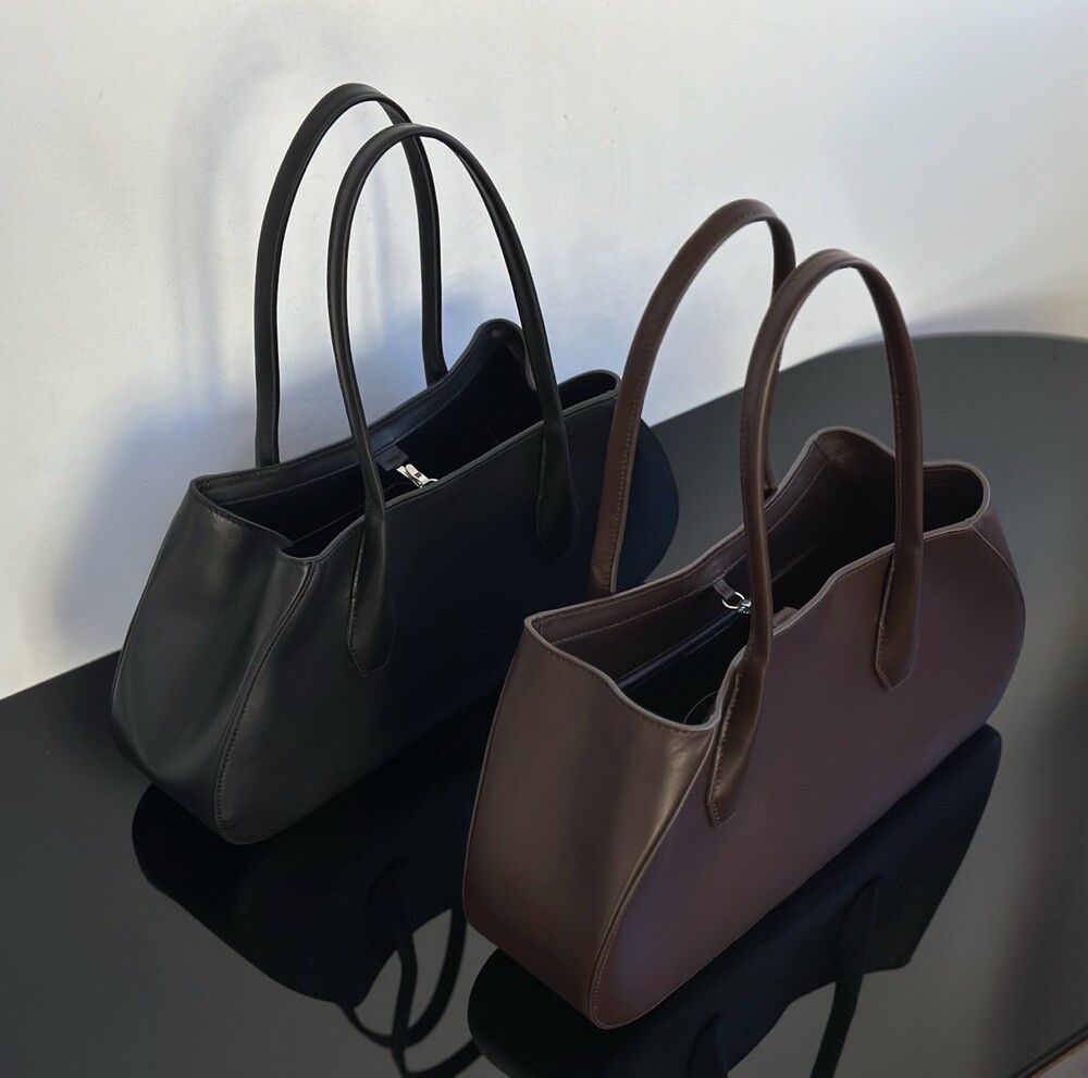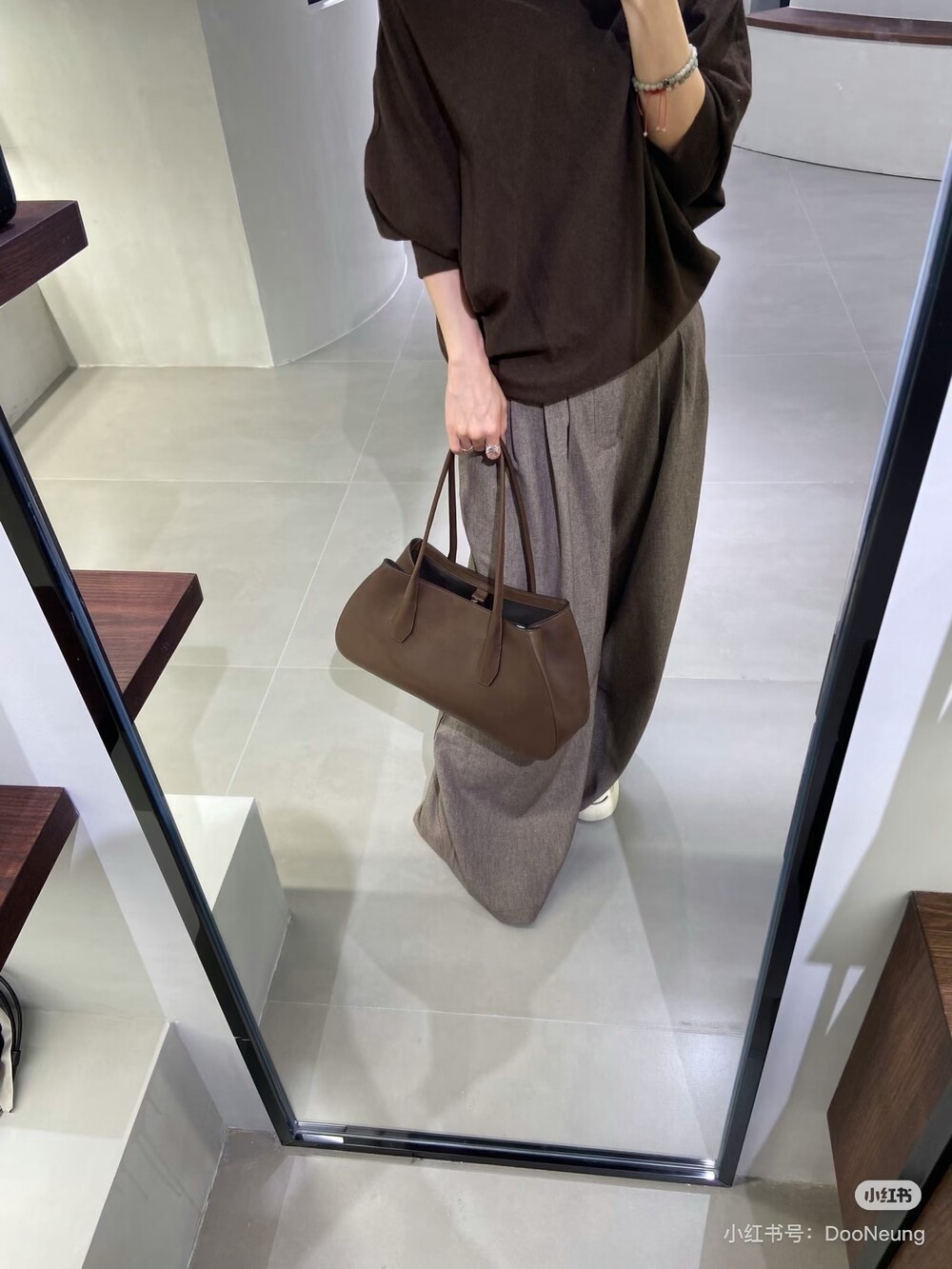 광택 있는 새들 가죽 소재에 튜브형 손잡이, 평평한 바닥, 그리고 수작업 스티치 마감이 특징입니다.