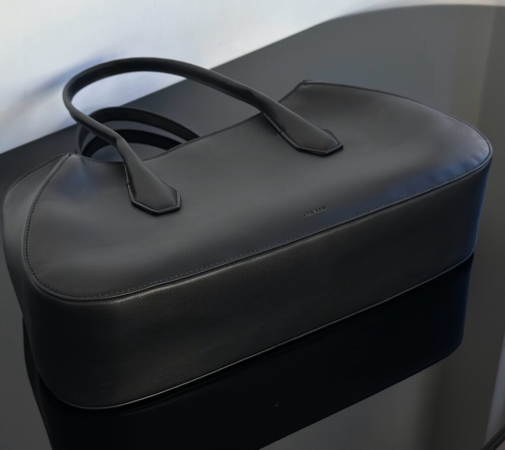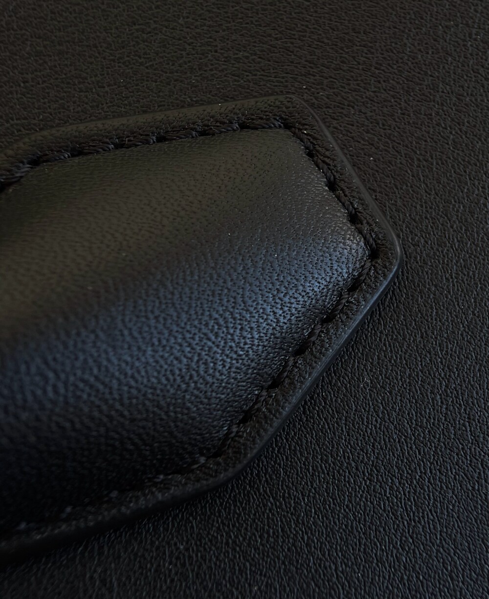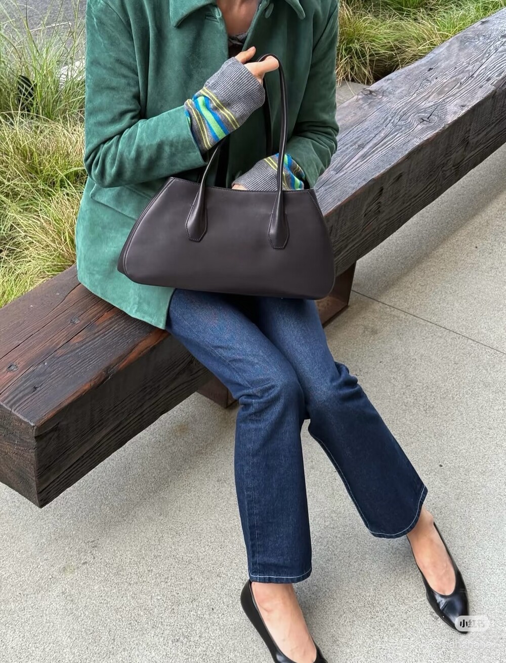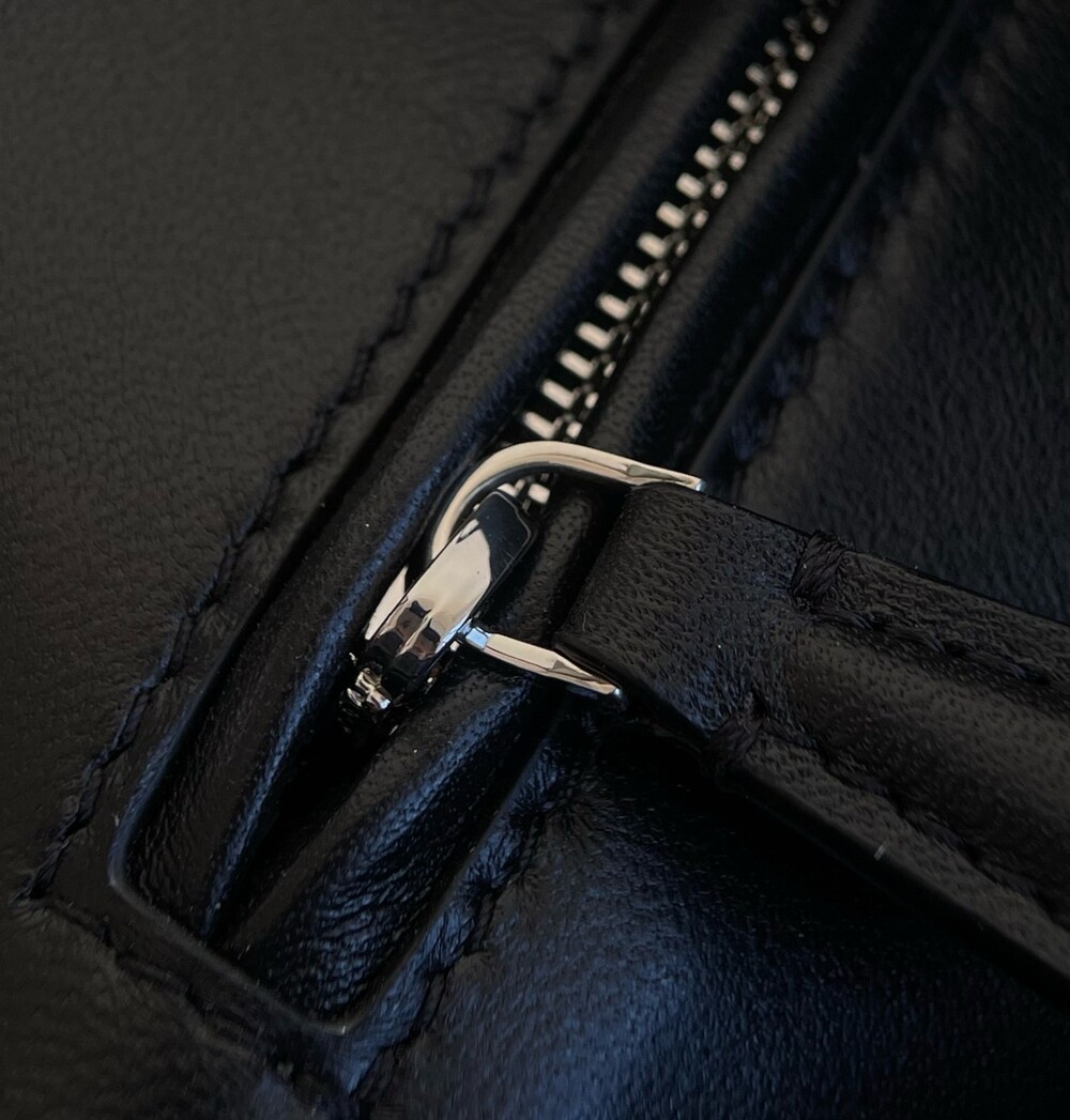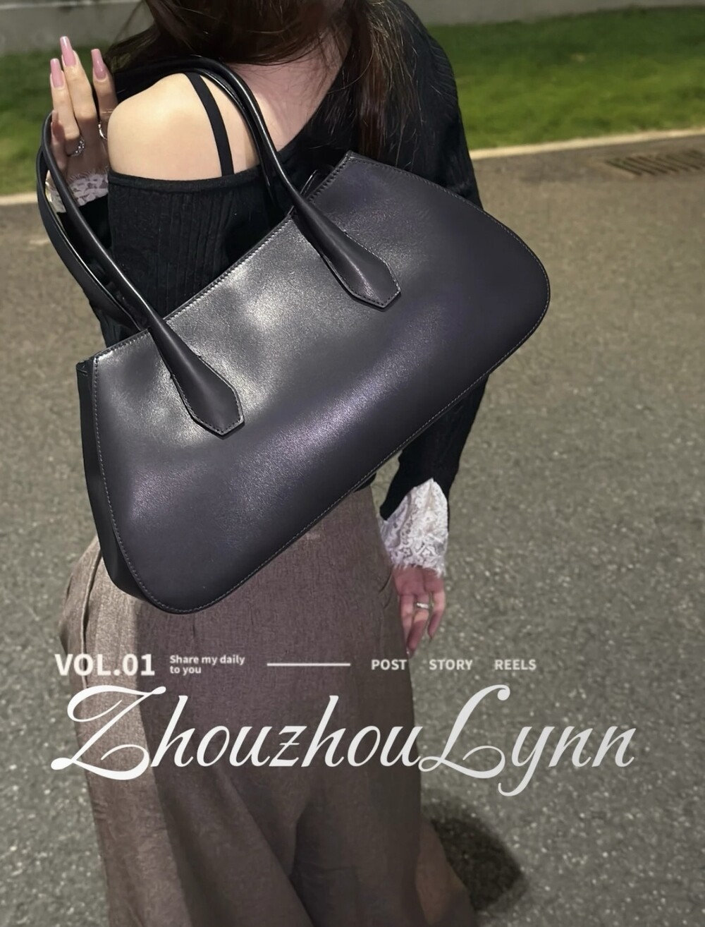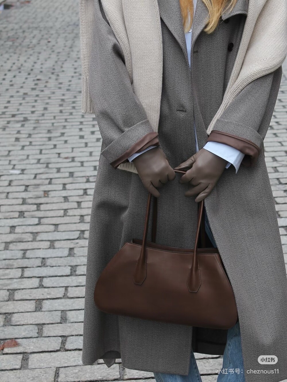 광택 있는 새들 가죽 소재에 튜브형 손잡이, 평평한 바닥, 그리고 수작업 스티치 마감이 특징입니다.