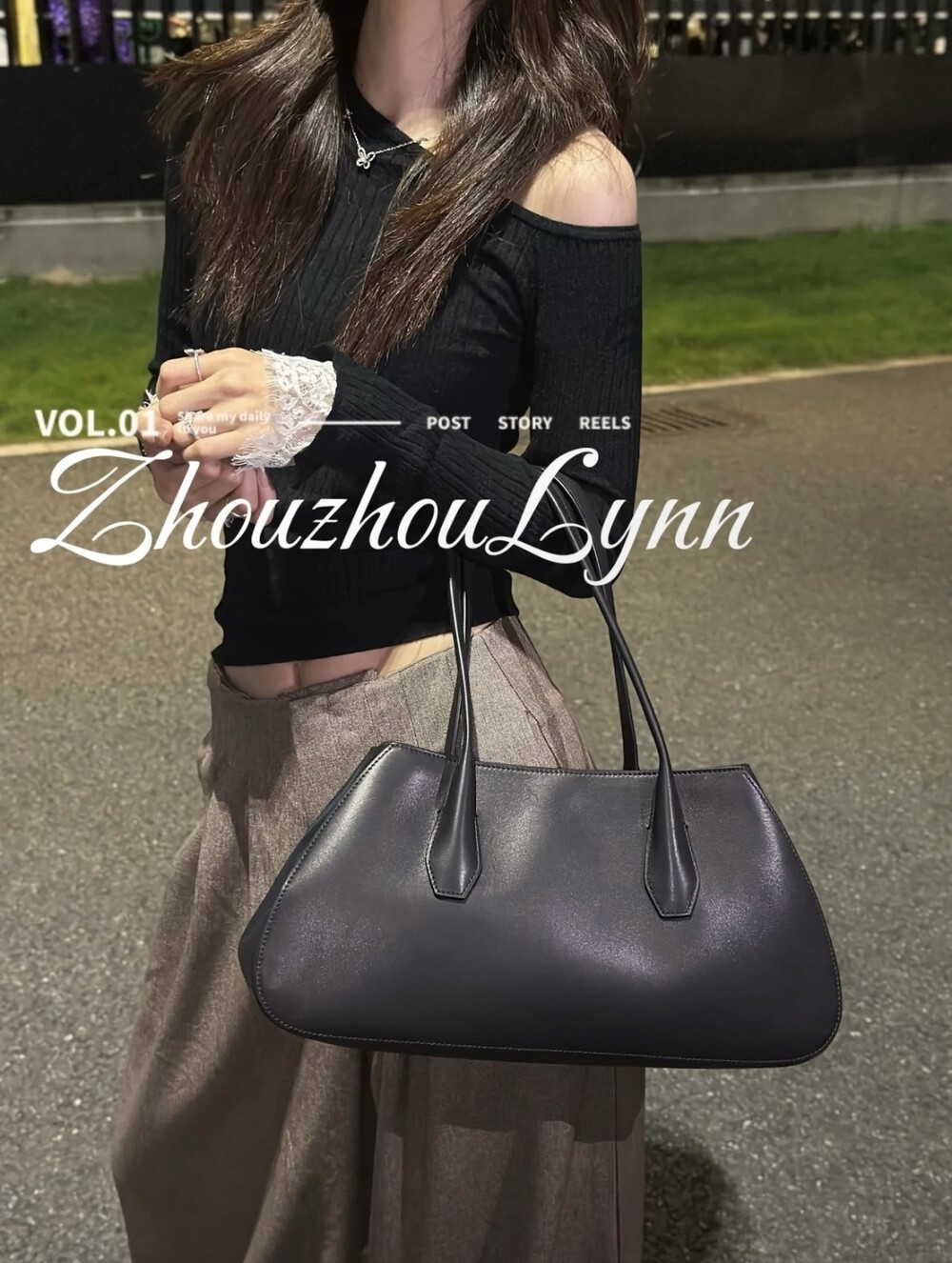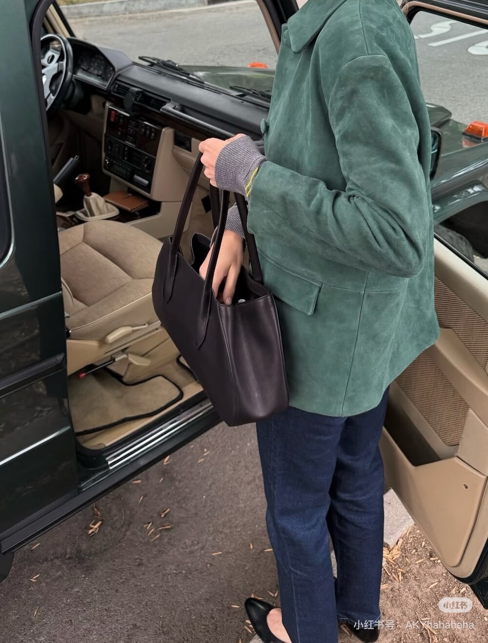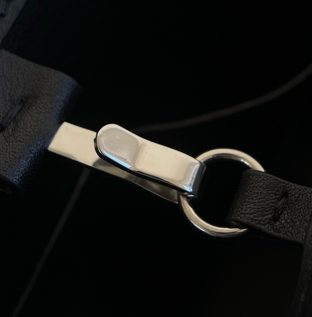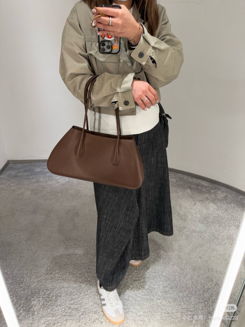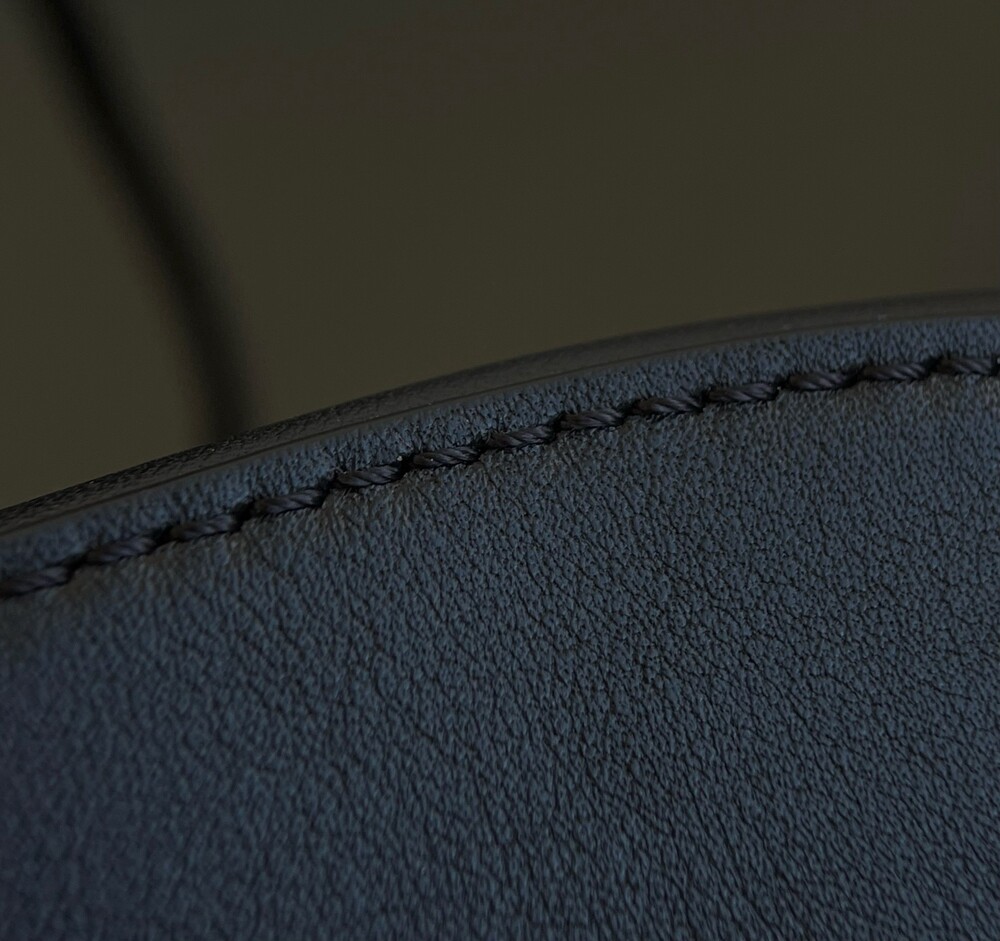 광택 있는 새들 가죽 소재에 튜브형 손잡이, 평평한 바닥, 그리고 수작업 스티치 마감이 특징입니다.