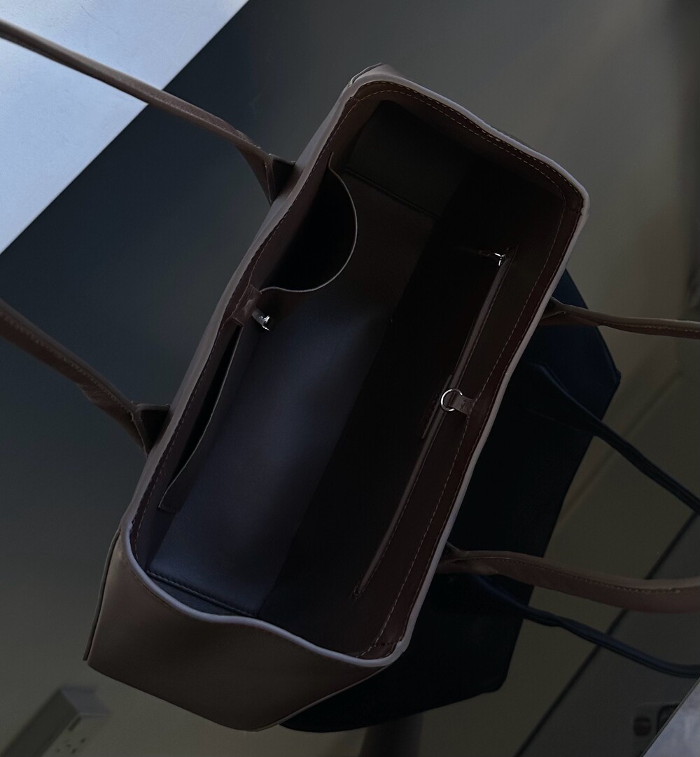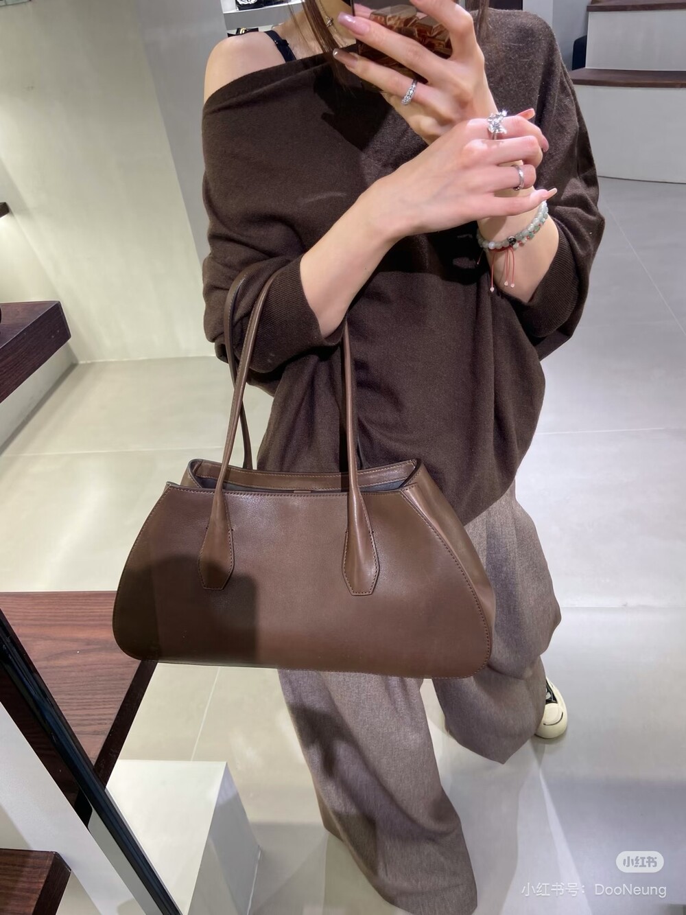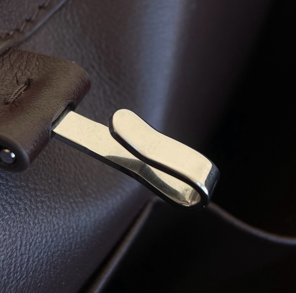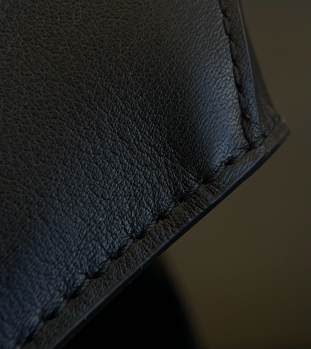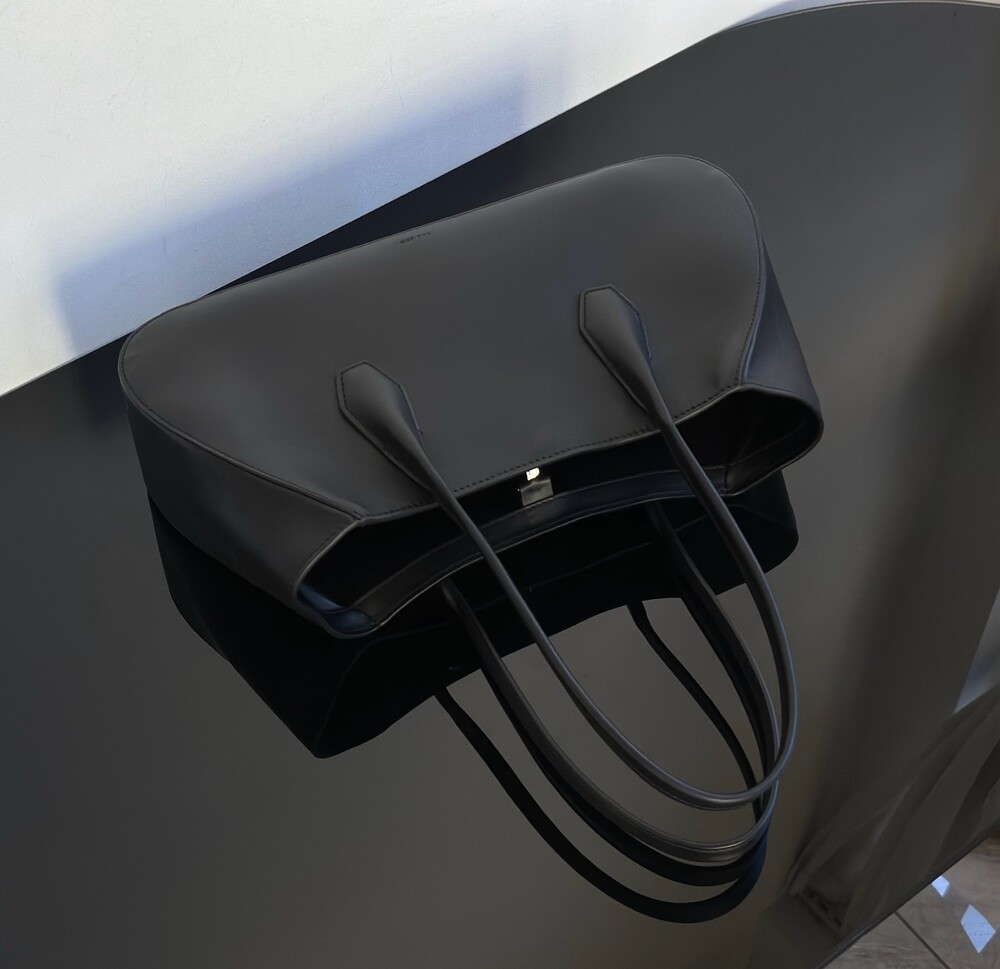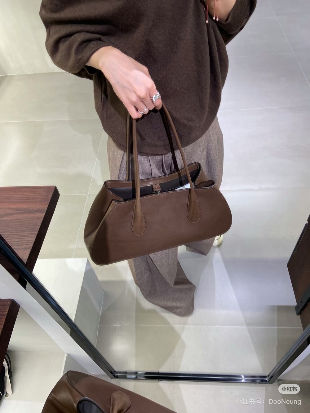 광택 있는 새들 가죽 소재에 튜브형 손잡이, 평평한 바닥, 그리고 수작업 스티치 마감이 특징입니다.
