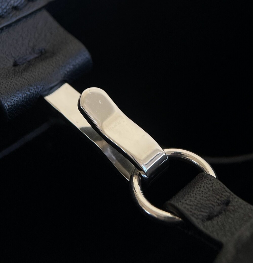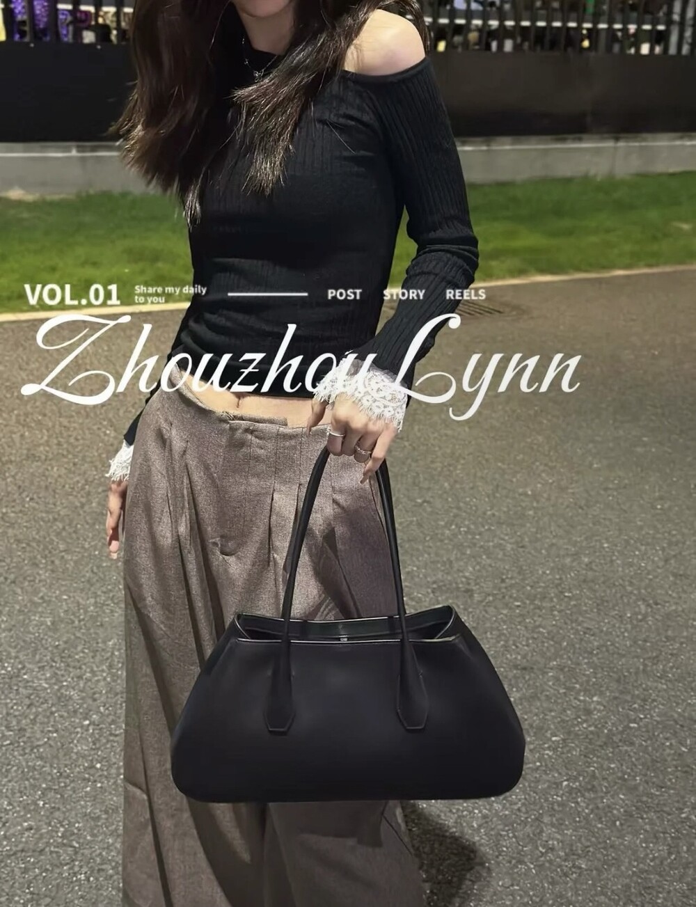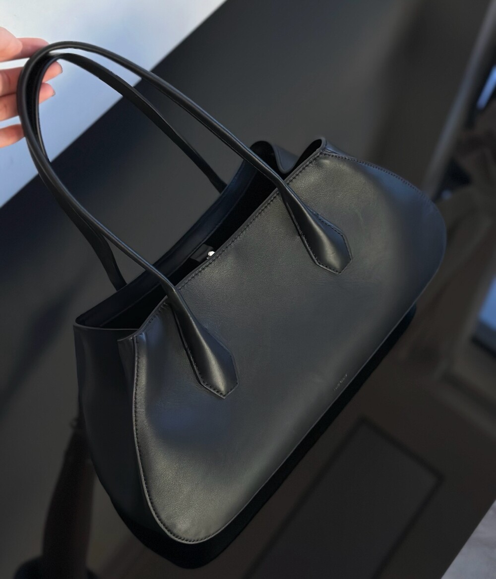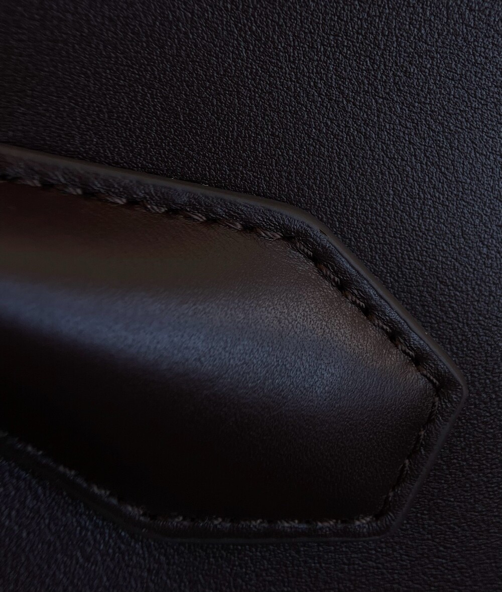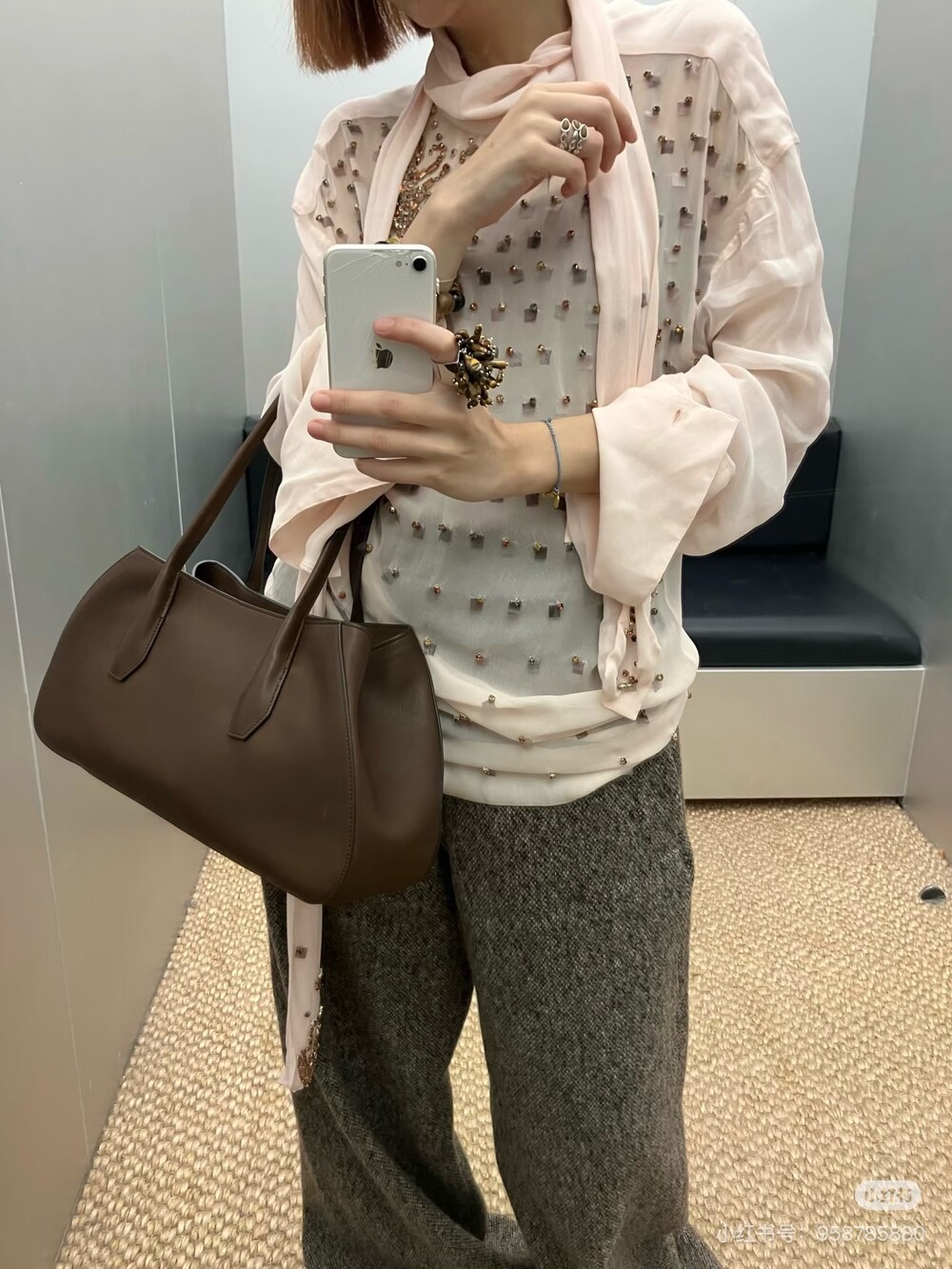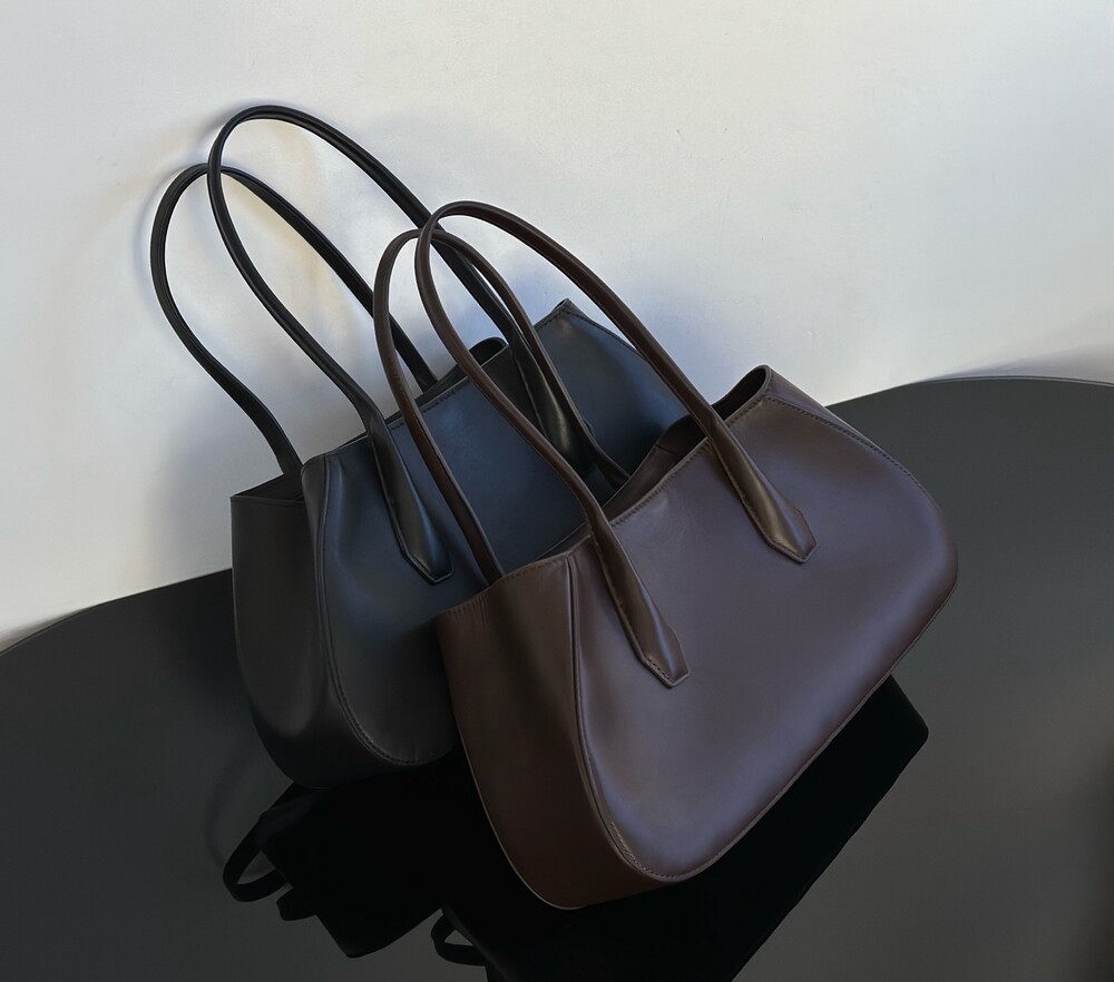 광택 있는 새들 가죽 소재에 튜브형 손잡이, 평평한 바닥, 그리고 수작업 스티치 마감이 특징입니다.