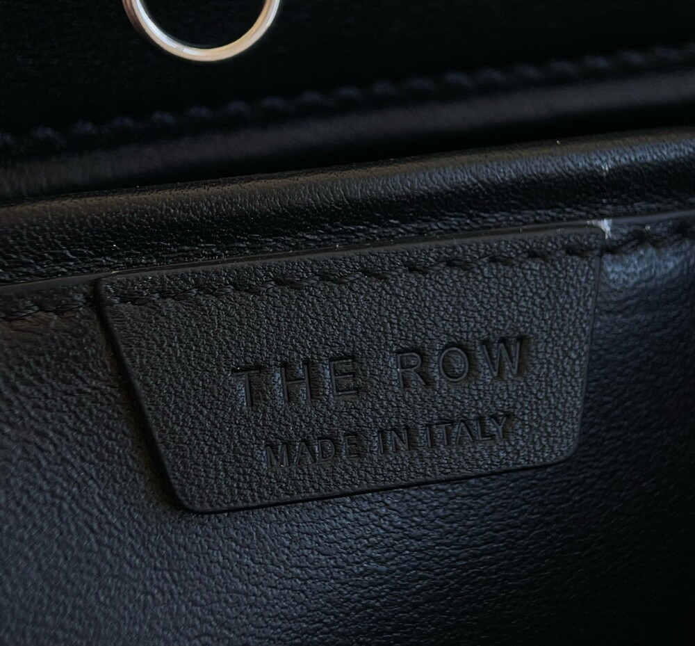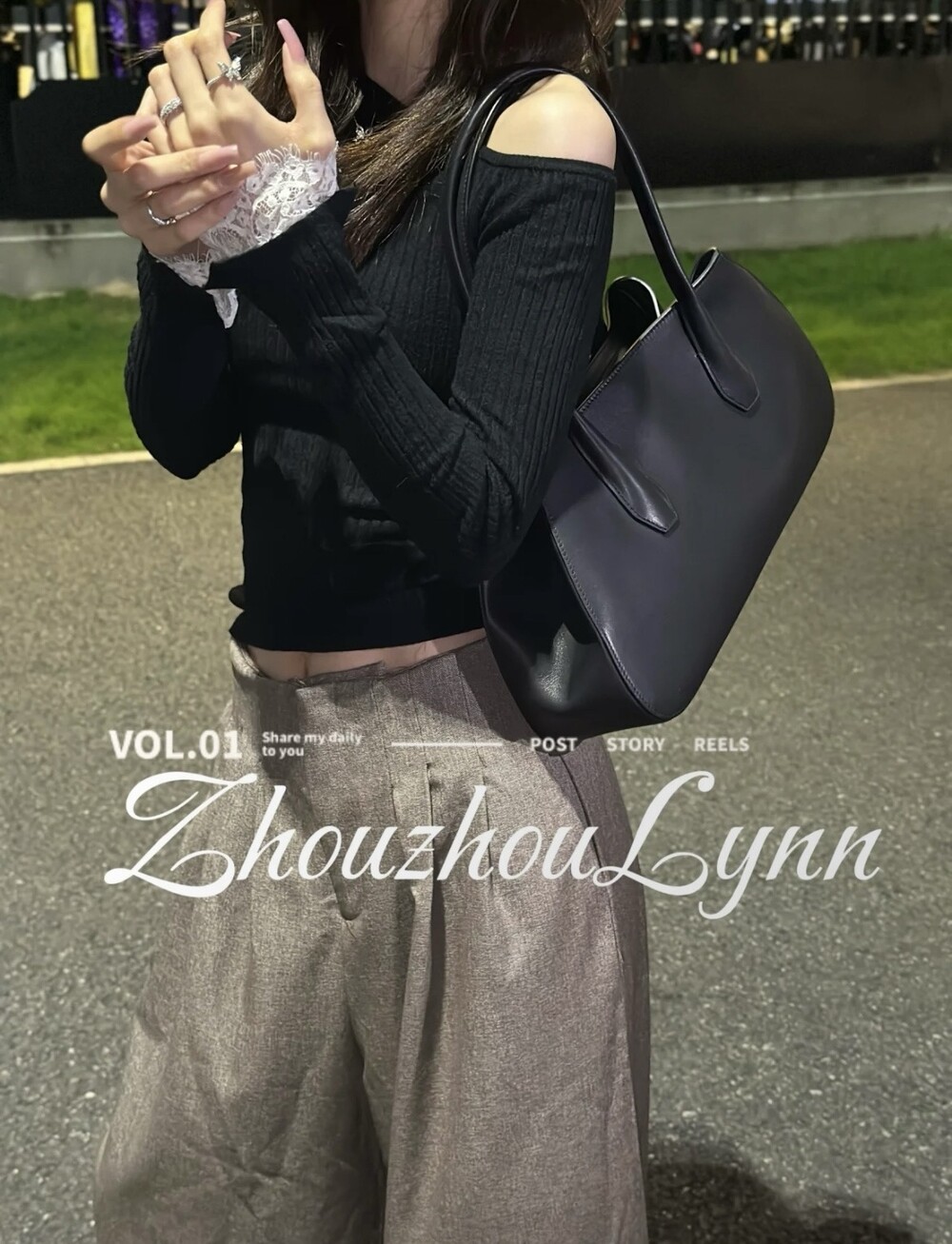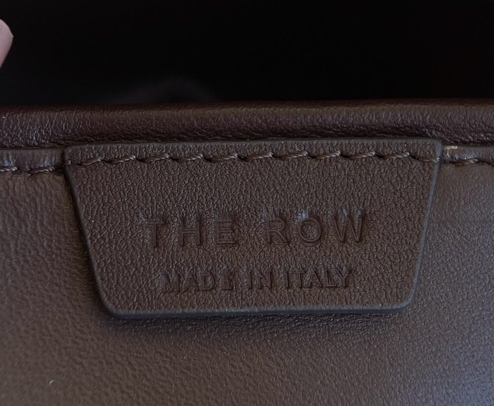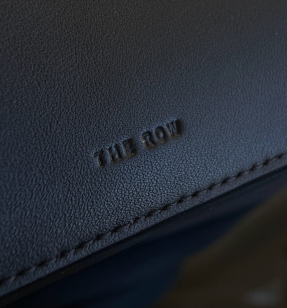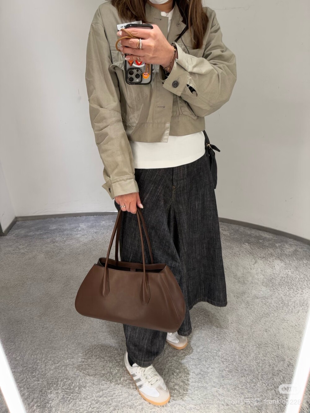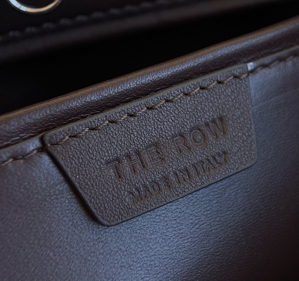 광택 있는 새들 가죽 소재에 튜브형 손잡이, 평평한 바닥, 그리고 수작업 스티치 마감이 특징입니다.