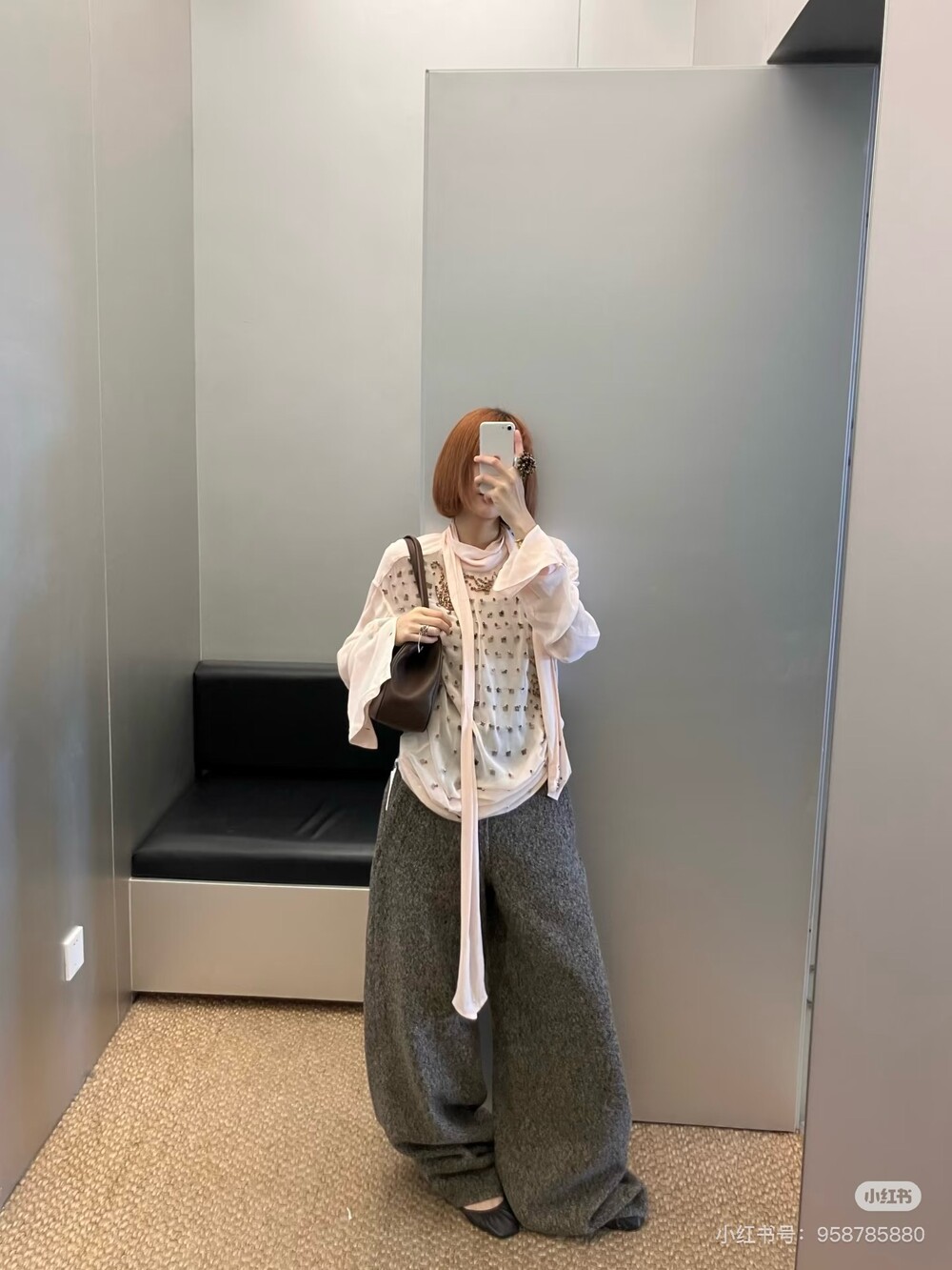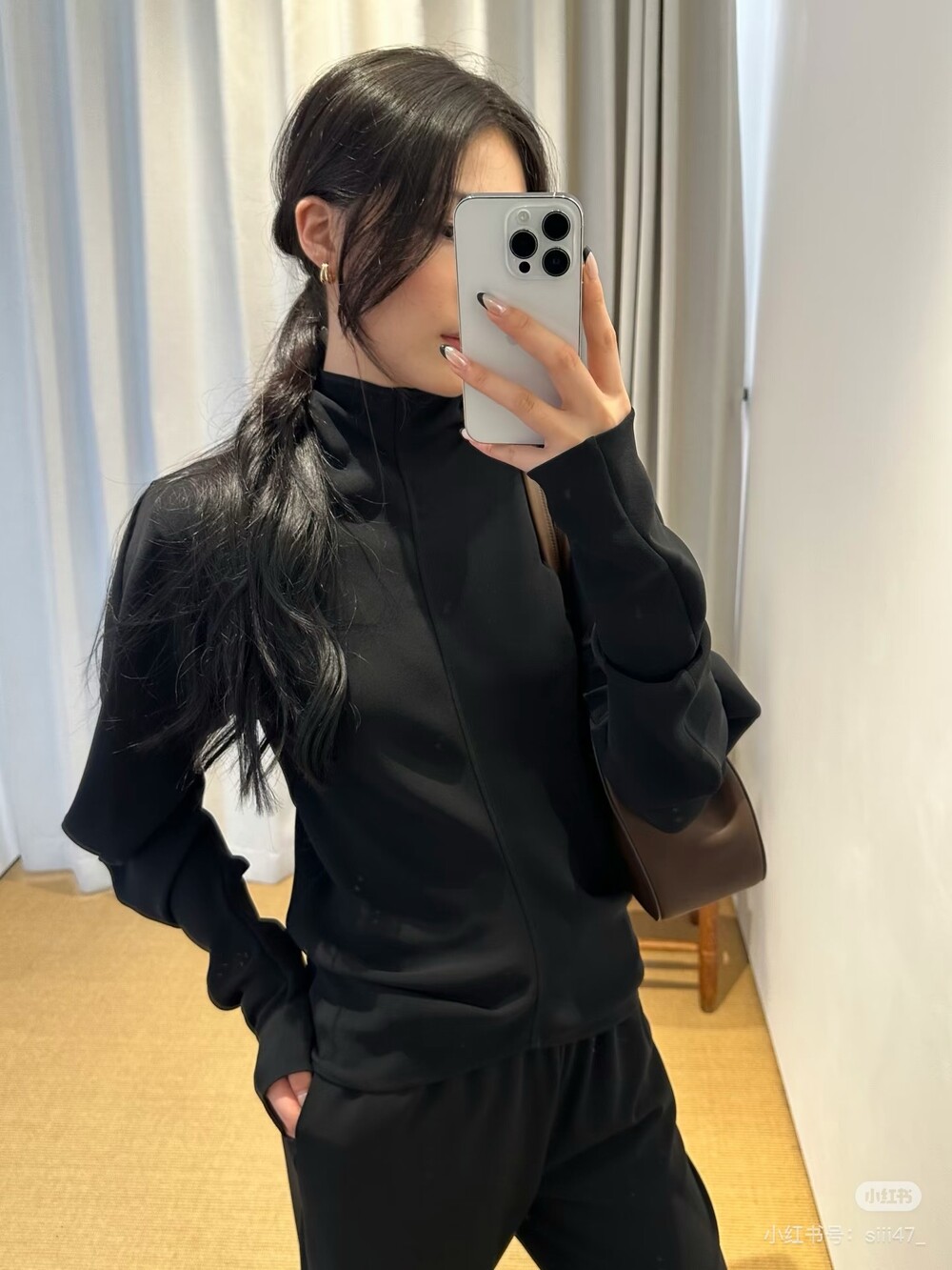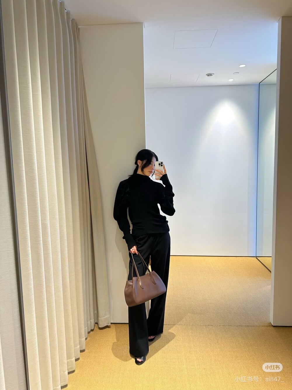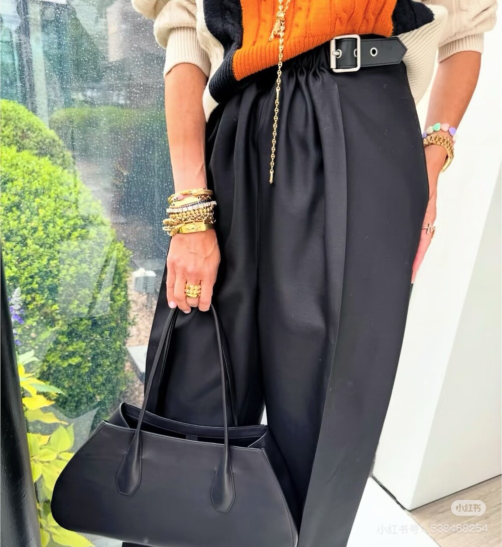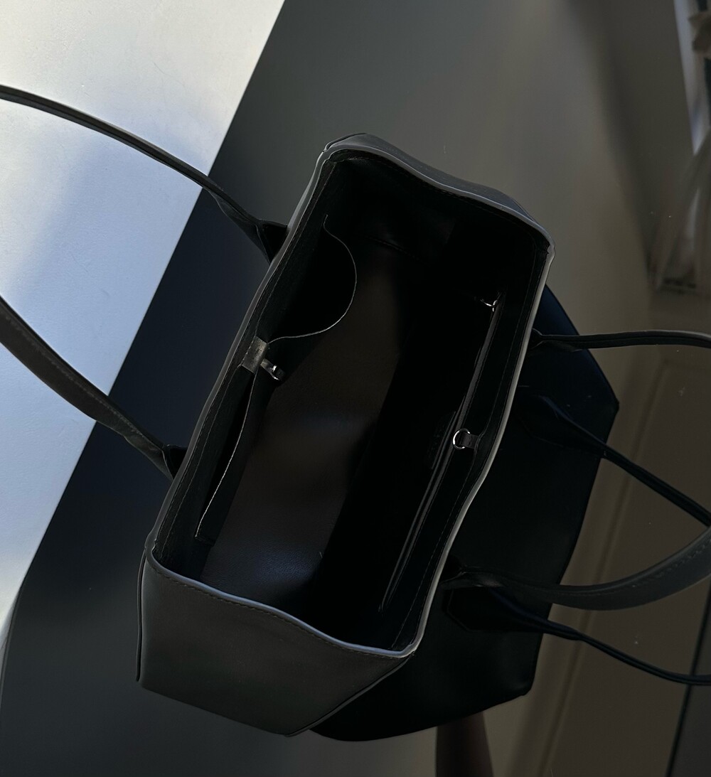 광택 있는 새들 가죽 소재에 튜브형 손잡이, 평평한 바닥, 그리고 수작업 스티치 마감이 특징입니다.