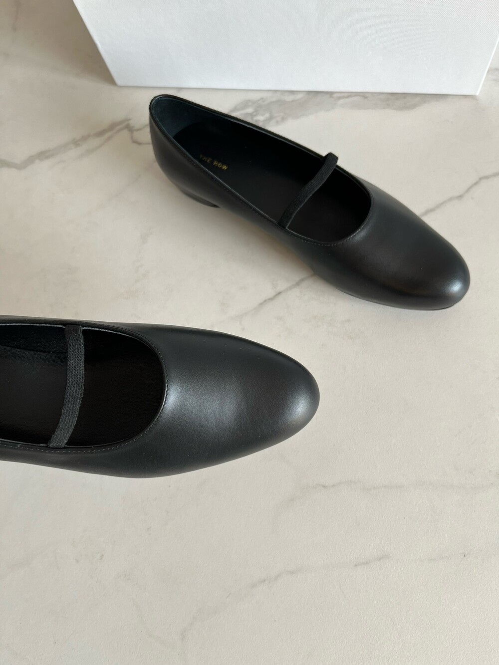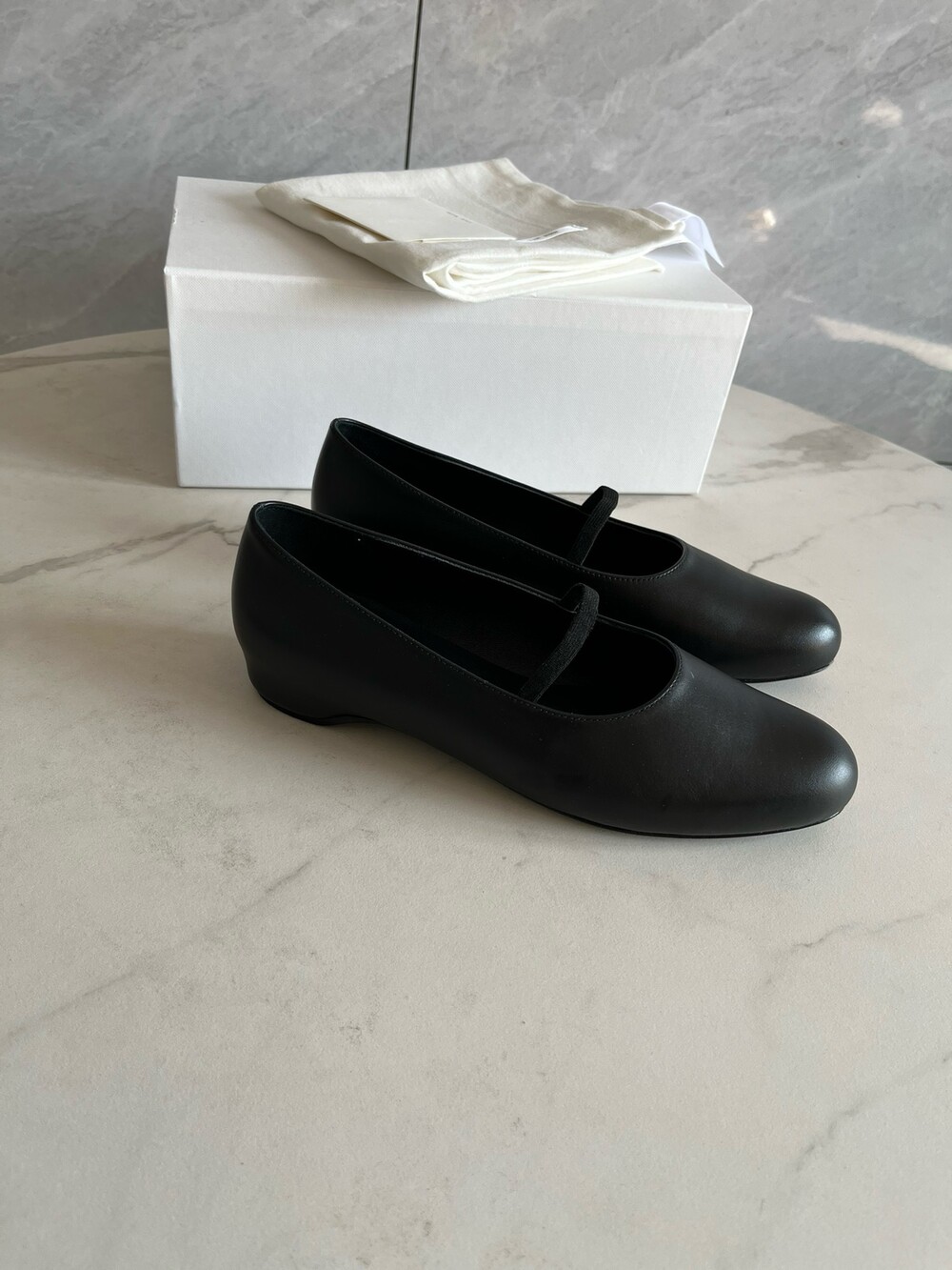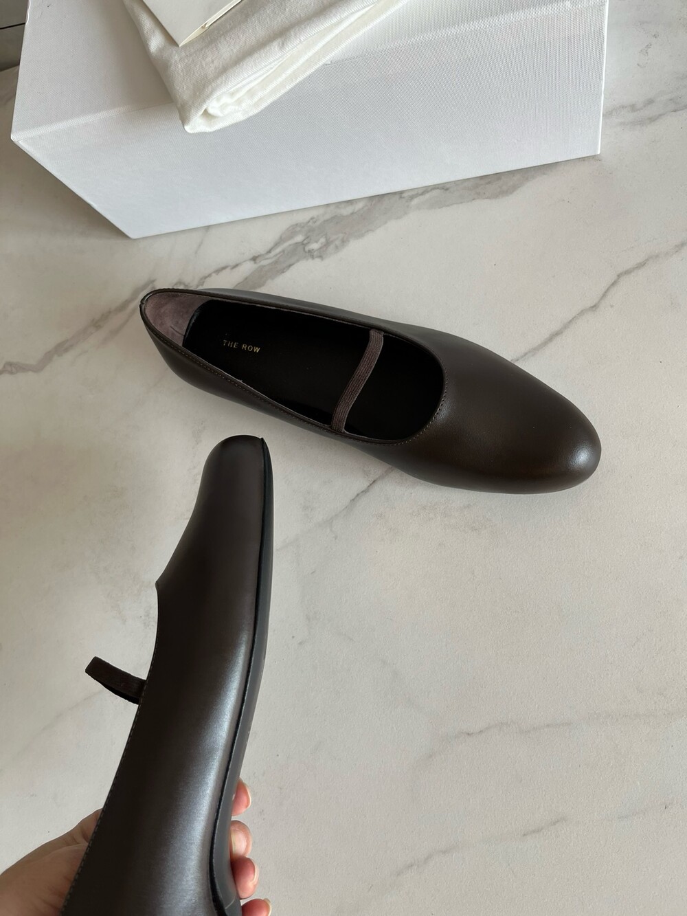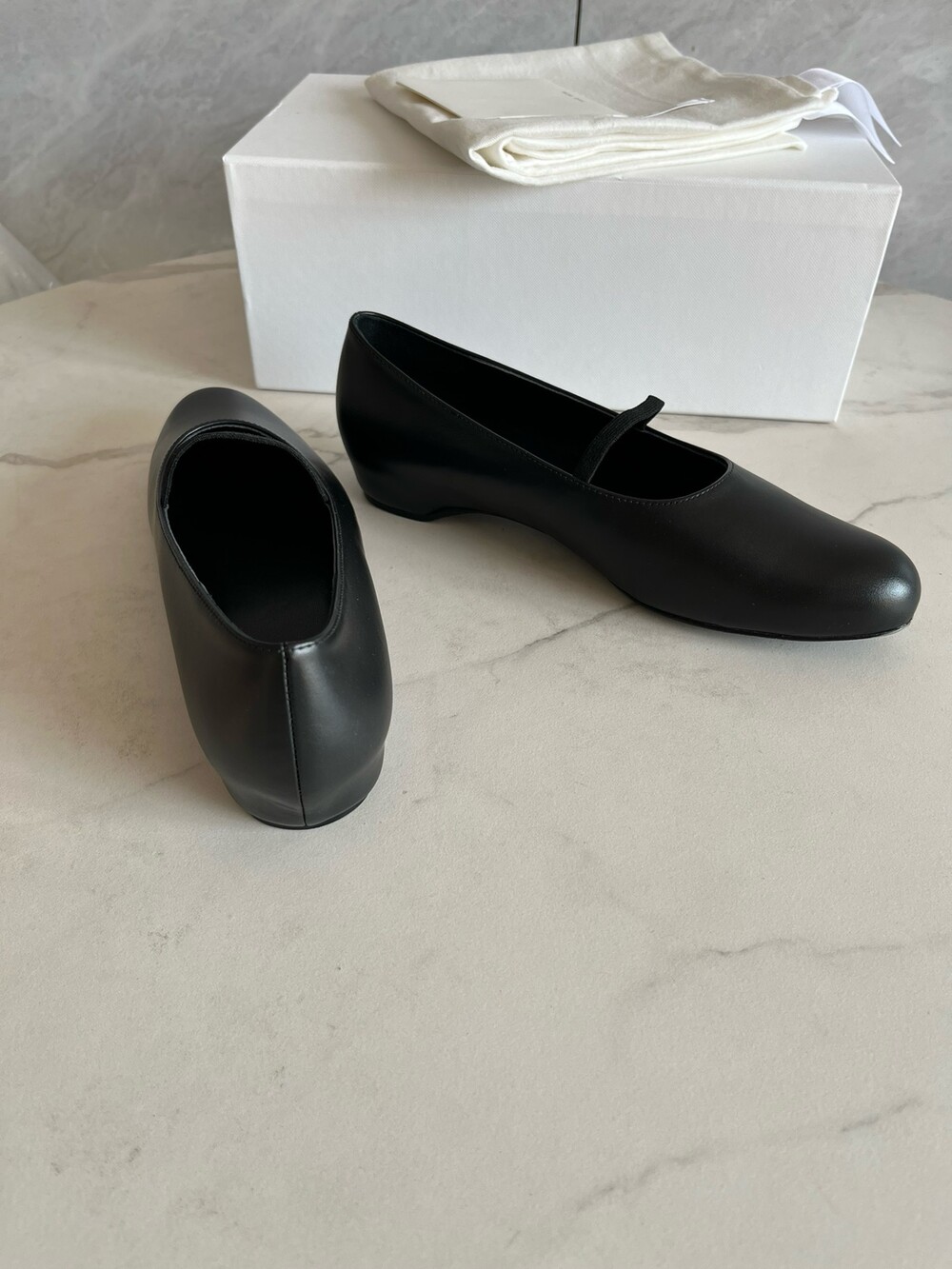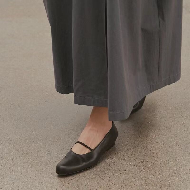 스무드 카프스킨 가죽 소재의 업데이티드 메리제인. 신축성 있는 스트랩 및 길쭉한 미니 웨지 힐.