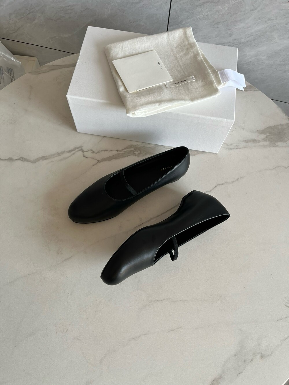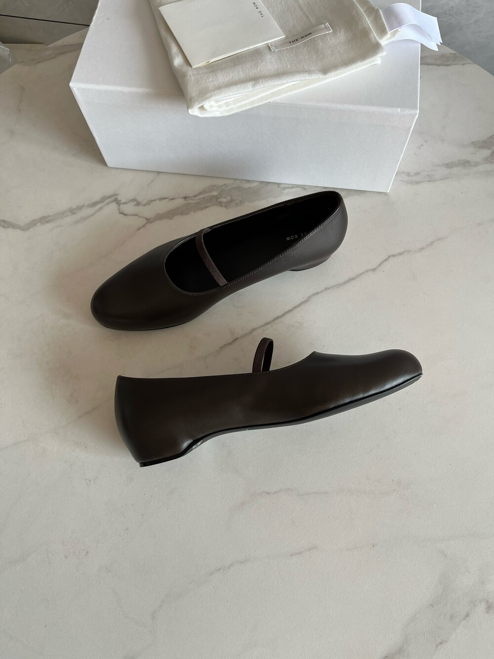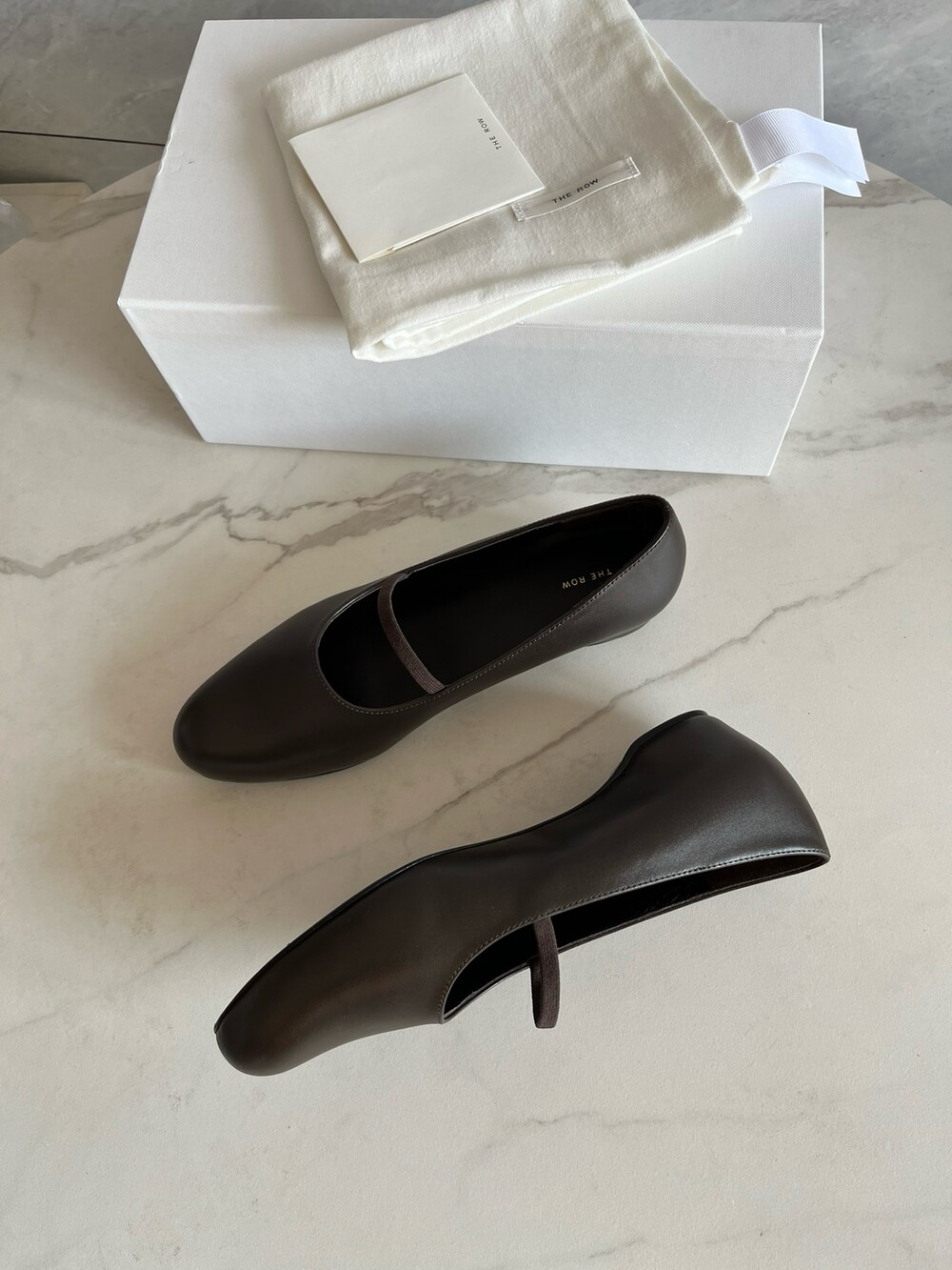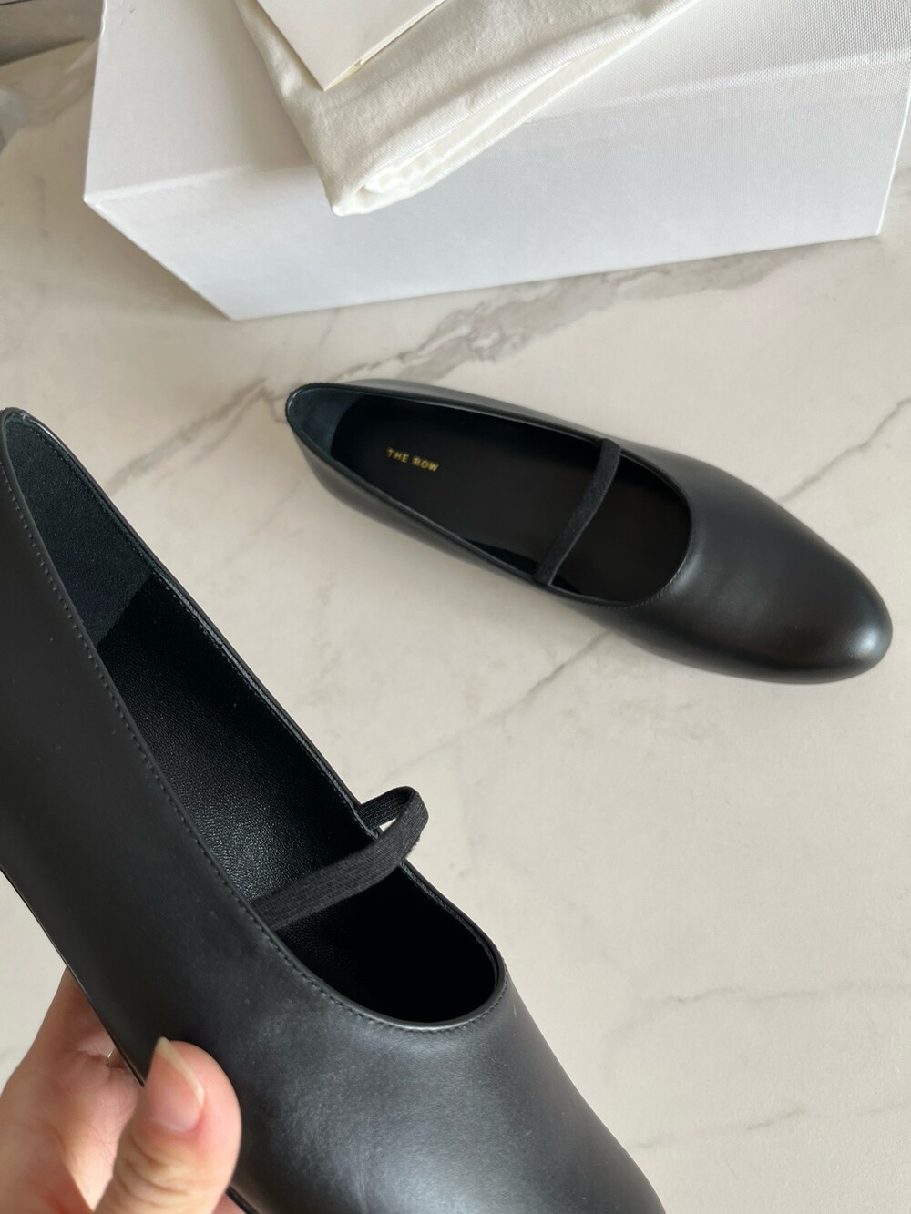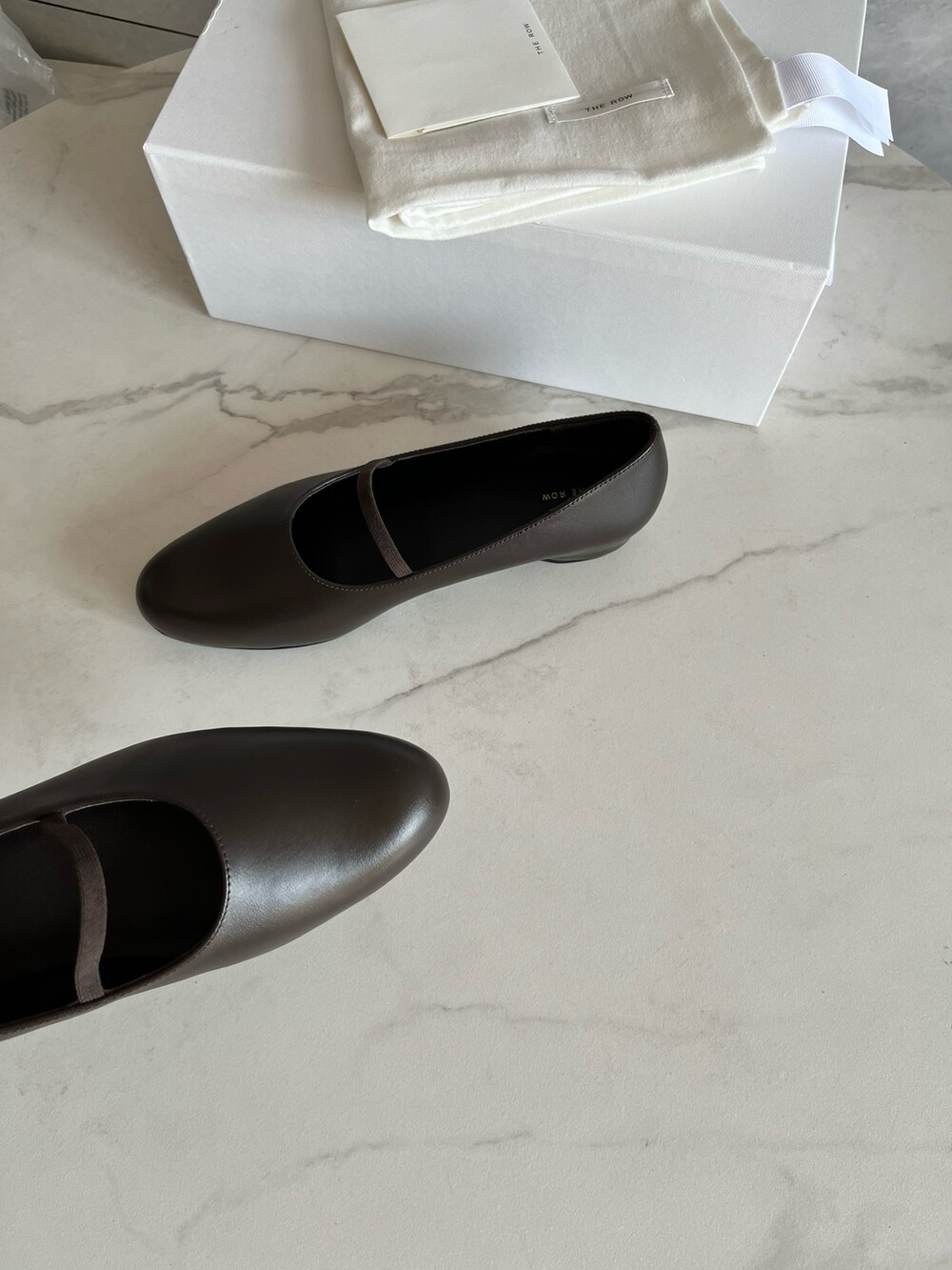 스무드 카프스킨 가죽 소재의 업데이티드 메리제인. 신축성 있는 스트랩 및 길쭉한 미니 웨지 힐.