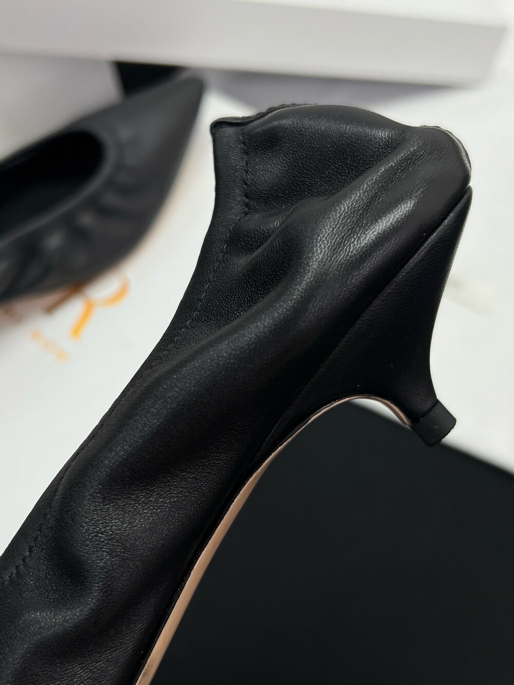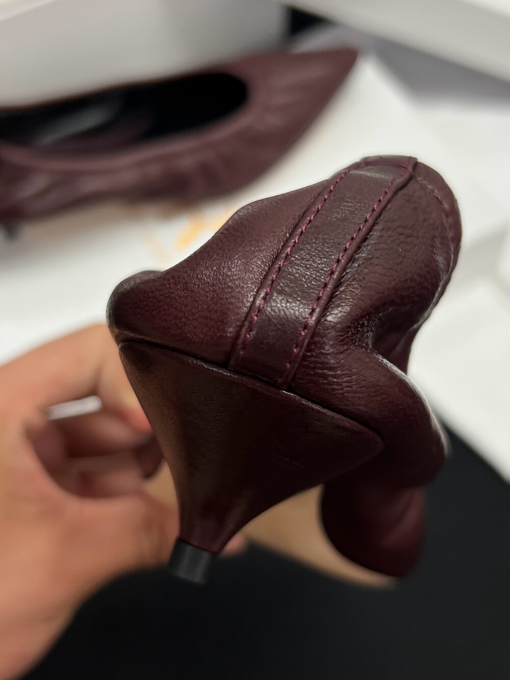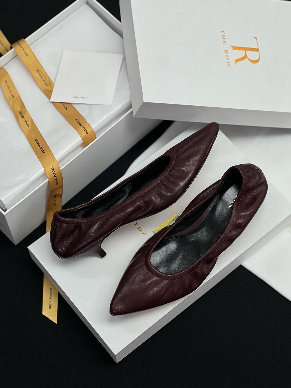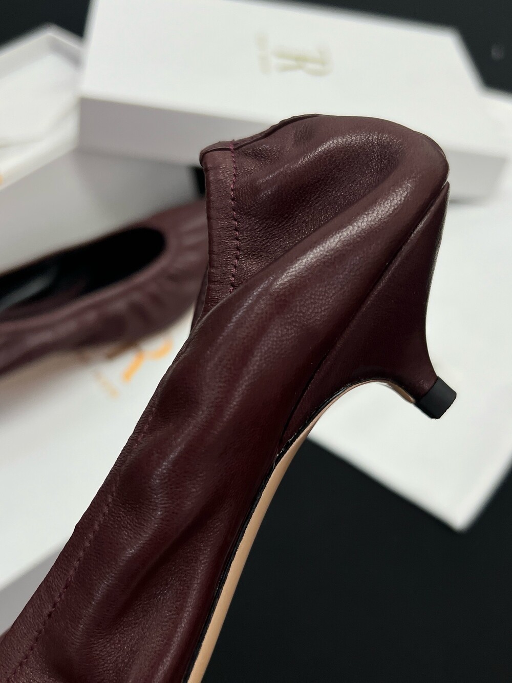 포인트 토와 가죽 밑창이 있는 부드러운 양가죽 소재의 키튼 힐 슈즈.