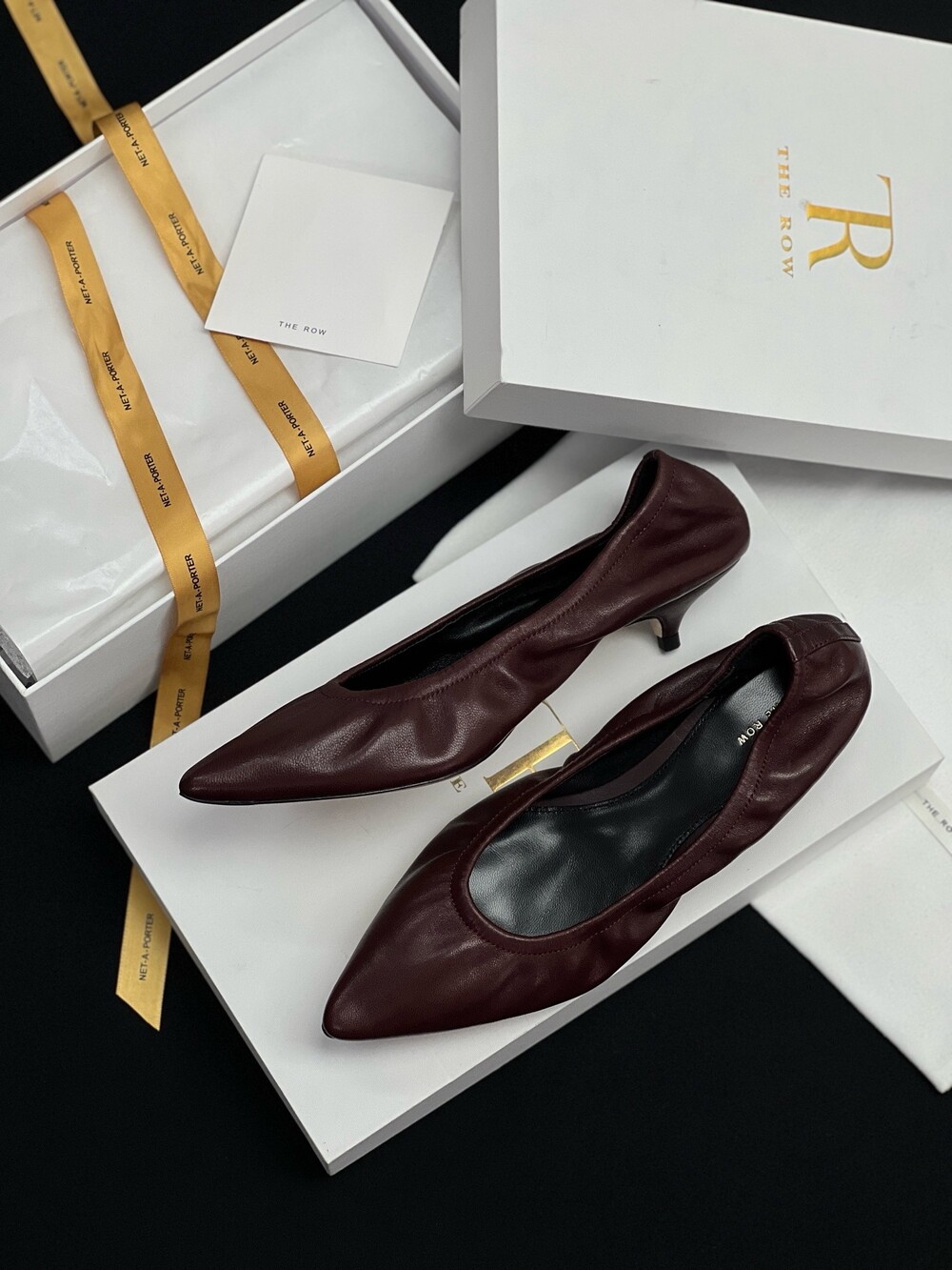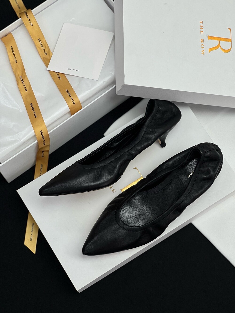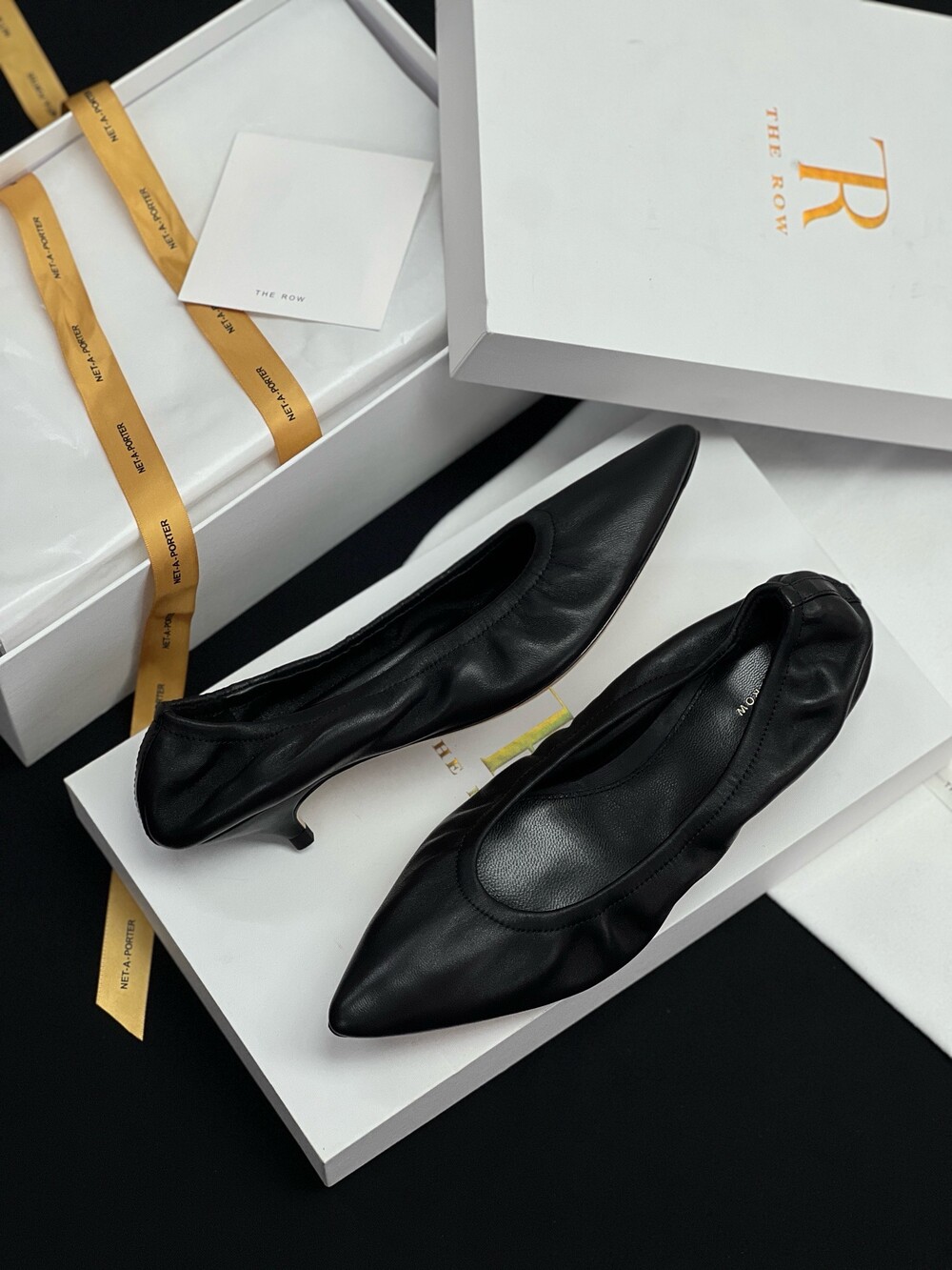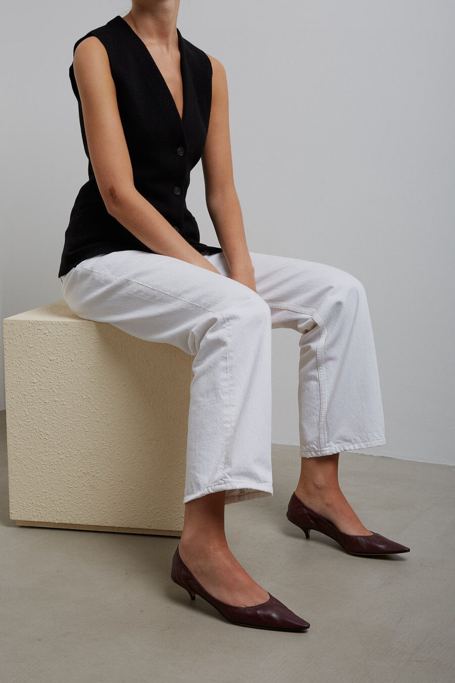 포인트 토와 가죽 밑창이 있는 부드러운 양가죽 소재의 키튼 힐 슈즈.