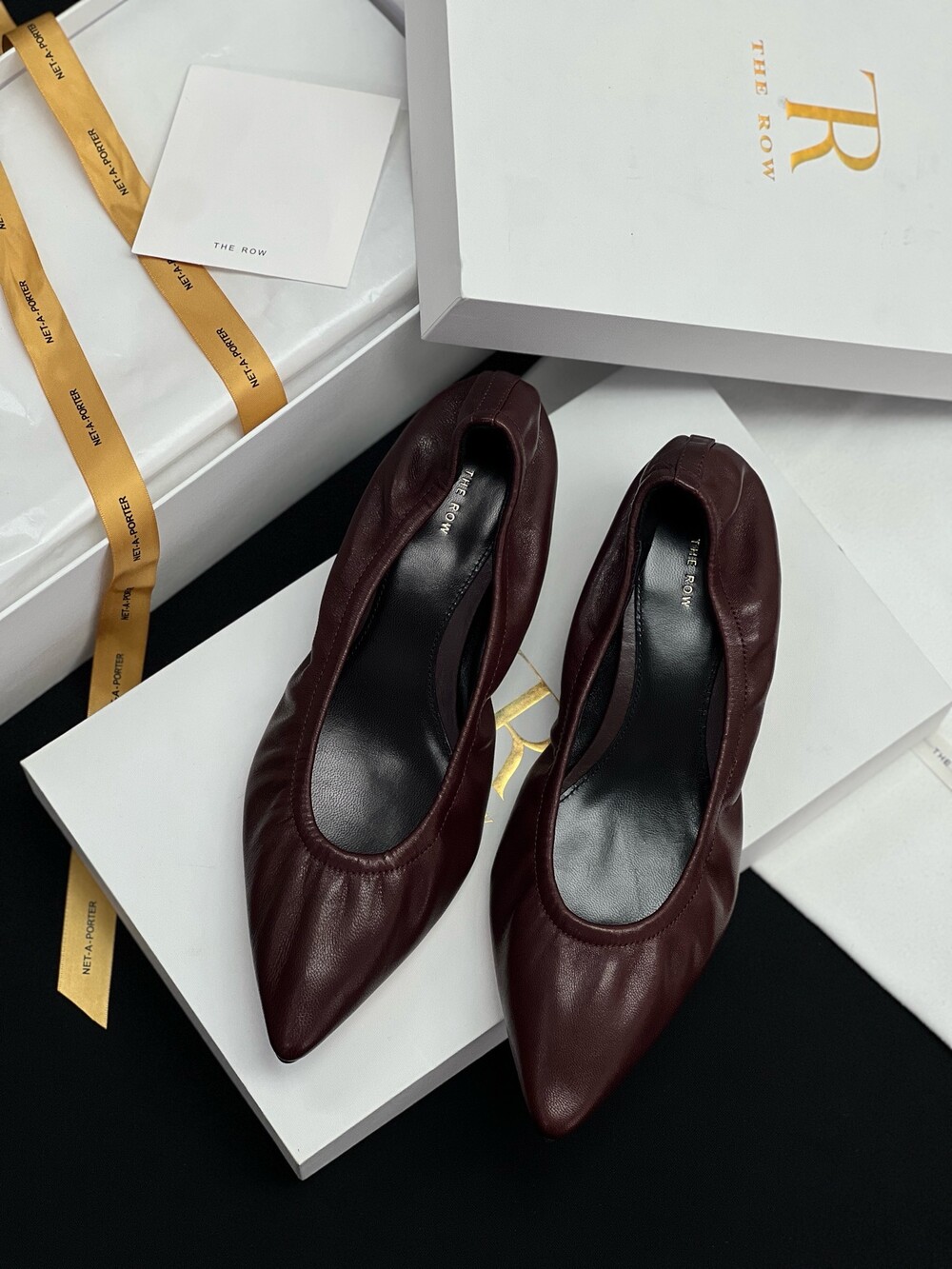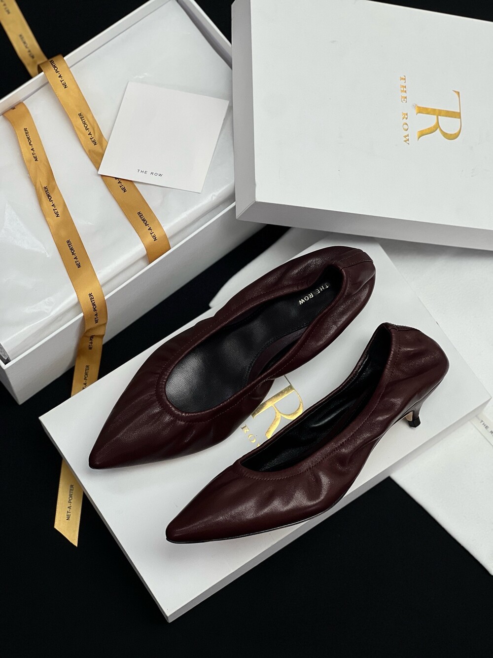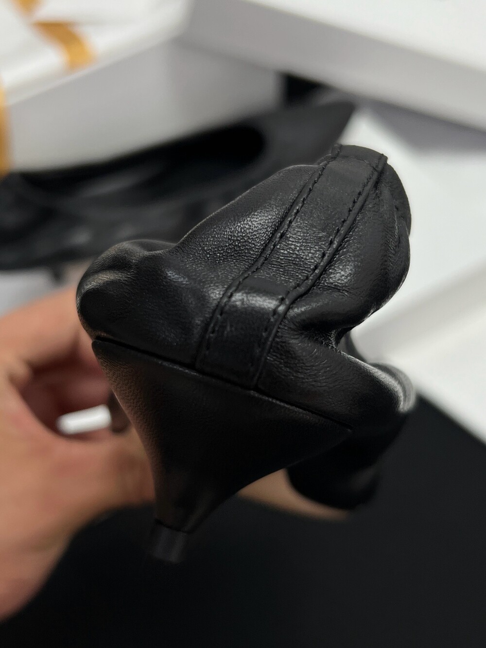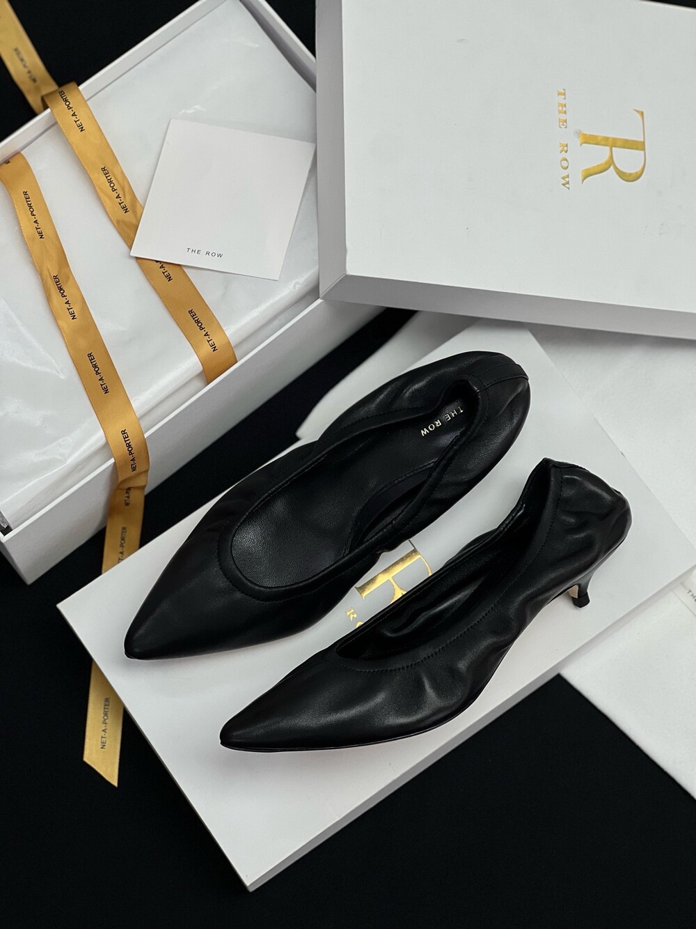 포인트 토와 가죽 밑창이 있는 부드러운 양가죽 소재의 키튼 힐 슈즈.