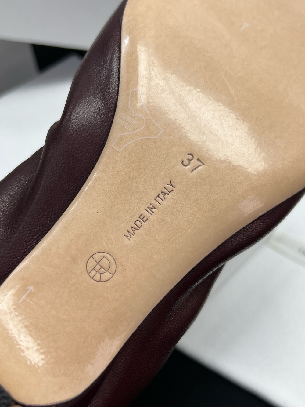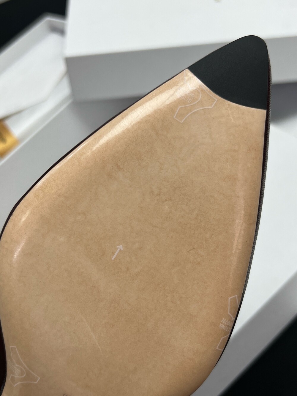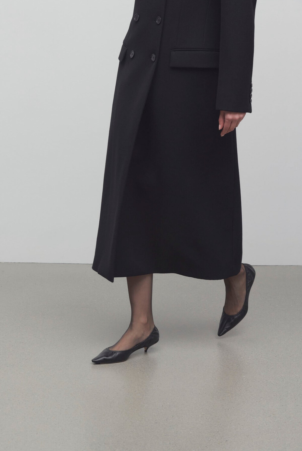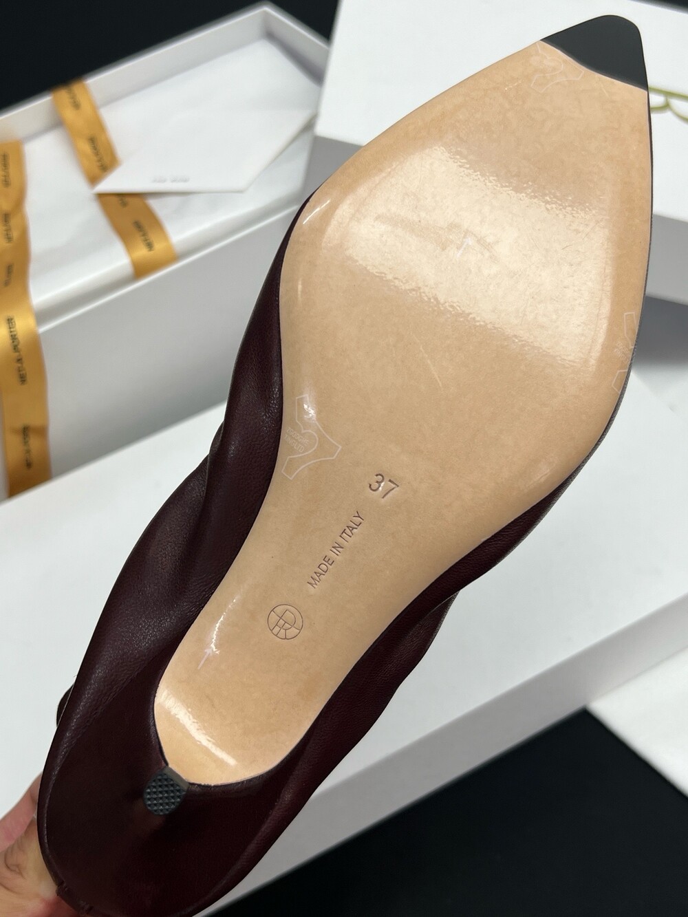 포인트 토와 가죽 밑창이 있는 부드러운 양가죽 소재의 키튼 힐 슈즈.