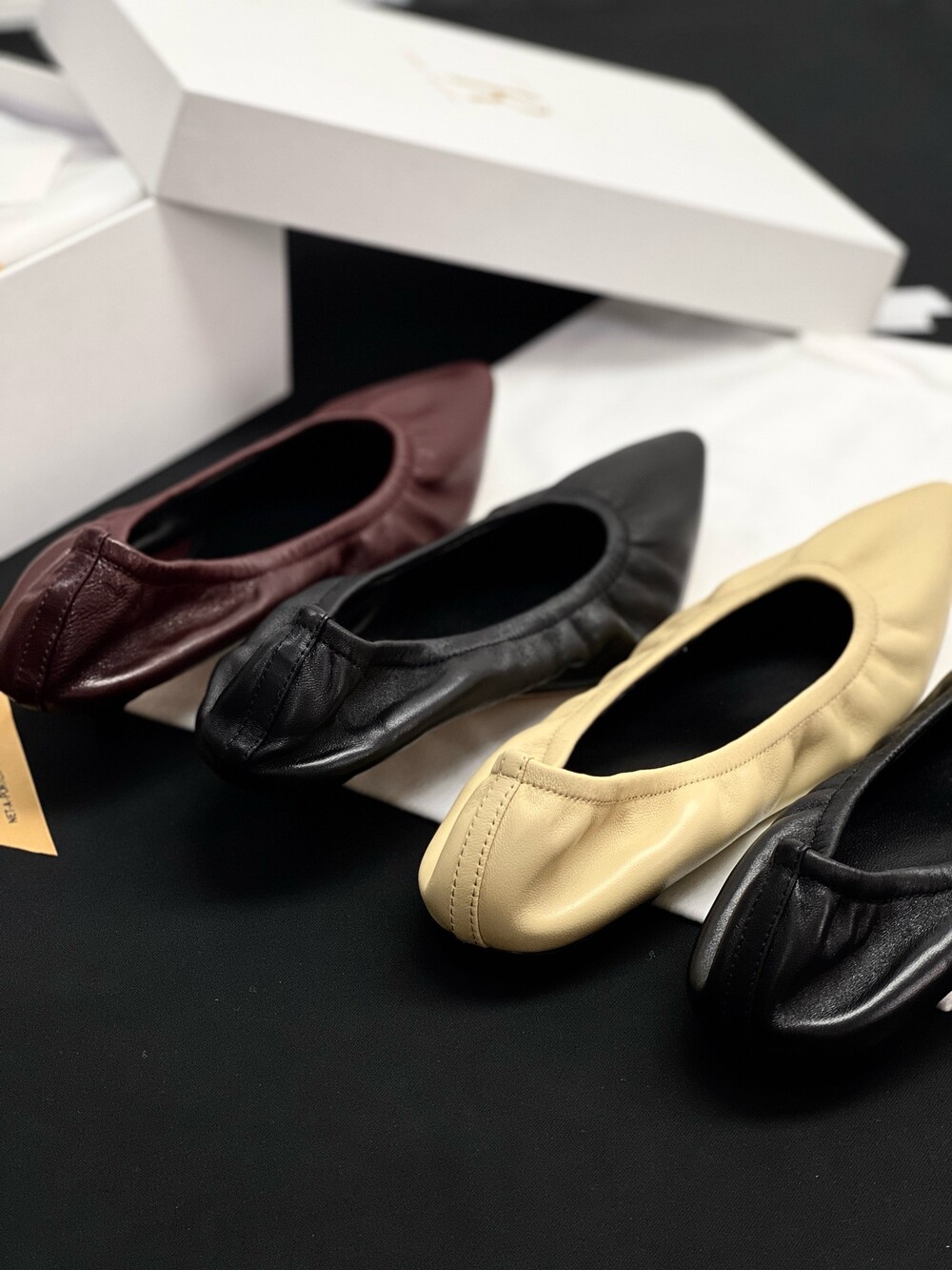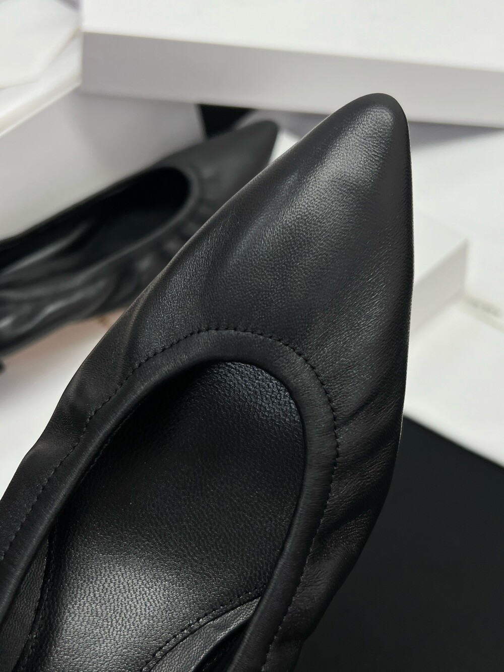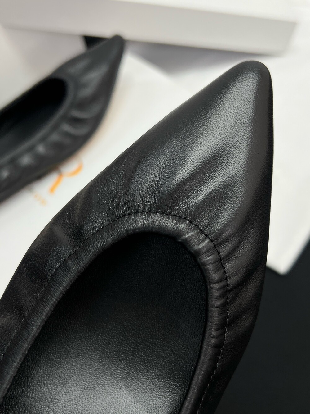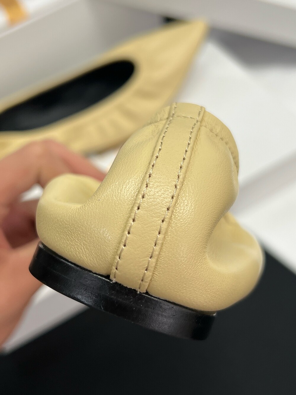 부드러운 램스킨 가죽 소재의 미니멀 플랫 슈즈. 포인티드 토, 신축성 있는 부드러운 트리밍, 가죽 밑창.