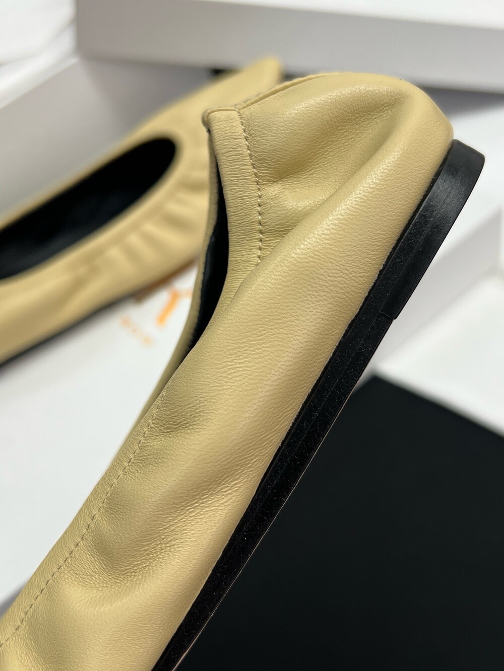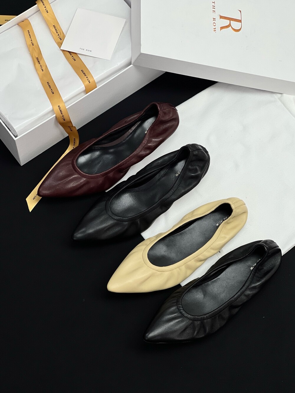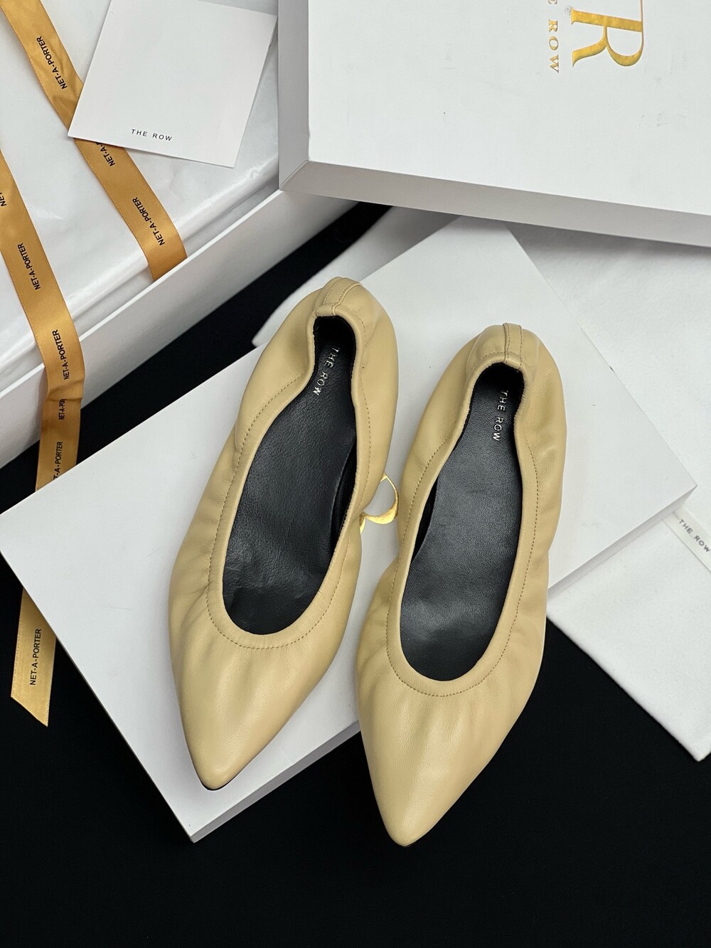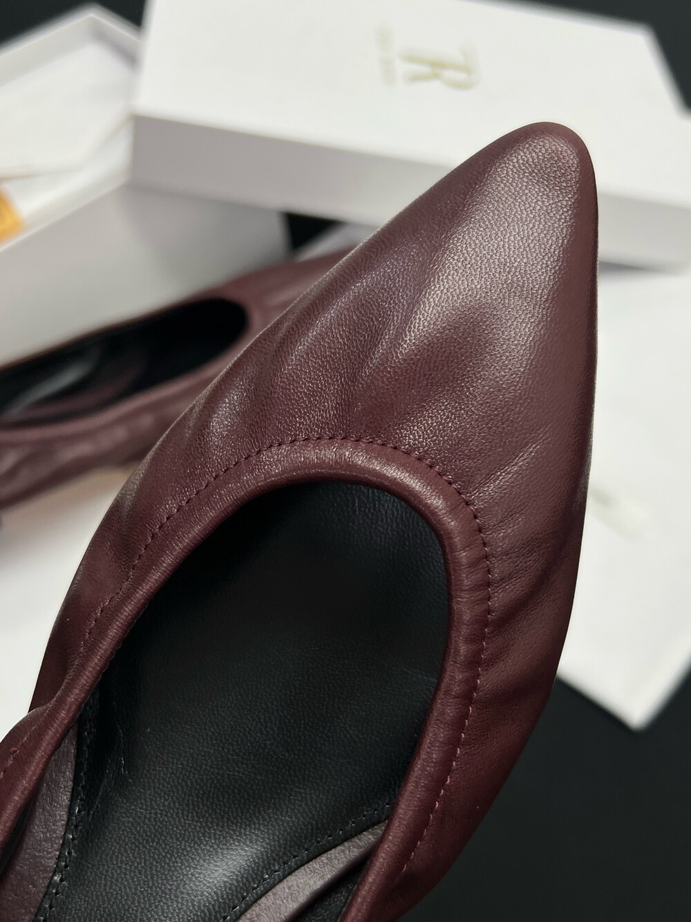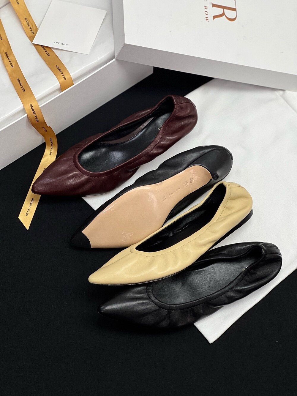 부드러운 램스킨 가죽 소재의 미니멀 플랫 슈즈. 포인티드 토, 신축성 있는 부드러운 트리밍, 가죽 밑창.