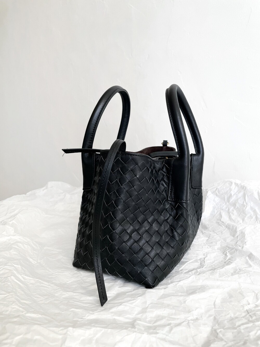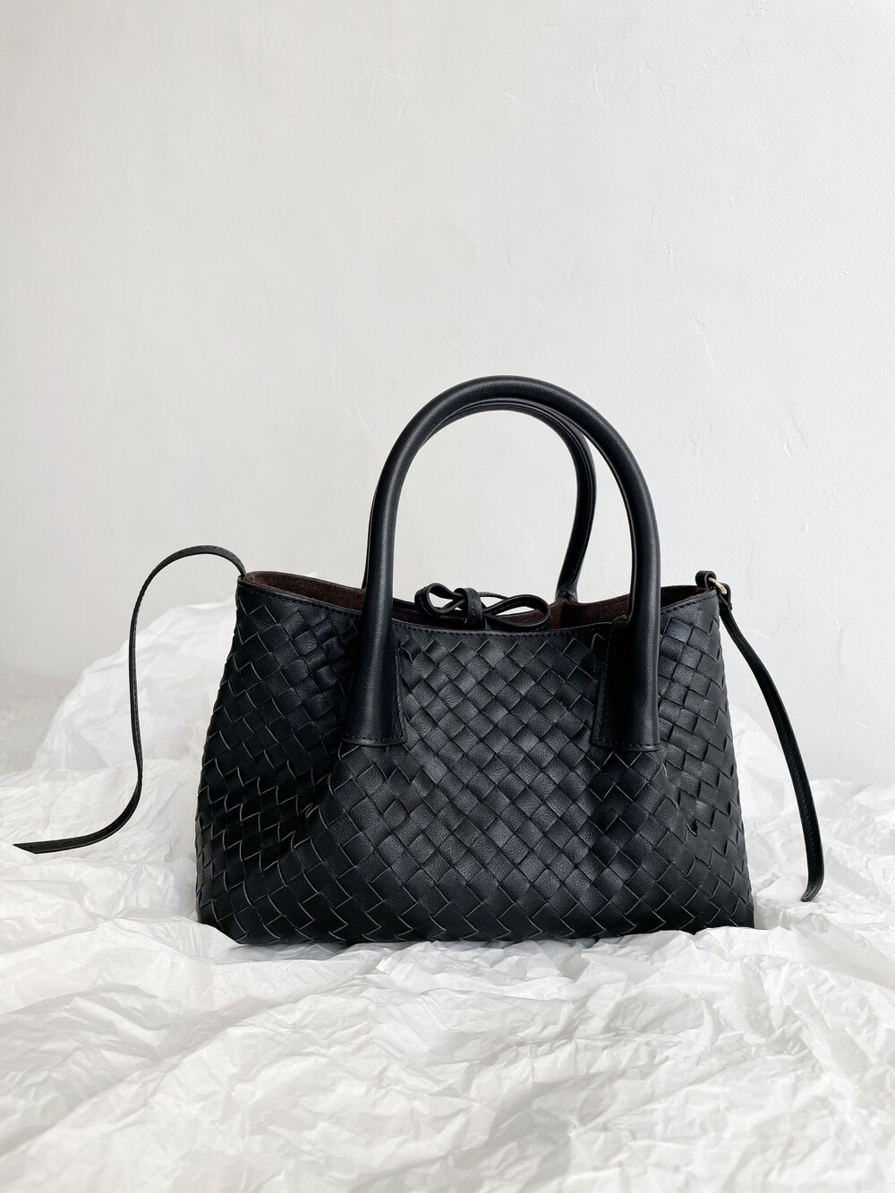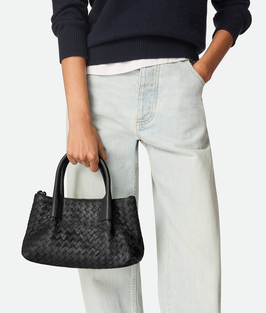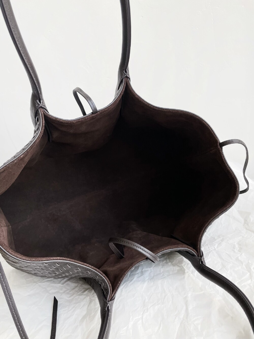 길이 조절 및 탈착 가능한 스트랩을 갖춘 실키한 인트레치아토 송아지가죽 소재의 토트 백.