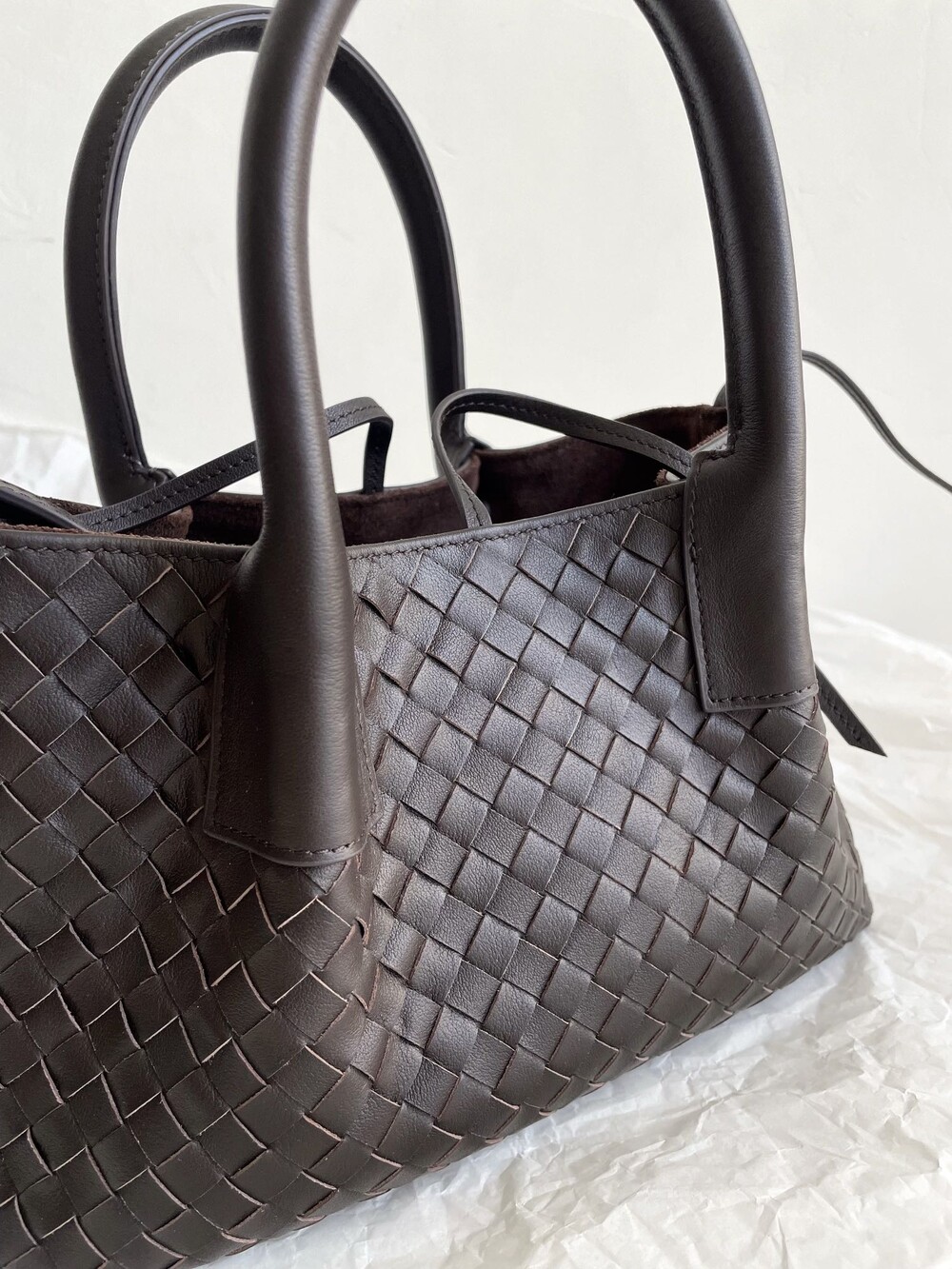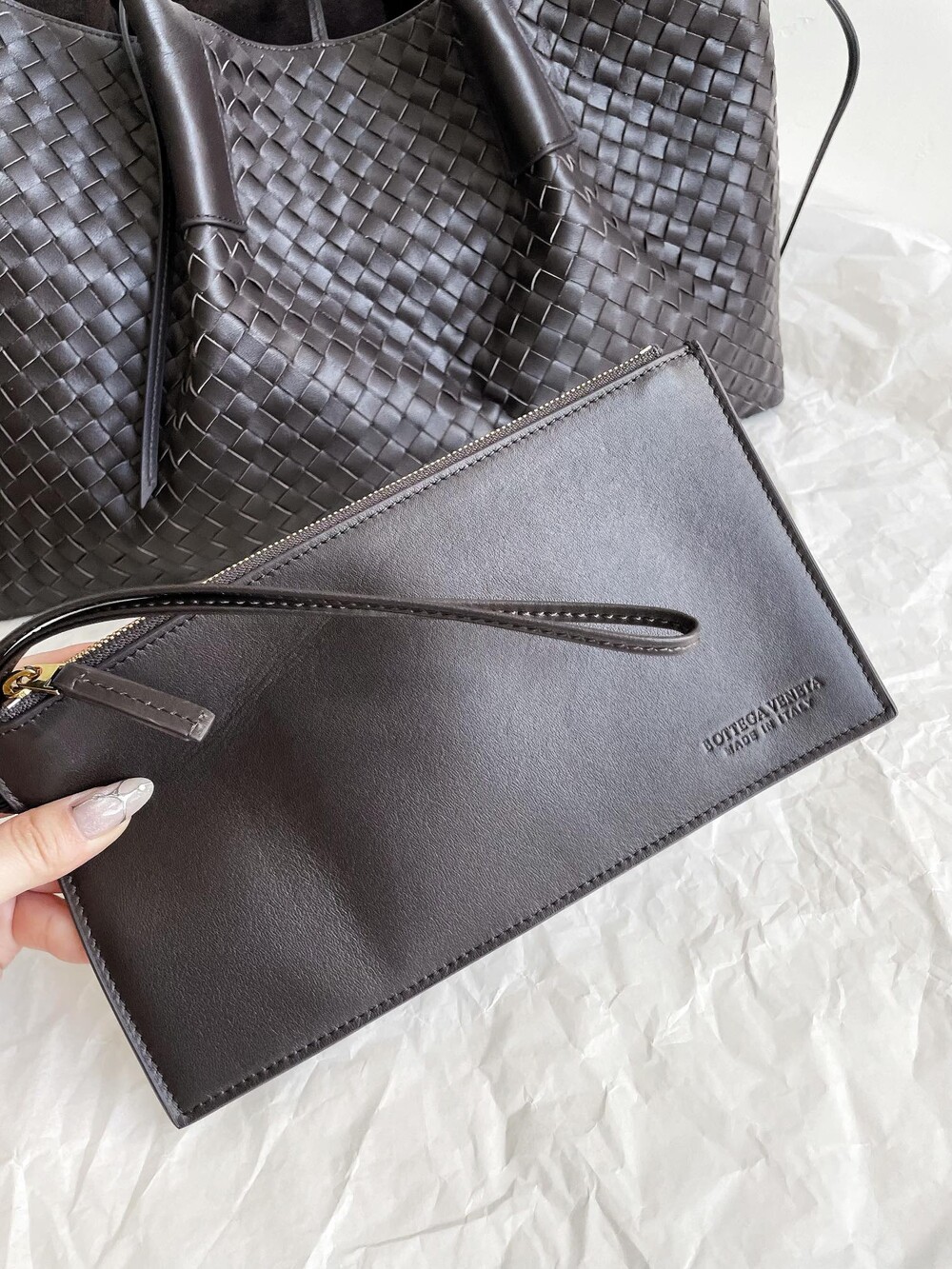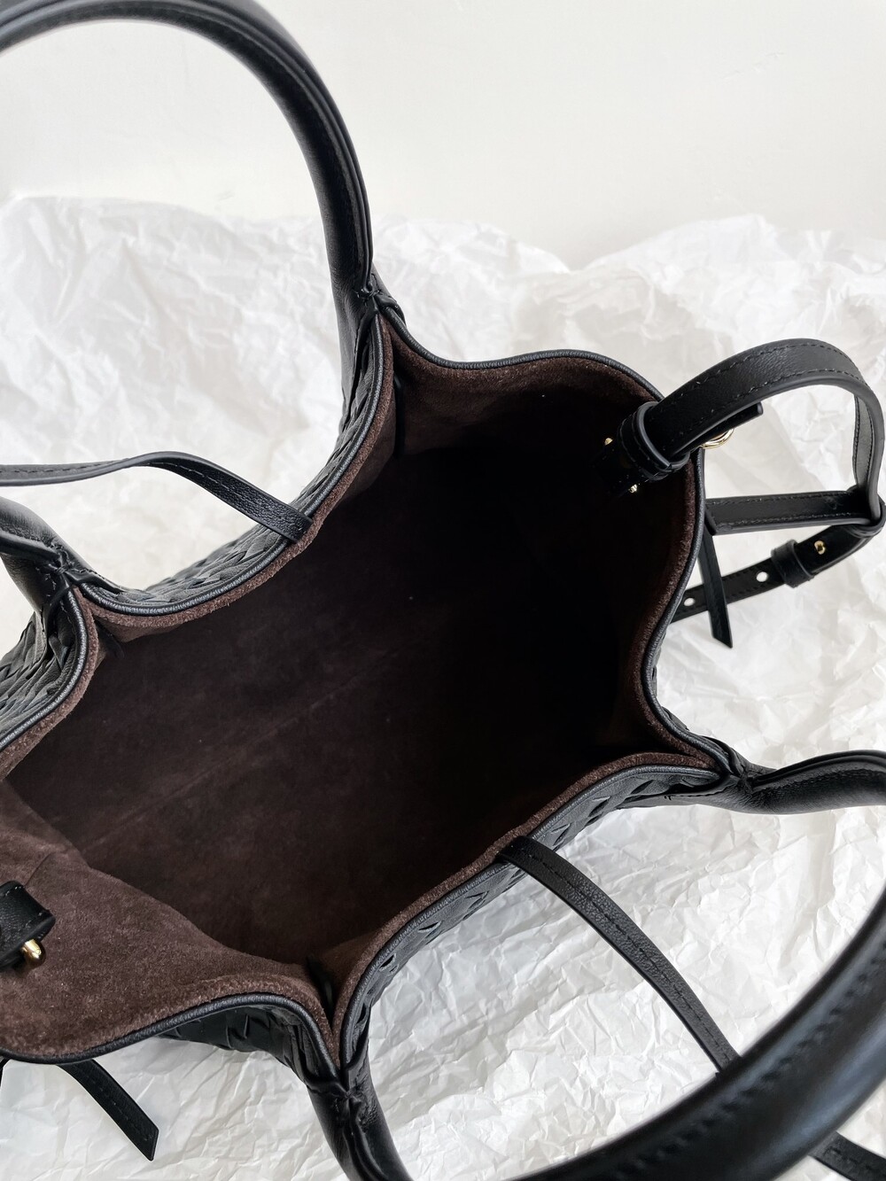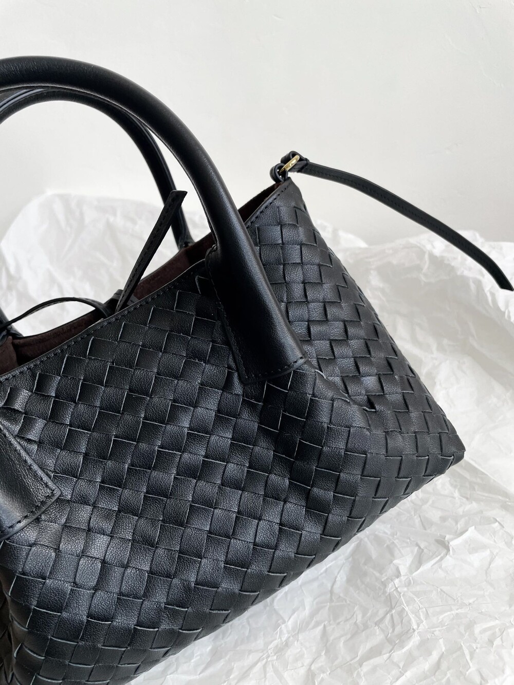 길이 조절 및 탈착 가능한 스트랩을 갖춘 실키한 인트레치아토 송아지가죽 소재의 토트 백.