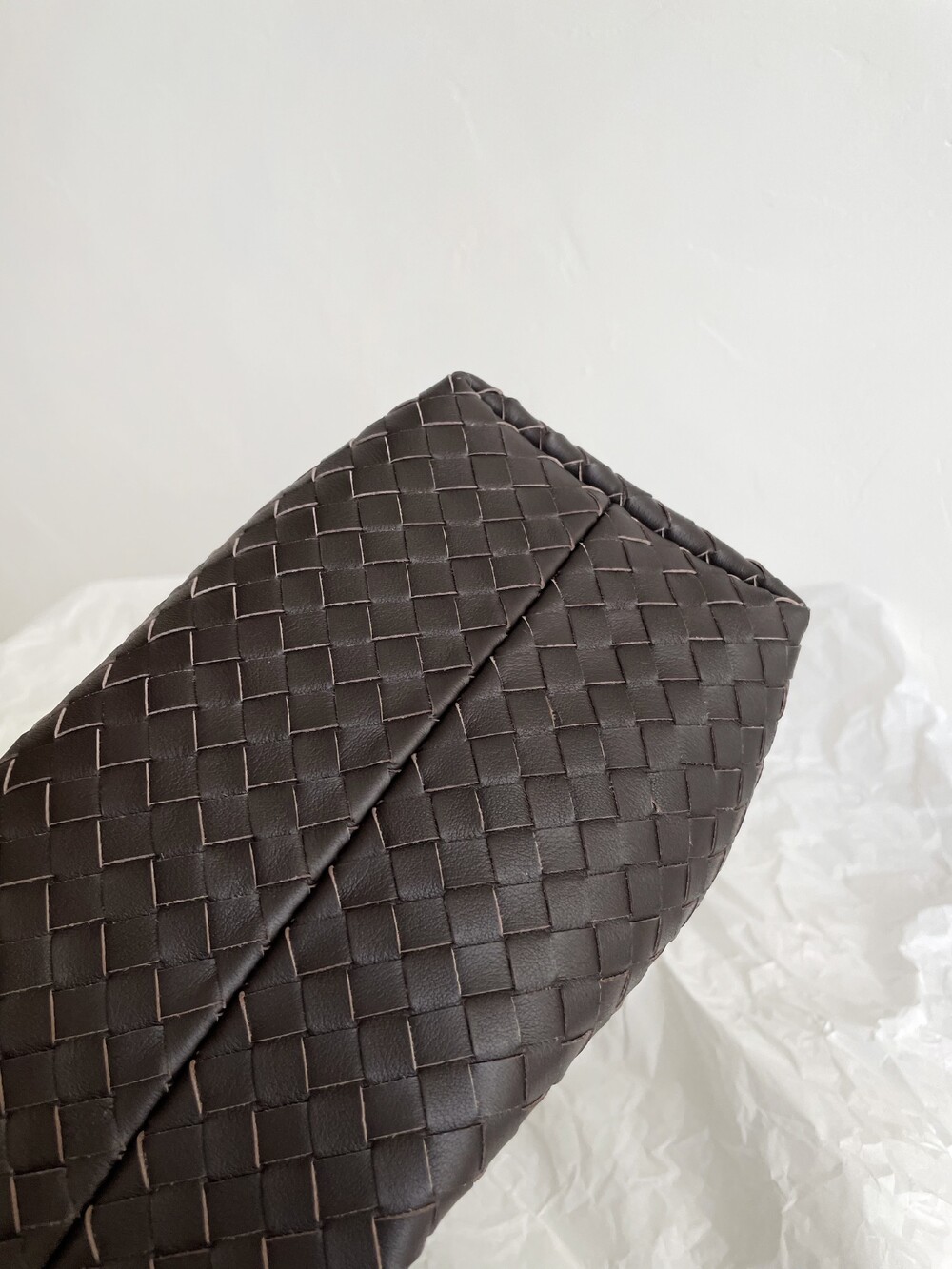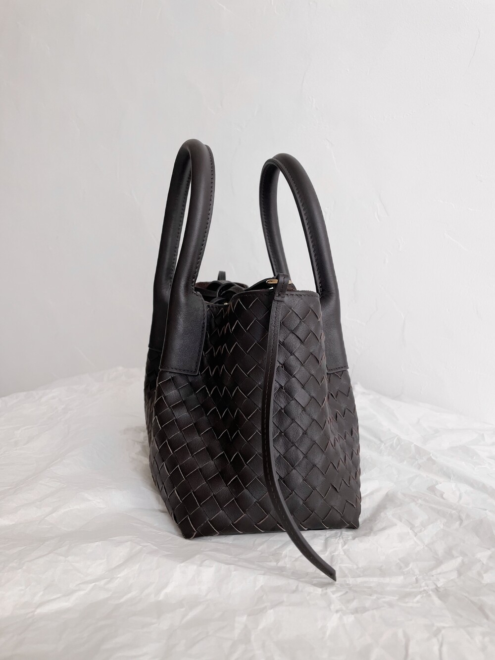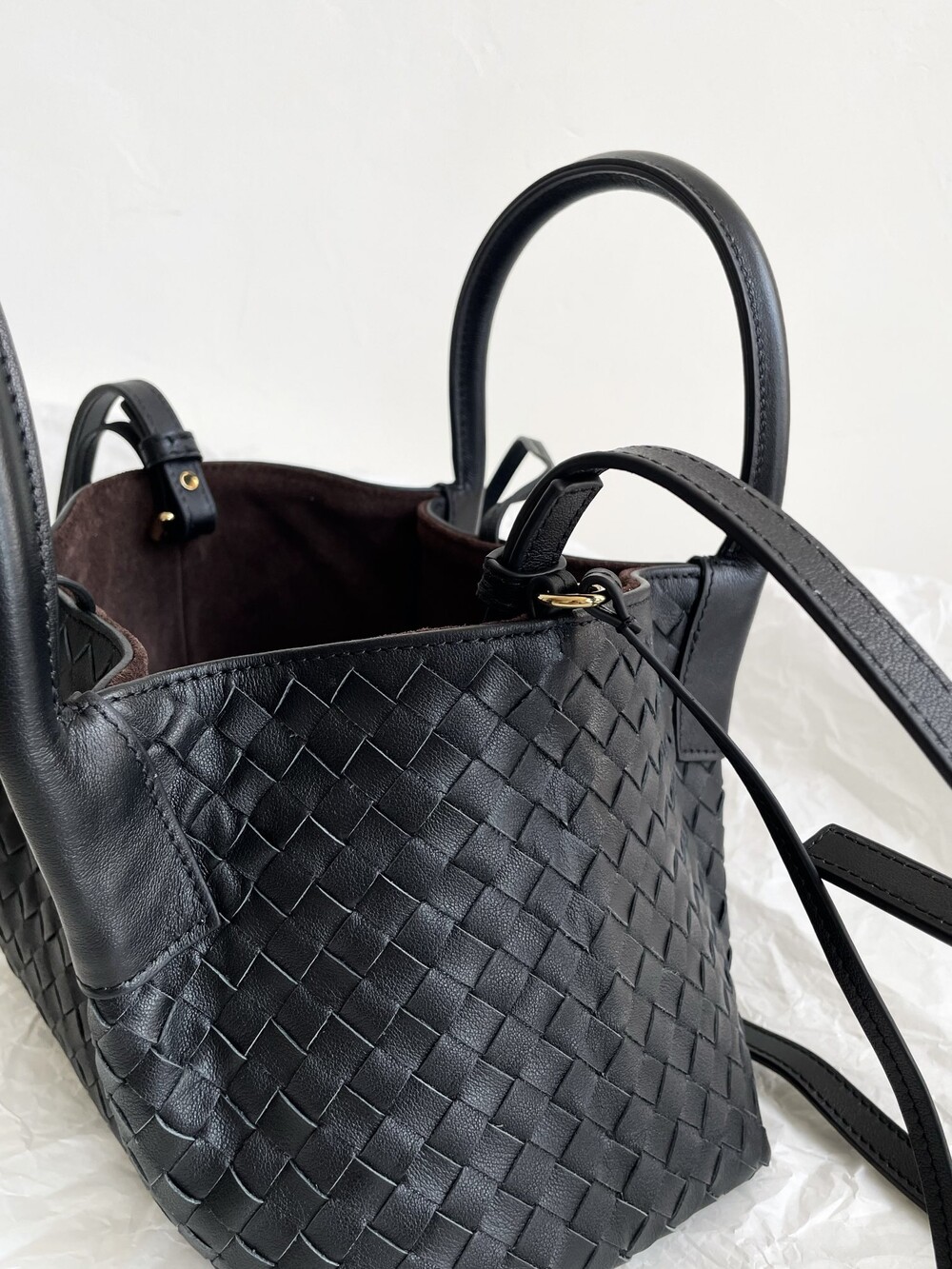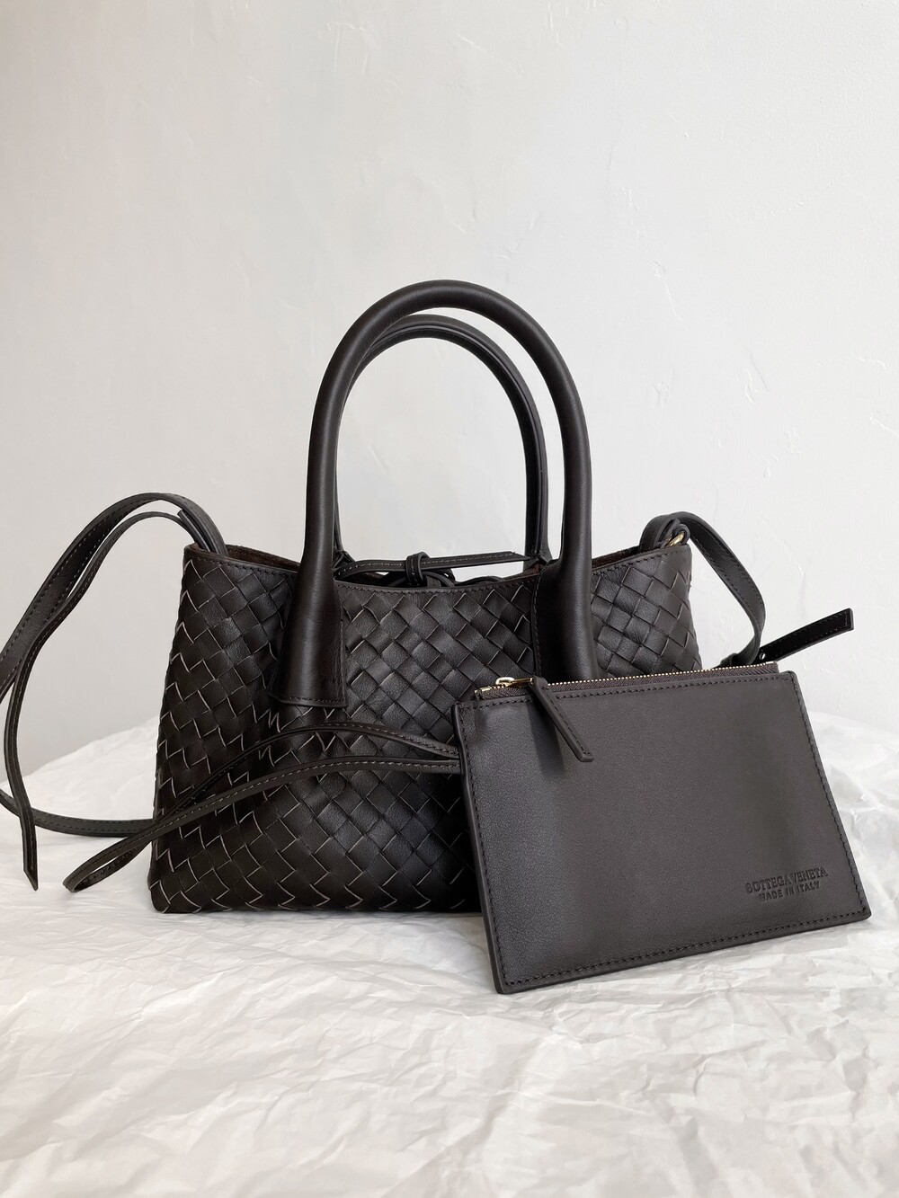 길이 조절 및 탈착 가능한 스트랩을 갖춘 실키한 인트레치아토 송아지가죽 소재의 토트 백.