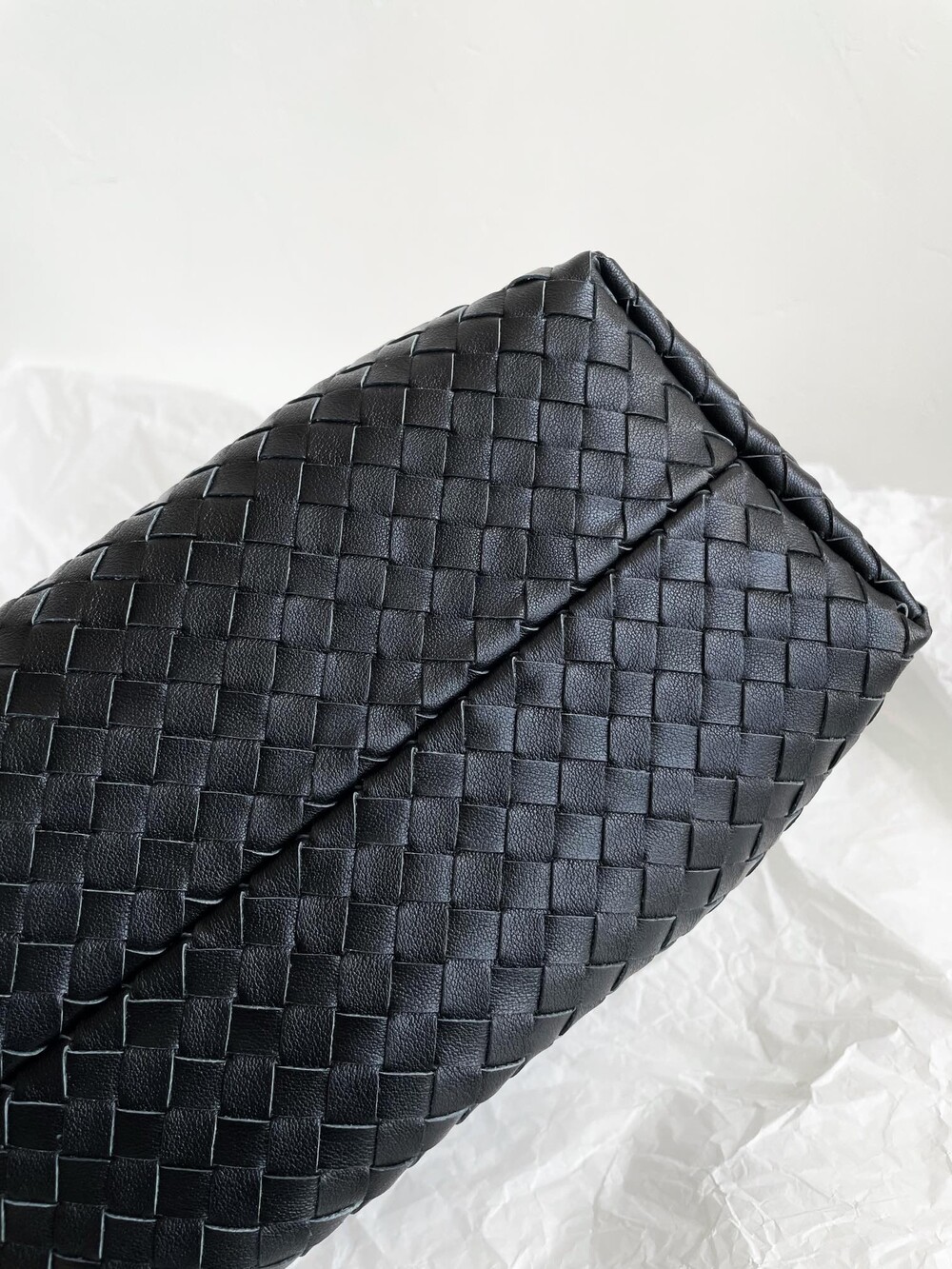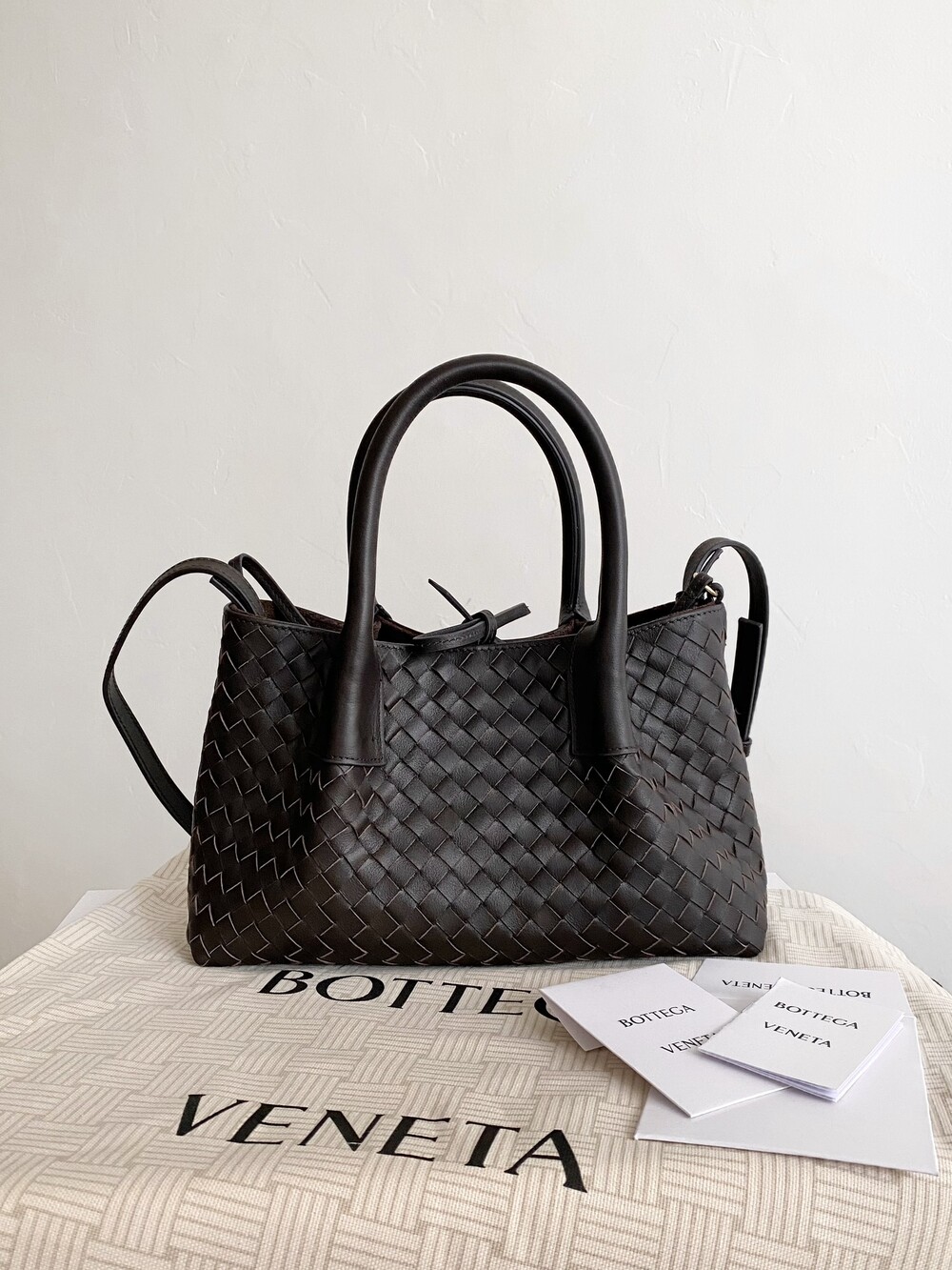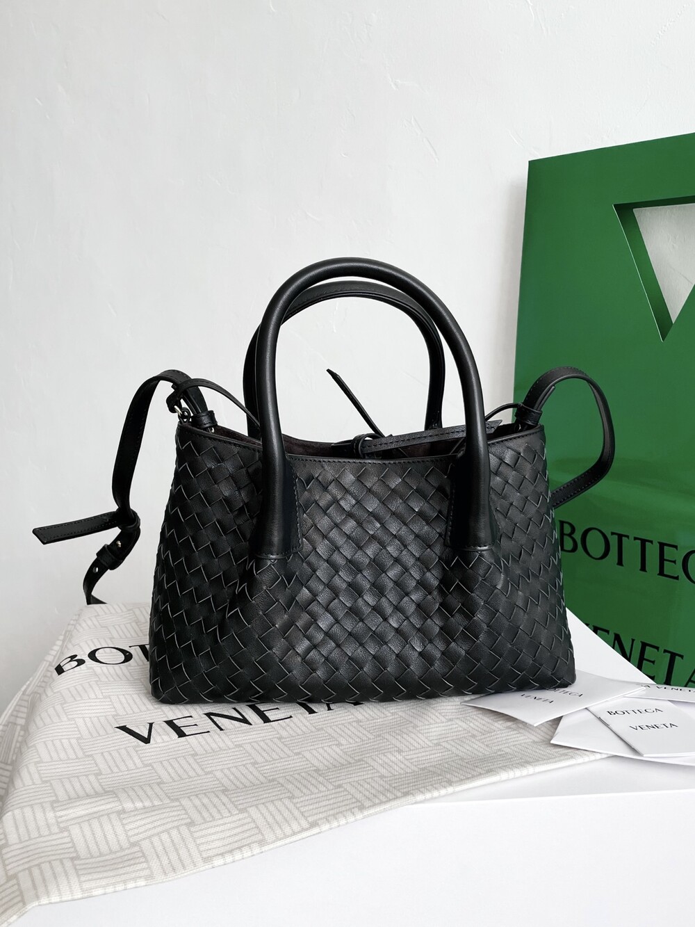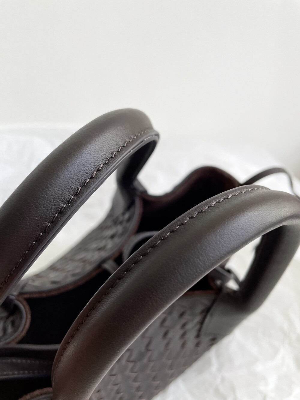 길이 조절 및 탈착 가능한 스트랩을 갖춘 실키한 인트레치아토 송아지가죽 소재의 토트 백.