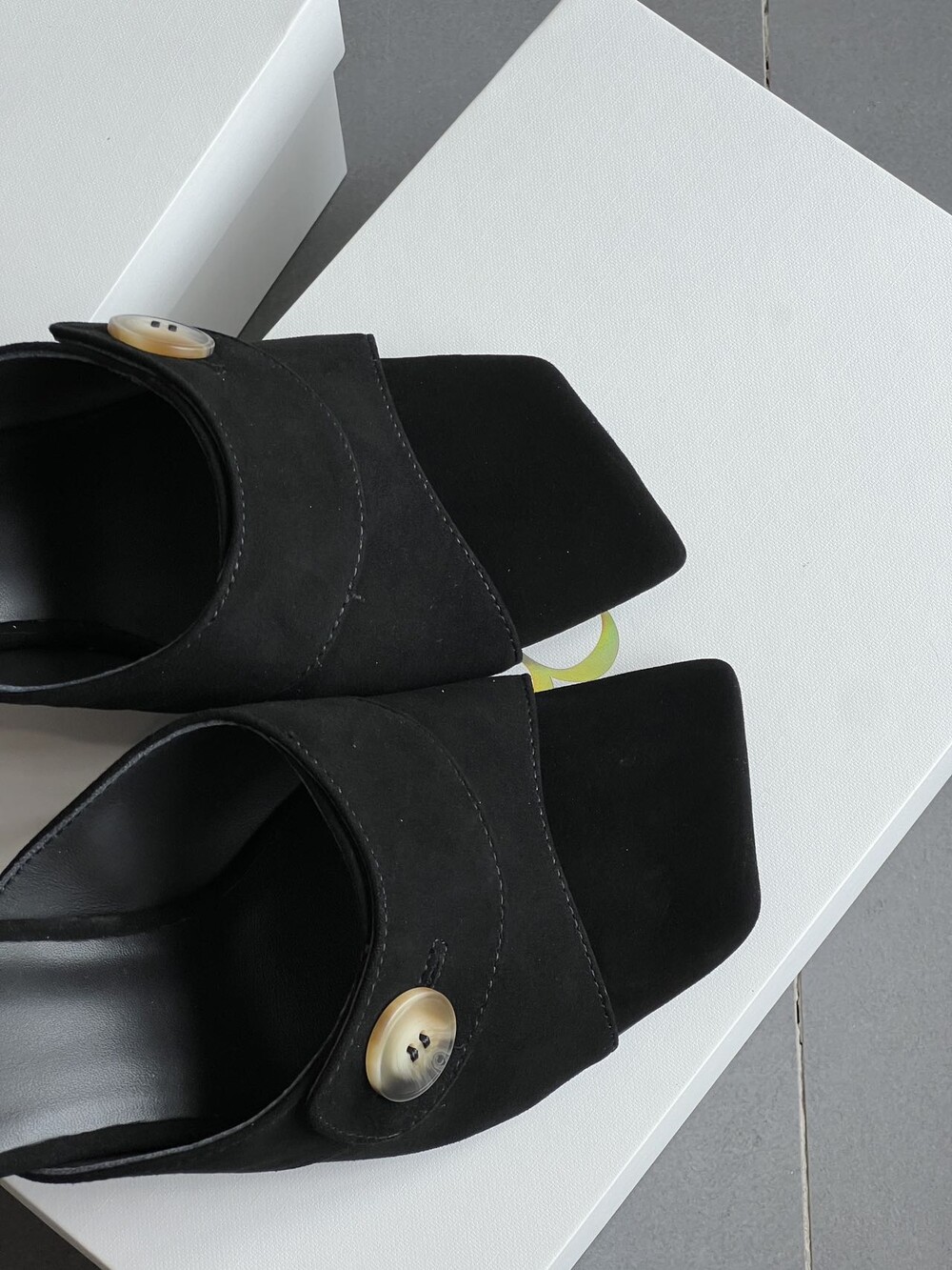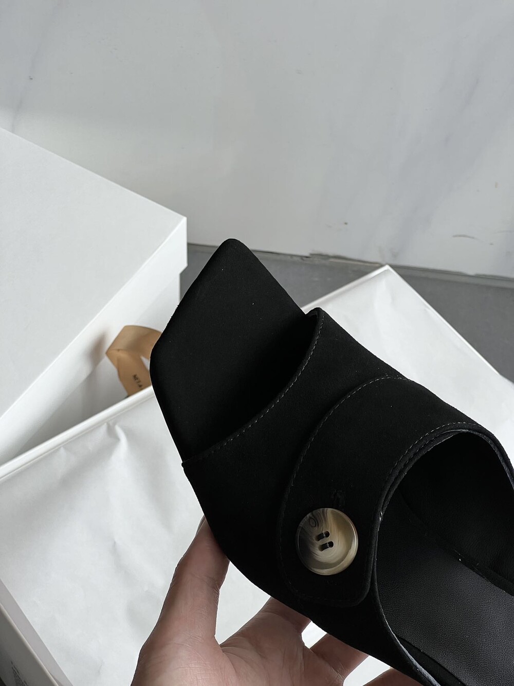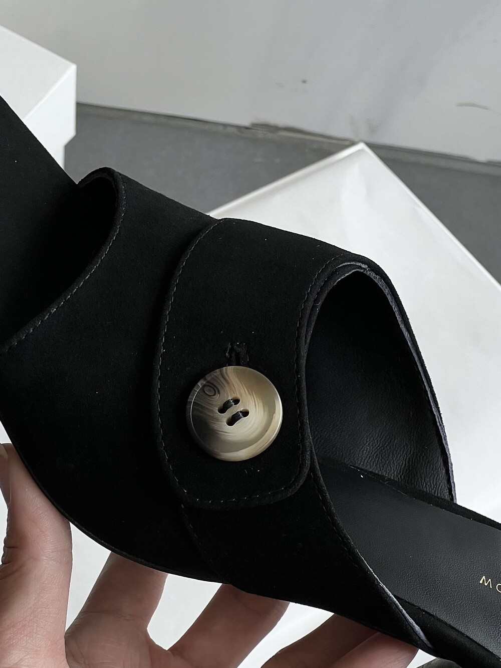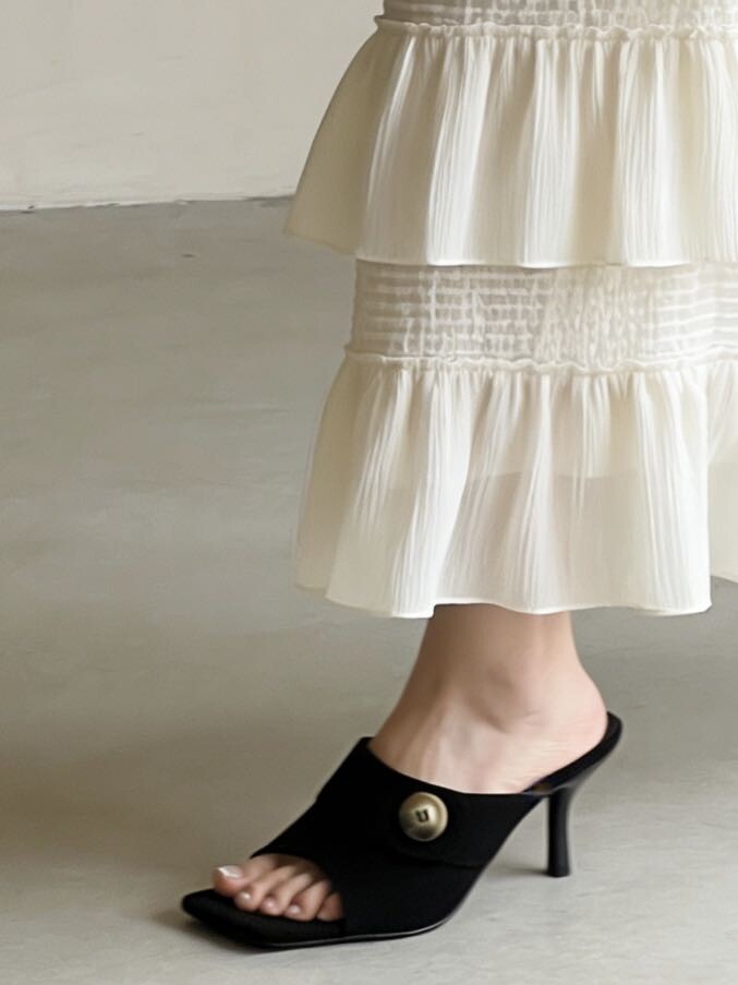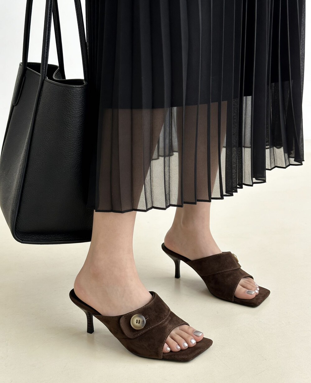 커스텀 레진 버튼: 슈즈 상단의 버튼은 수입 커스텀 레진 소재를 사용해 은은한 포인트가 되어줍니다. 작은 디테일 하나가 전체적인 무드를 완성합니다.