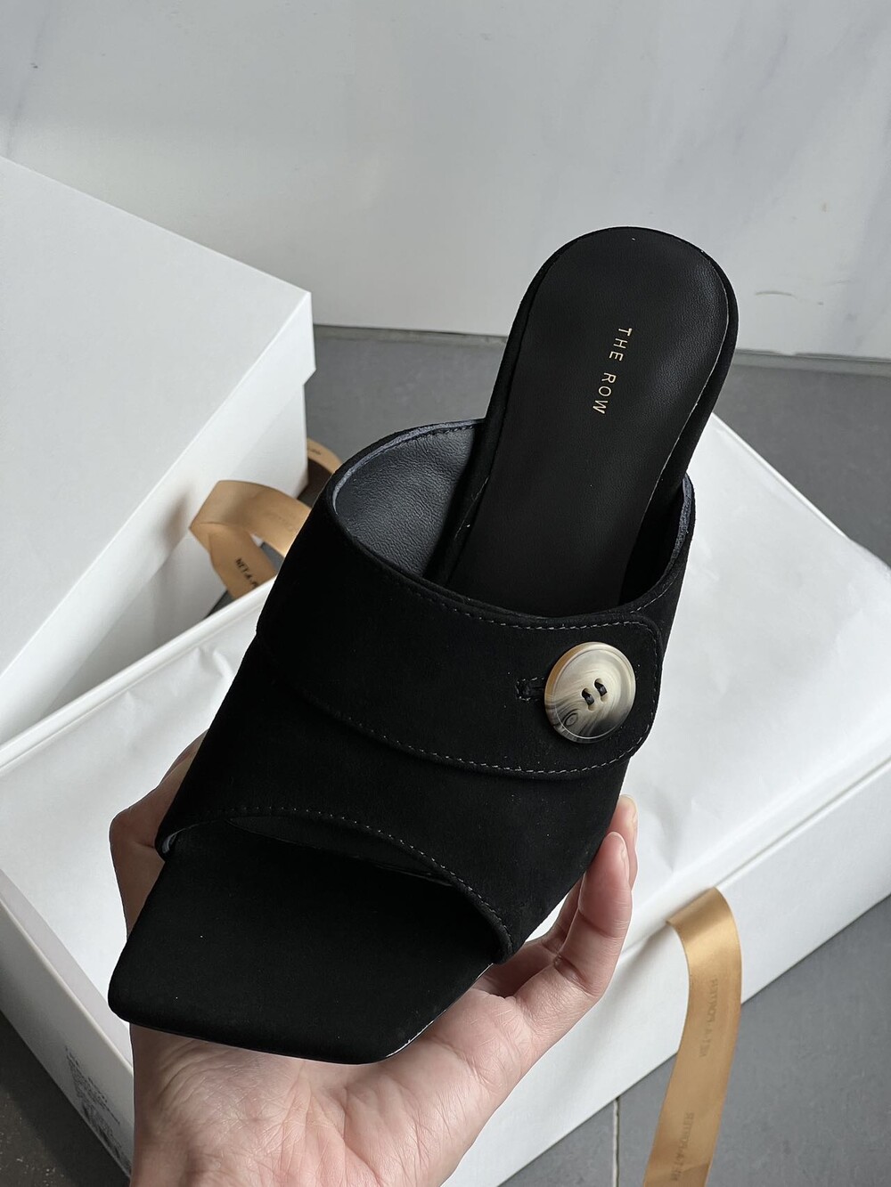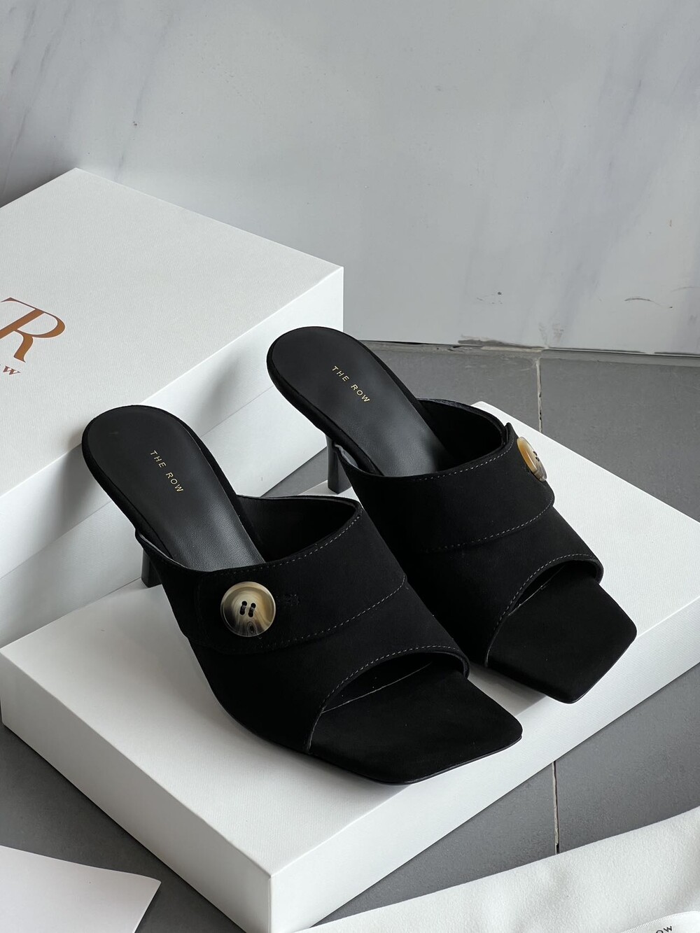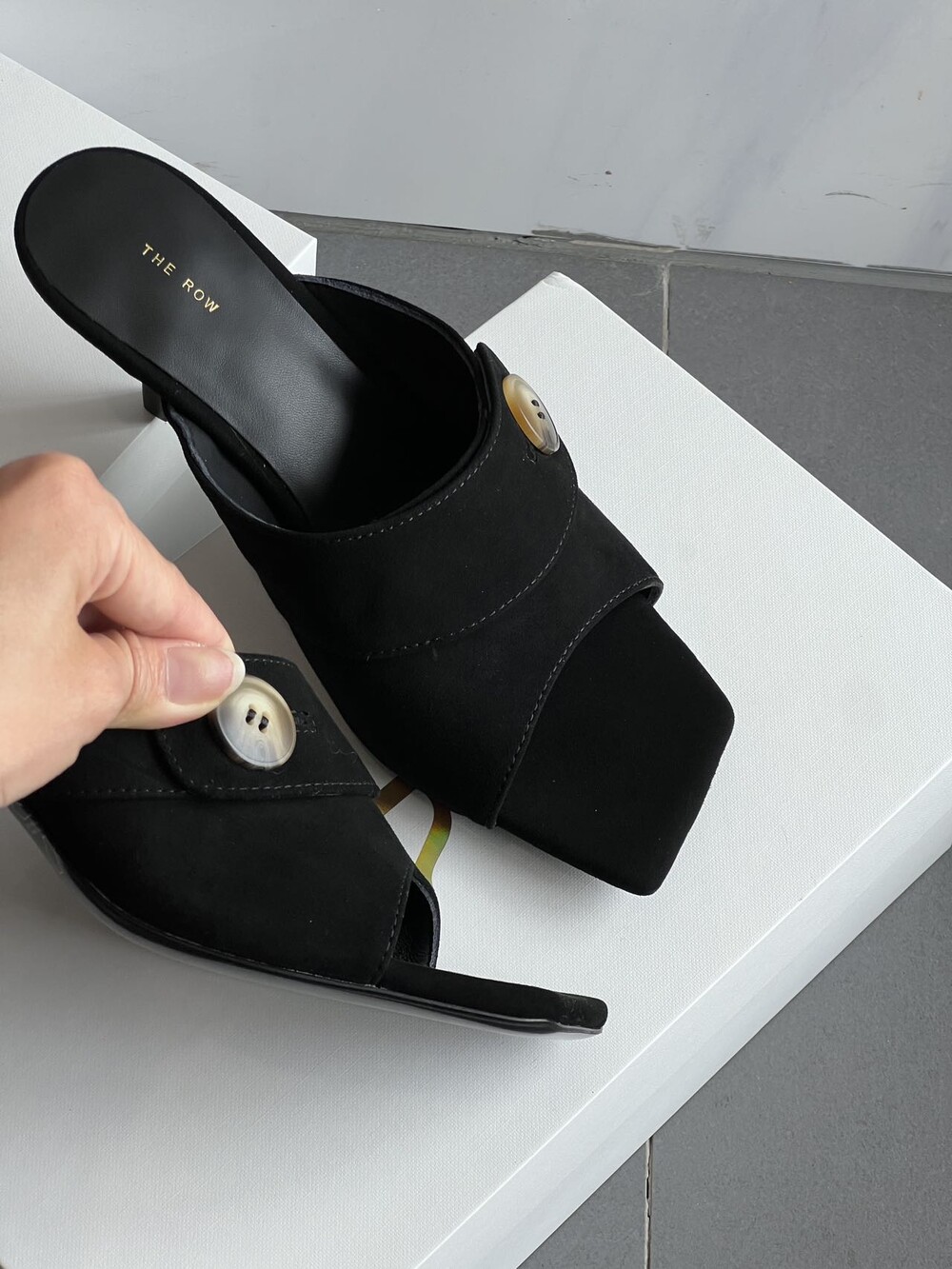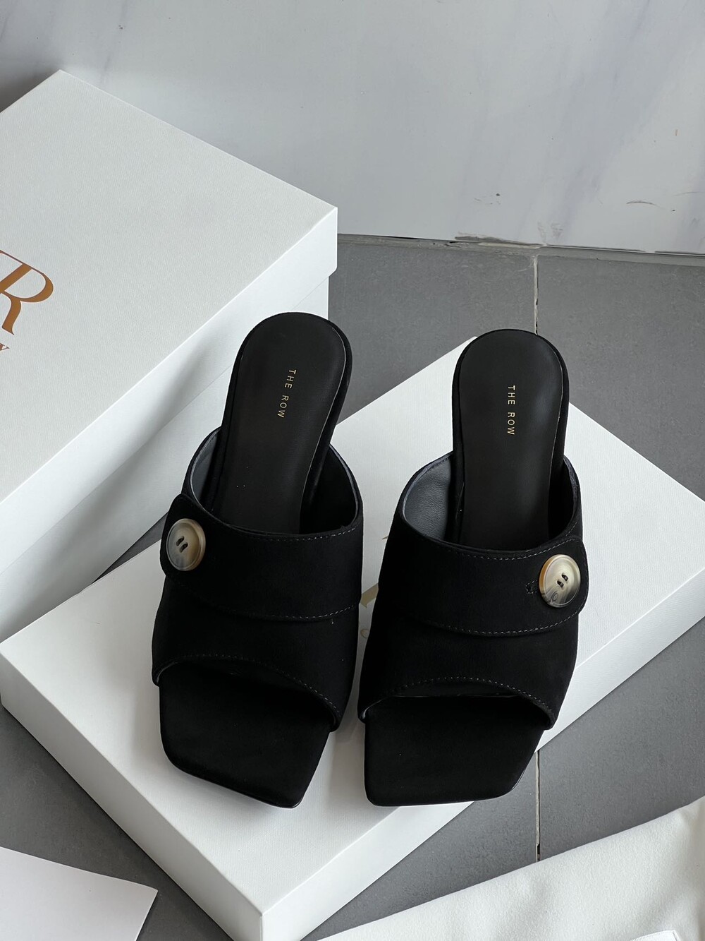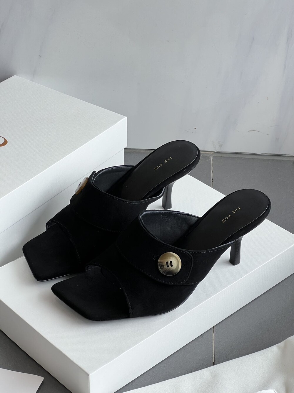 커스텀 레진 버튼: 슈즈 상단의 버튼은 수입 커스텀 레진 소재를 사용해 은은한 포인트가 되어줍니다. 작은 디테일 하나가 전체적인 무드를 완성합니다.