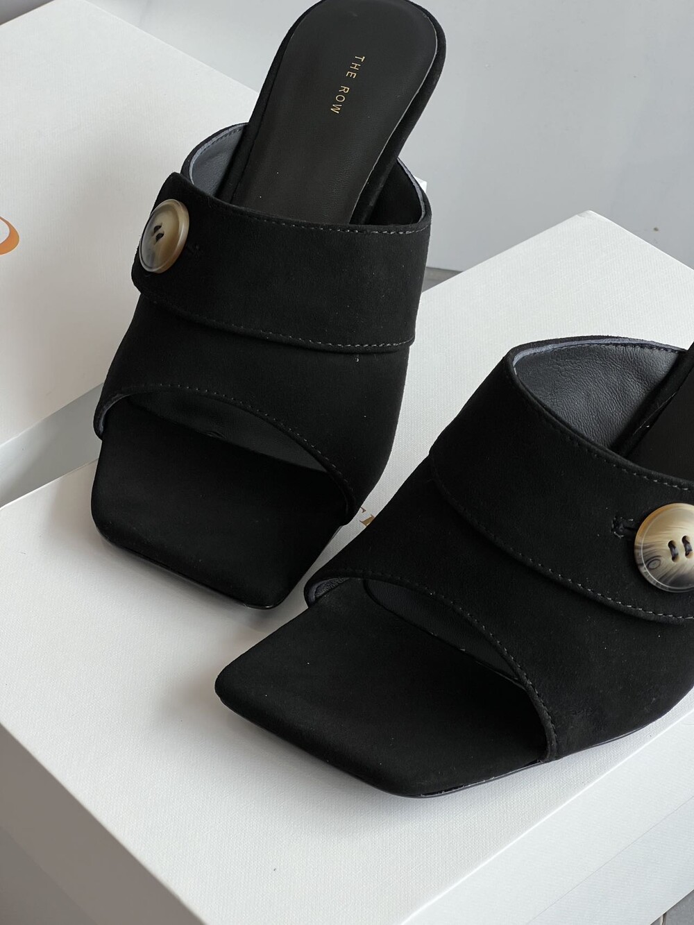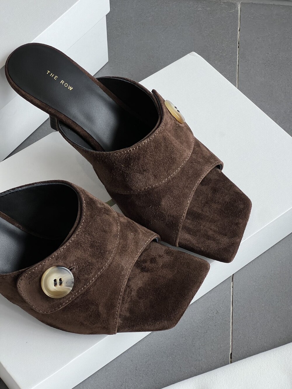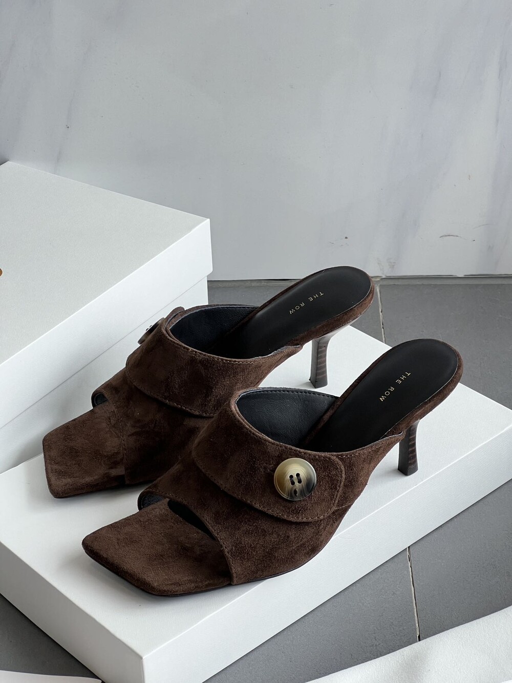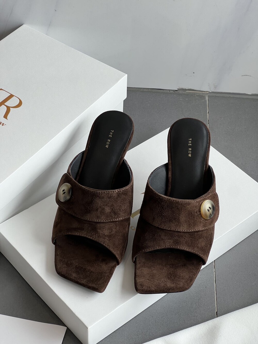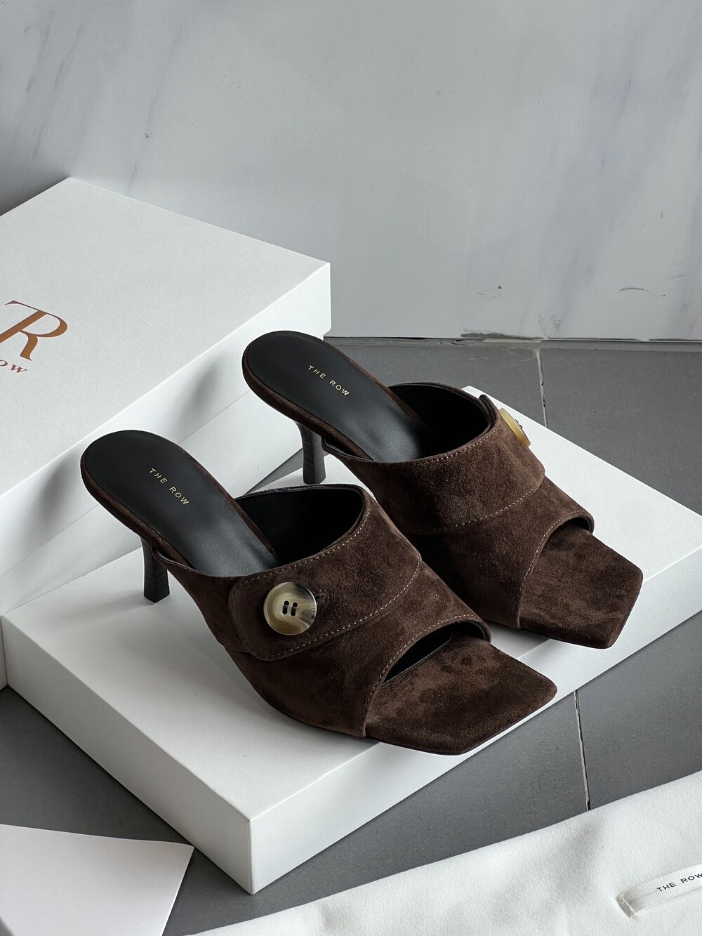 커스텀 레진 버튼: 슈즈 상단의 버튼은 수입 커스텀 레진 소재를 사용해 은은한 포인트가 되어줍니다. 작은 디테일 하나가 전체적인 무드를 완성합니다.