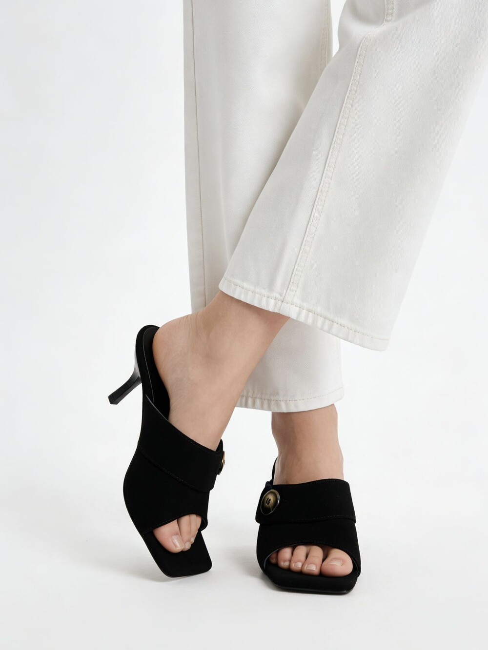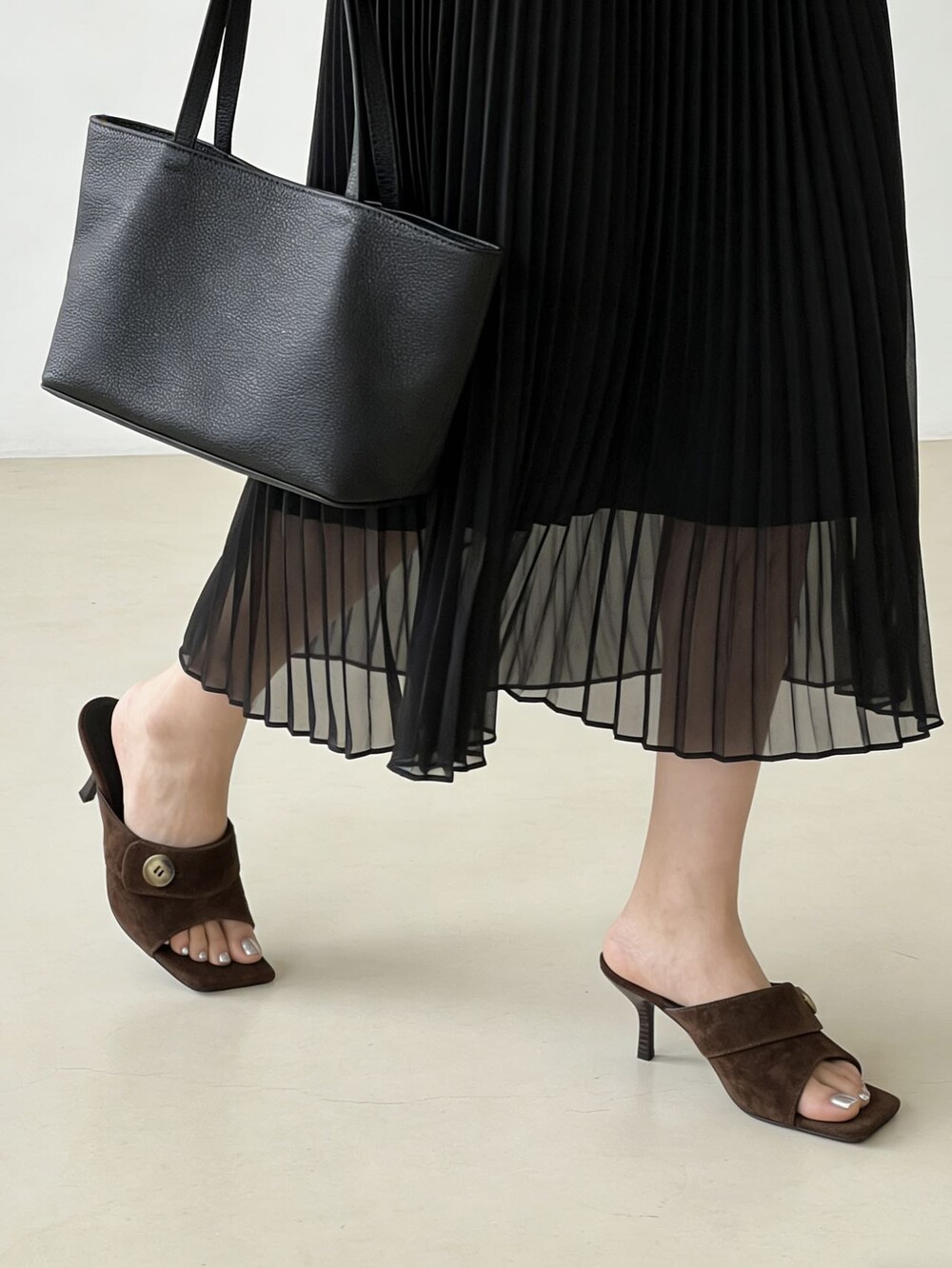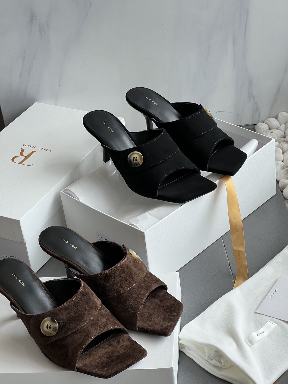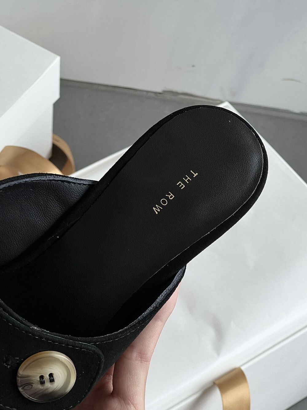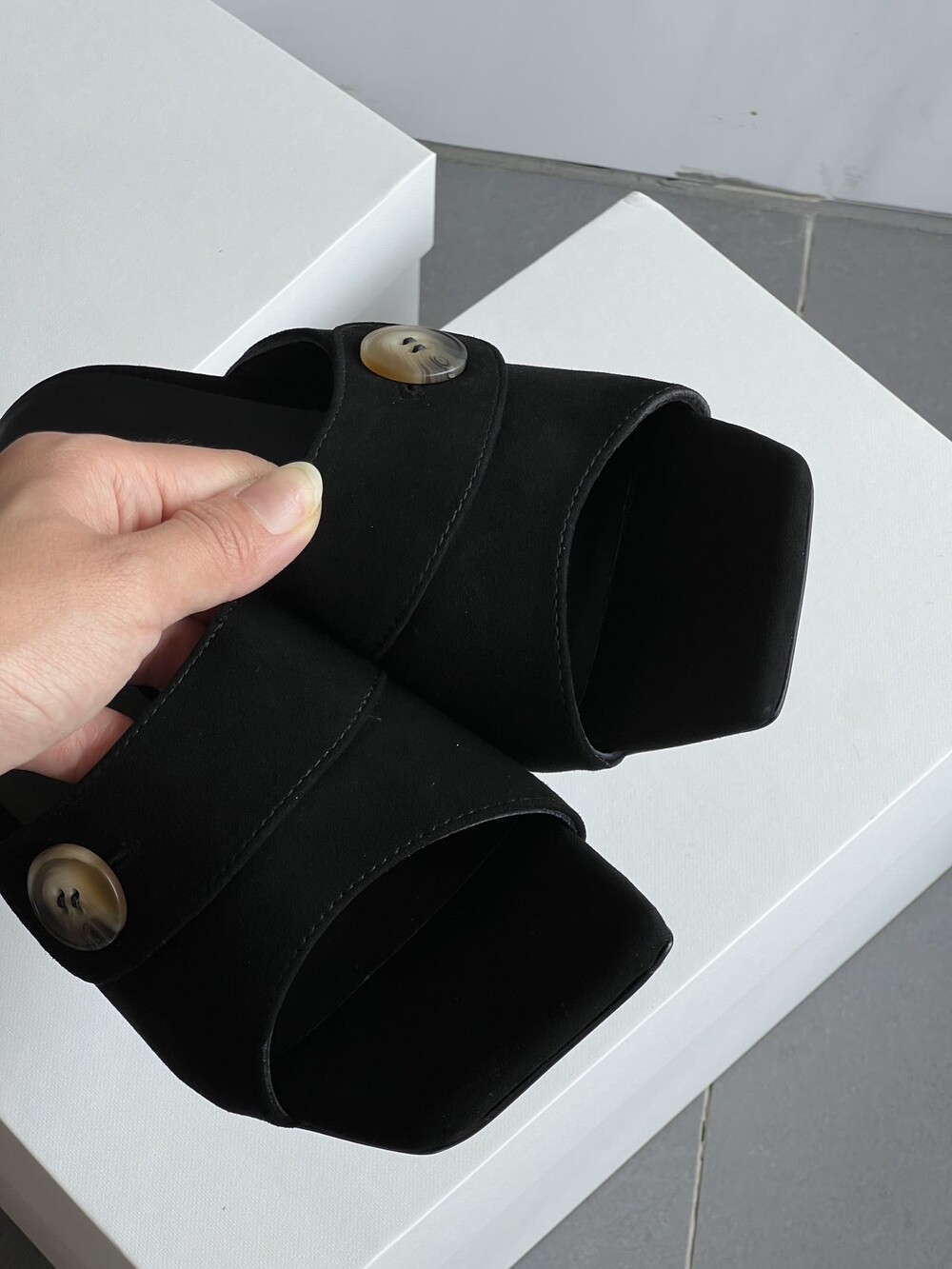 커스텀 레진 버튼: 슈즈 상단의 버튼은 수입 커스텀 레진 소재를 사용해 은은한 포인트가 되어줍니다. 작은 디테일 하나가 전체적인 무드를 완성합니다.