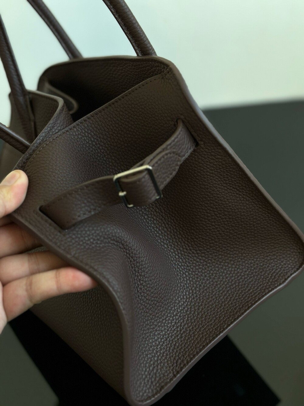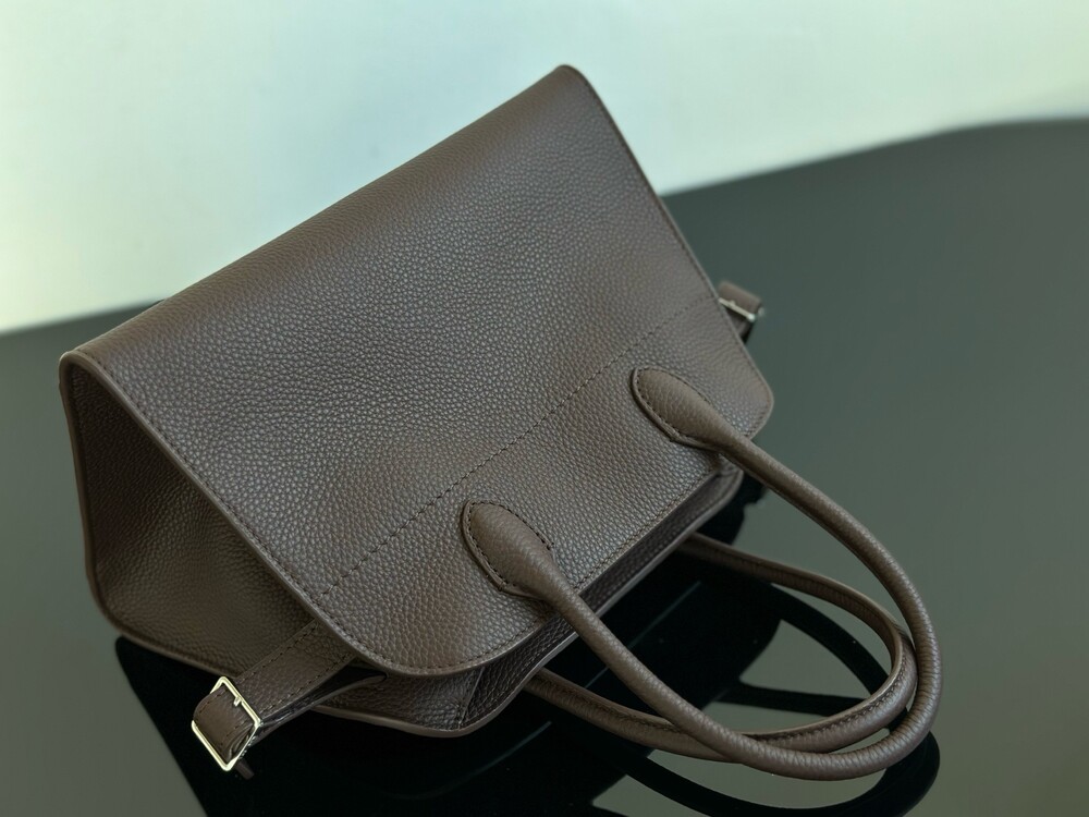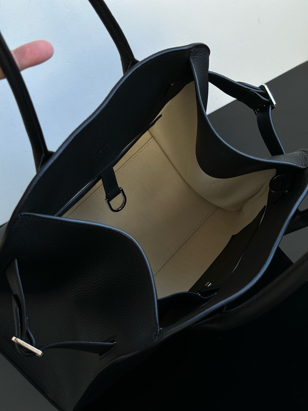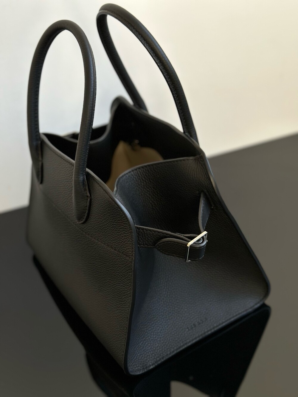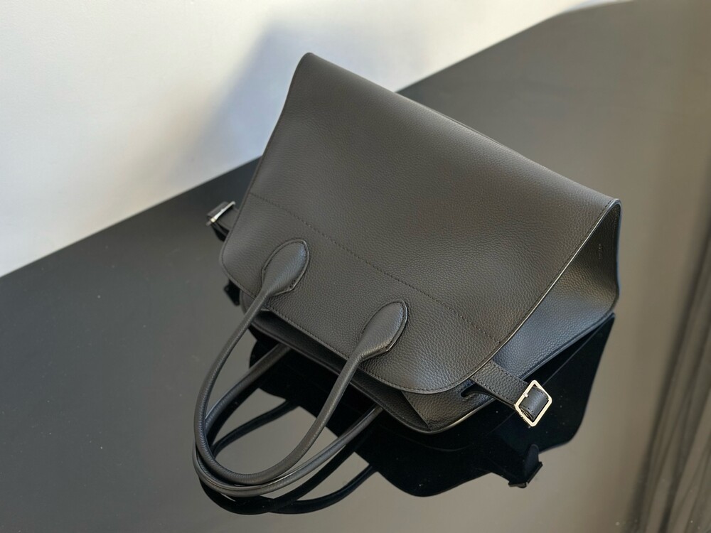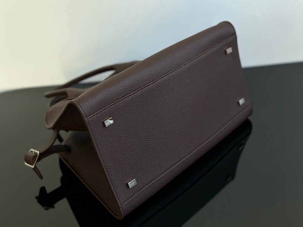 매트 그레인 카프스킨 가죽 소재의 소프트 스트럭처 탑 핸들 백. 벨트가 장식된 사이드 거싯 패널 및 내부 토글 클로저.