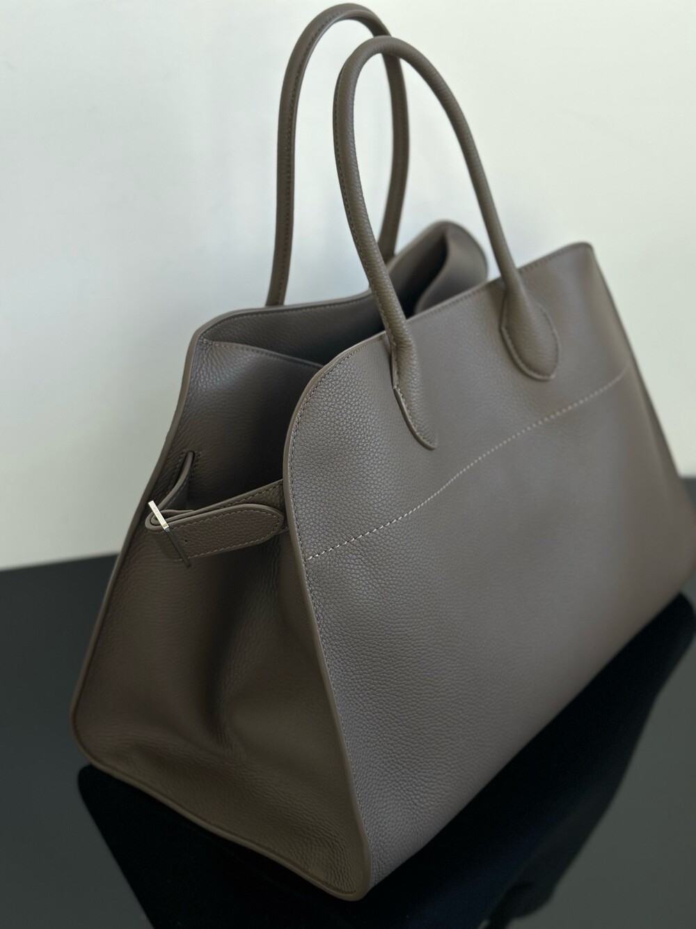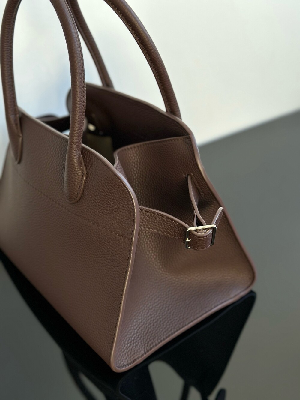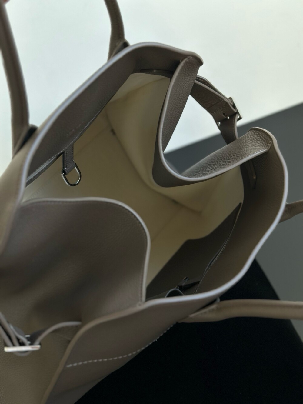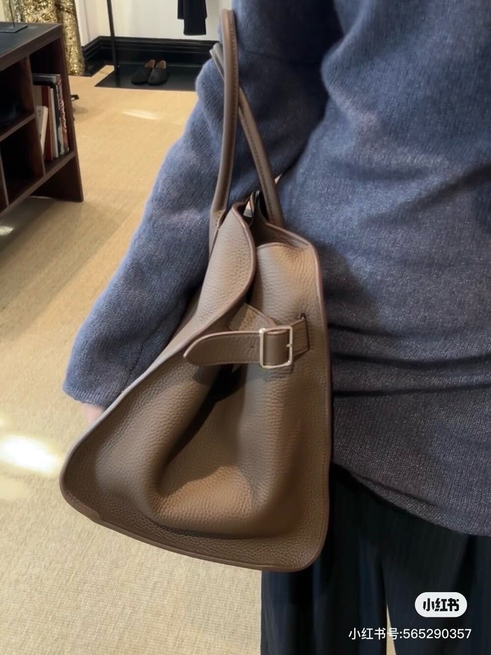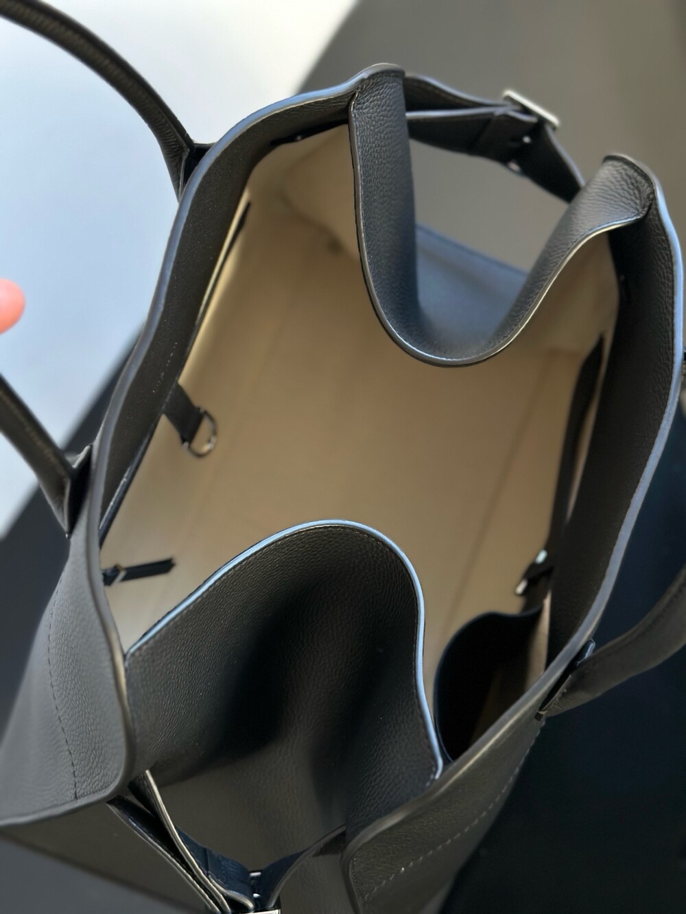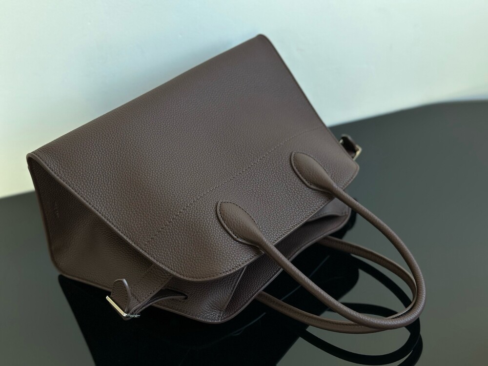매트 그레인 카프스킨 가죽 소재의 소프트 스트럭처 탑 핸들 백. 벨트가 장식된 사이드 거싯 패널 및 내부 토글 클로저.