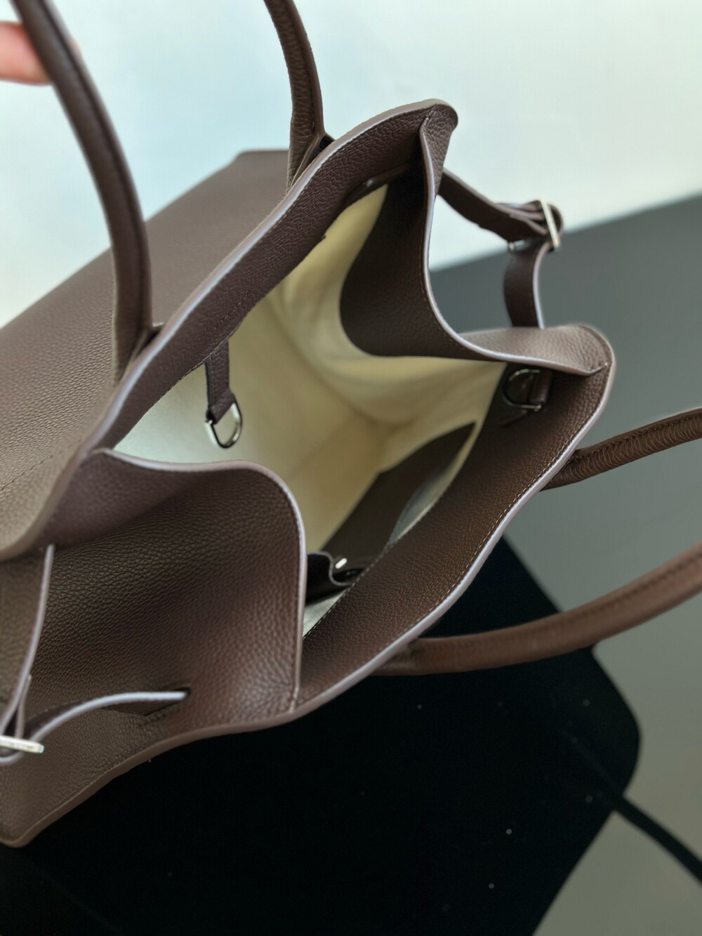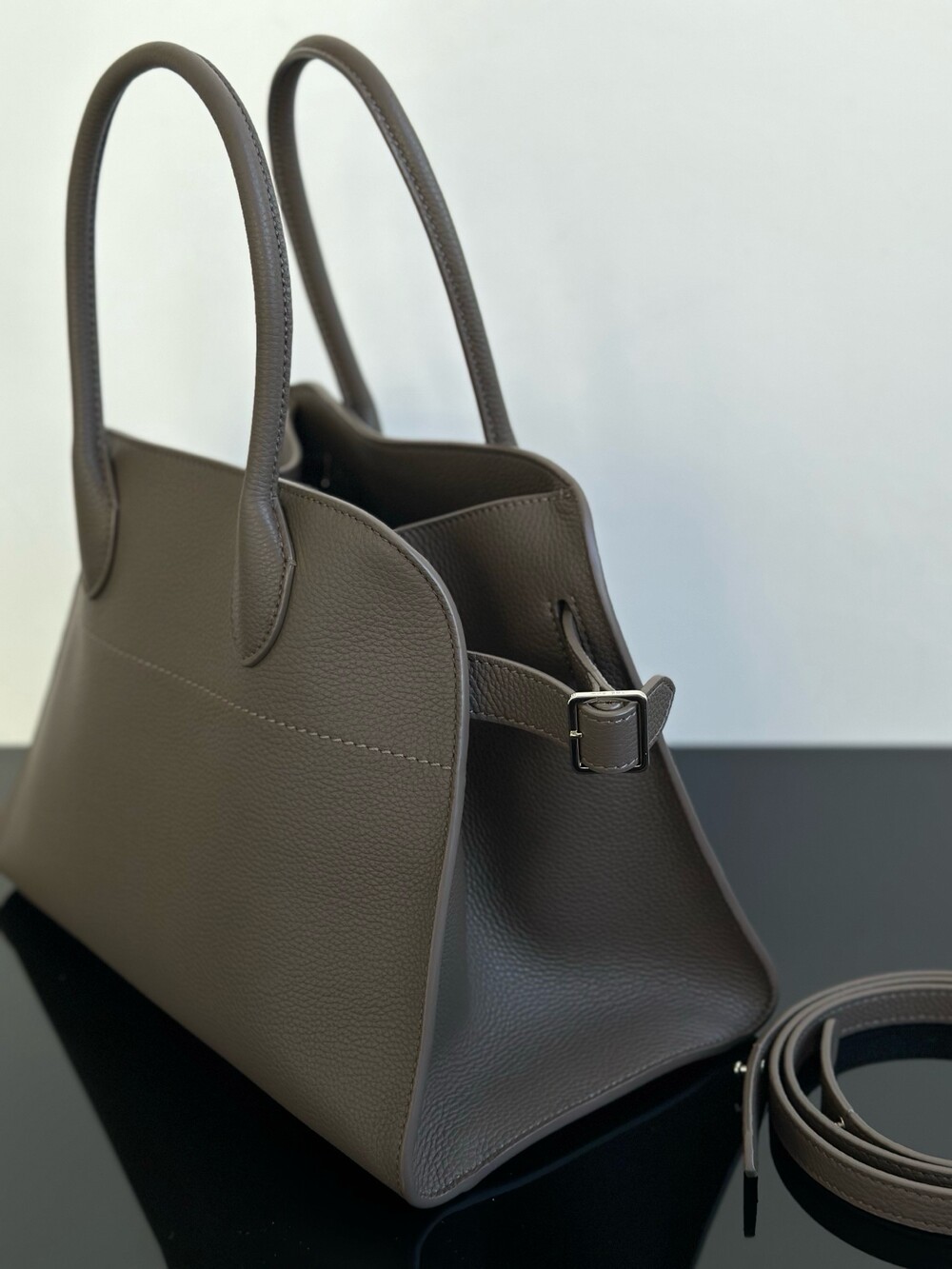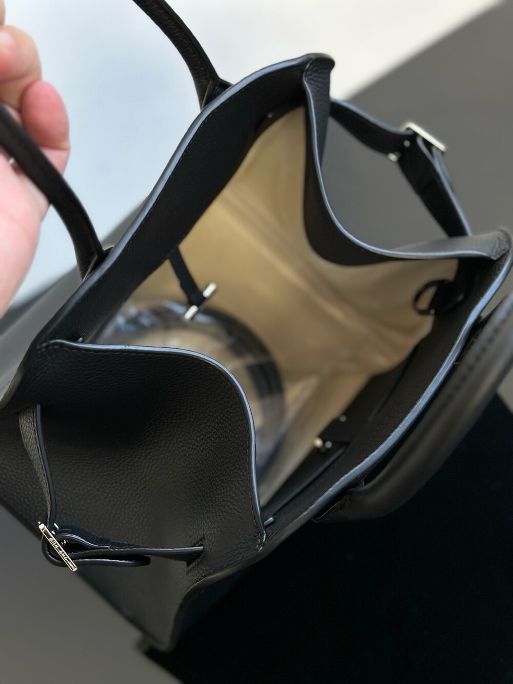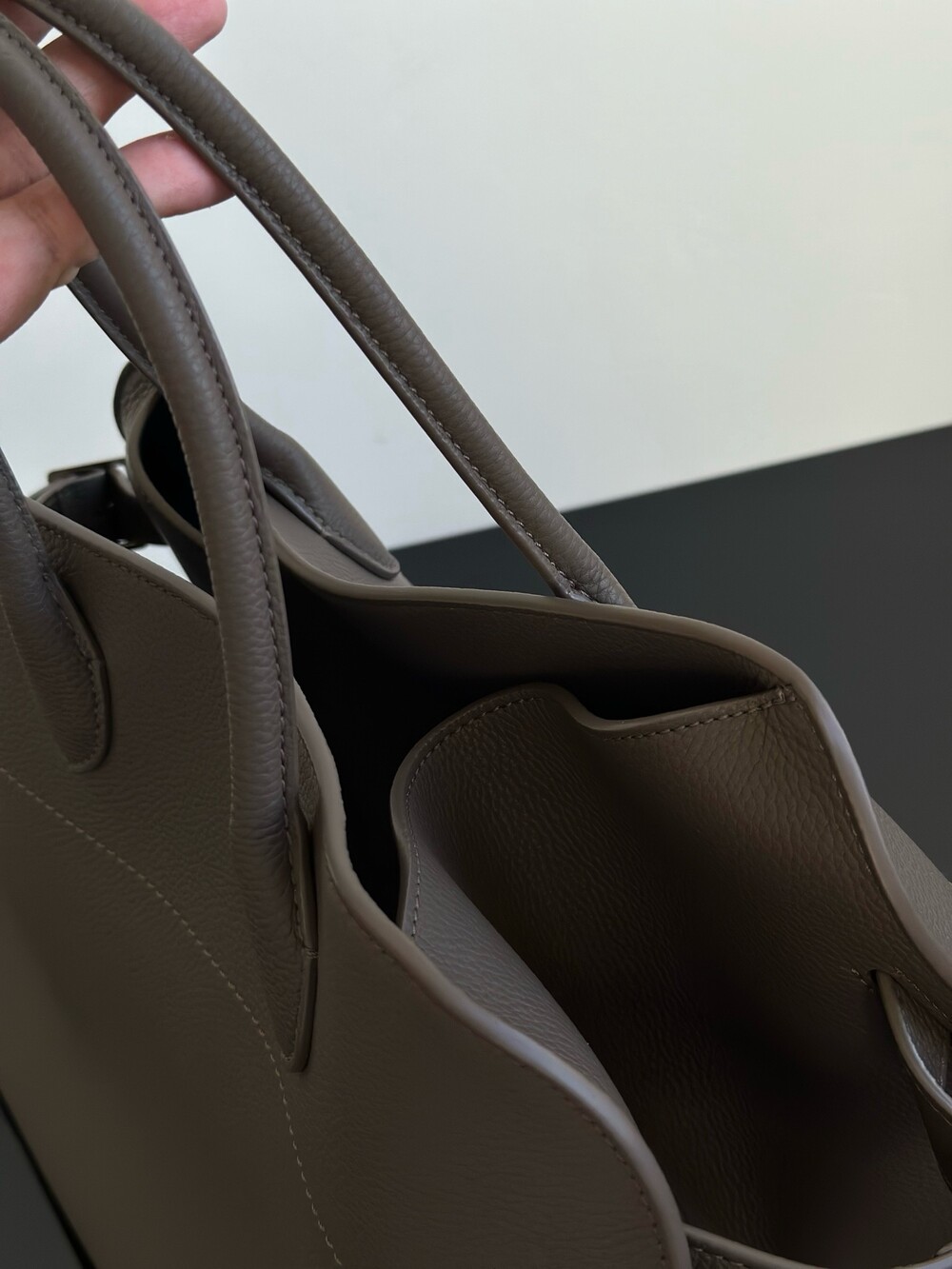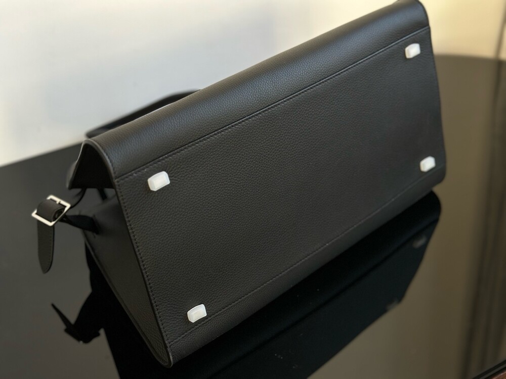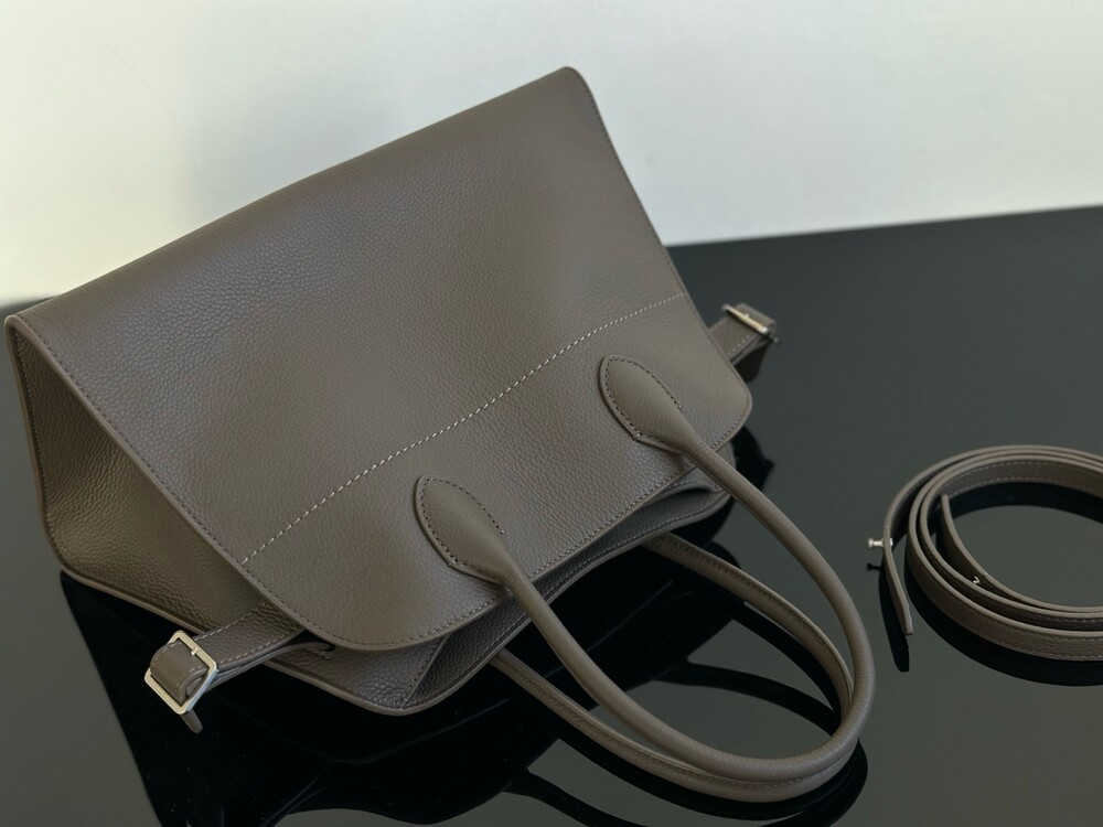 매트 그레인 카프스킨 가죽 소재의 소프트 스트럭처 탑 핸들 백. 벨트가 장식된 사이드 거싯 패널 및 내부 토글 클로저.