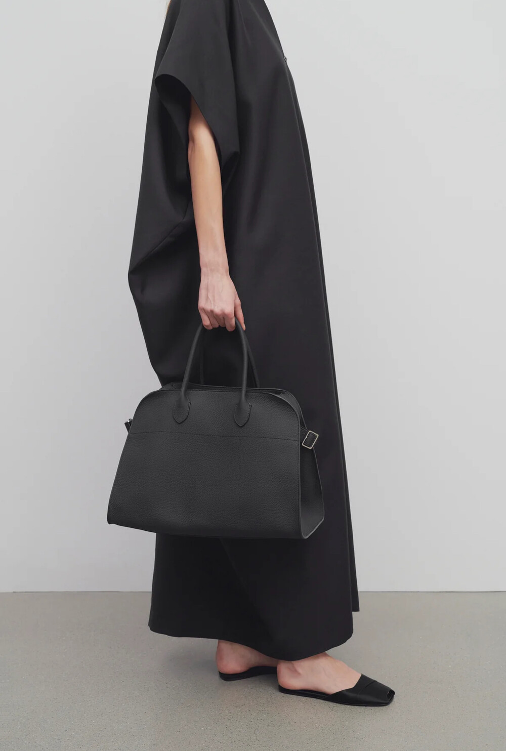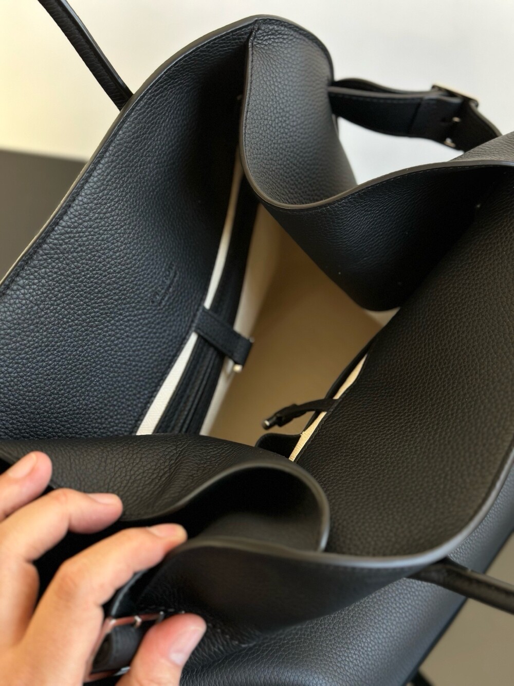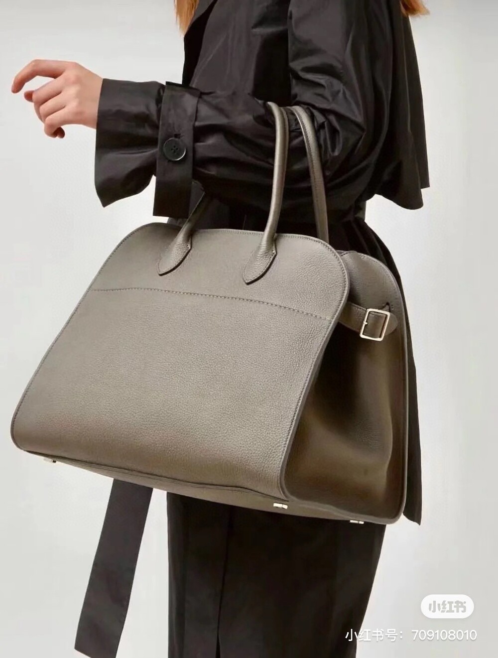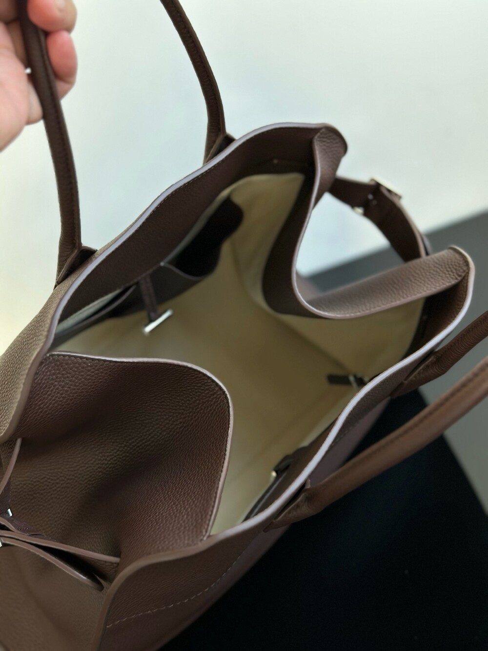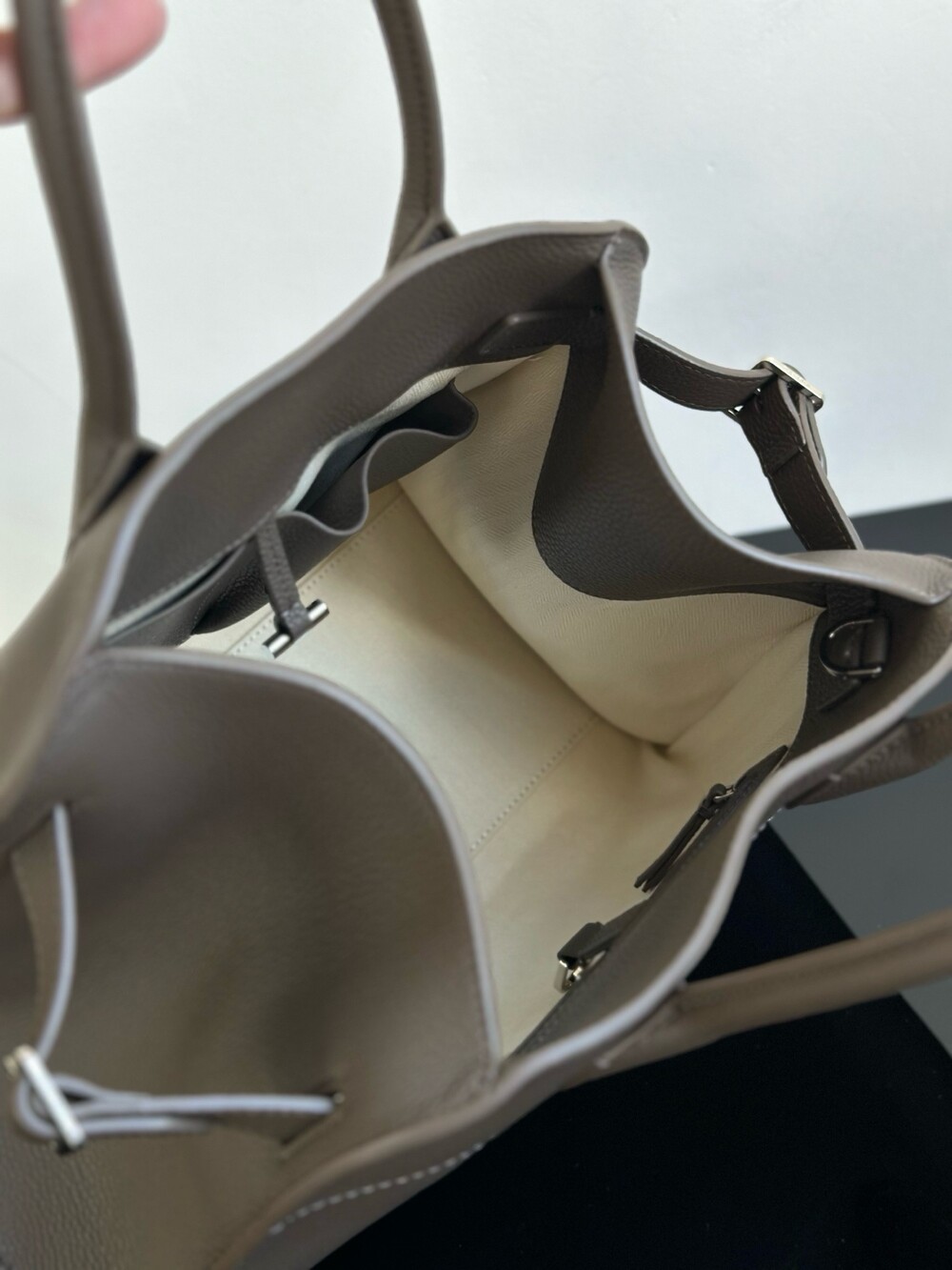 매트 그레인 카프스킨 가죽 소재의 소프트 스트럭처 탑 핸들 백. 벨트가 장식된 사이드 거싯 패널 및 내부 토글 클로저.