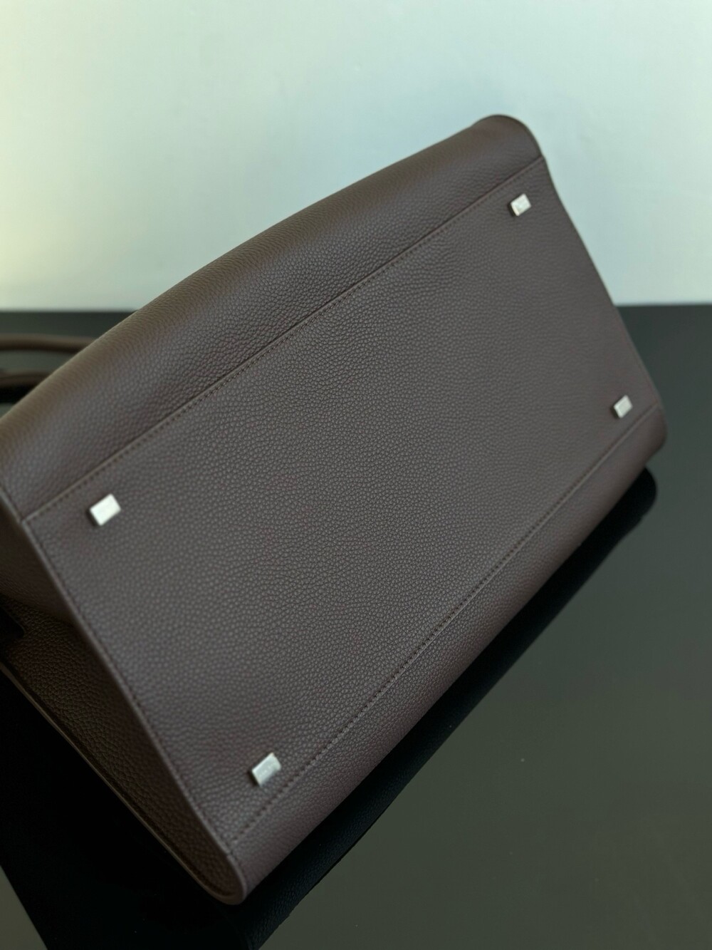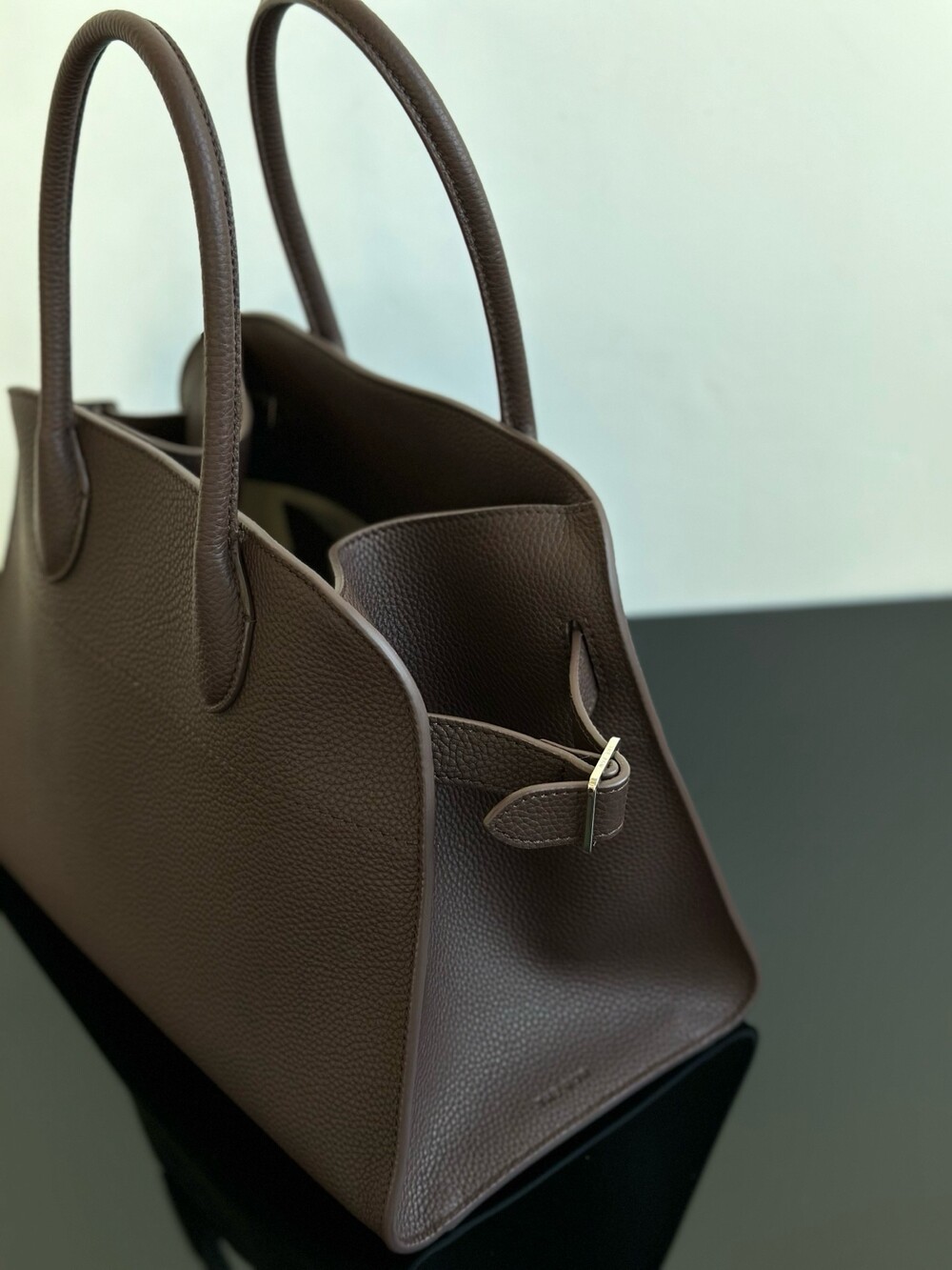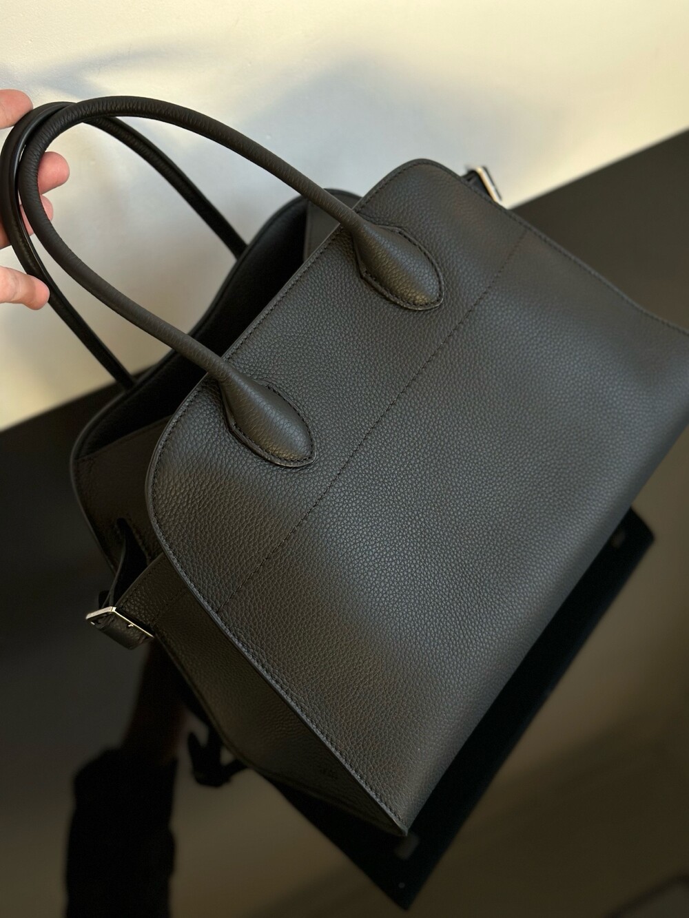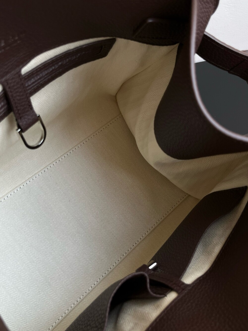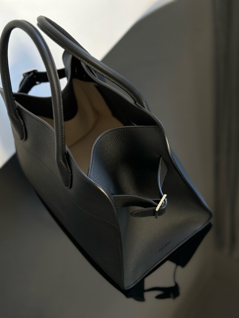 매트 그레인 카프스킨 가죽 소재의 소프트 스트럭처 탑 핸들 백. 벨트가 장식된 사이드 거싯 패널 및 내부 토글 클로저.