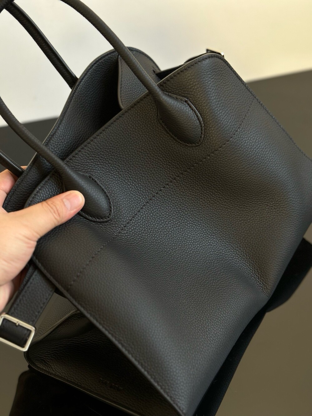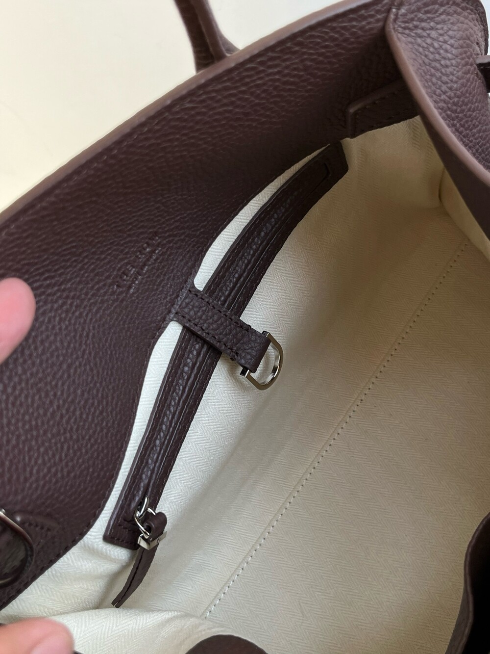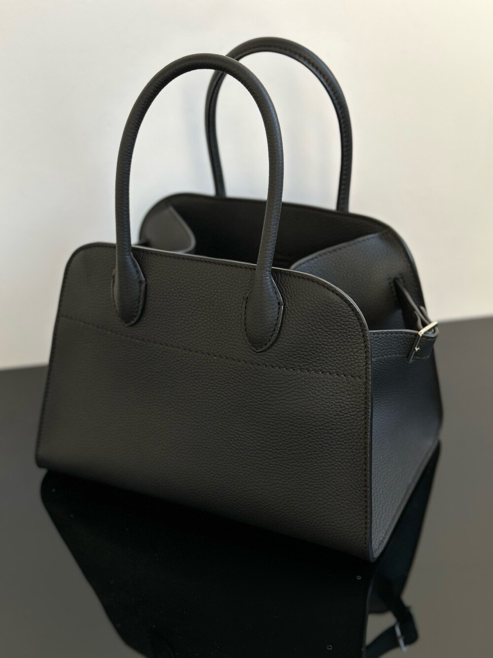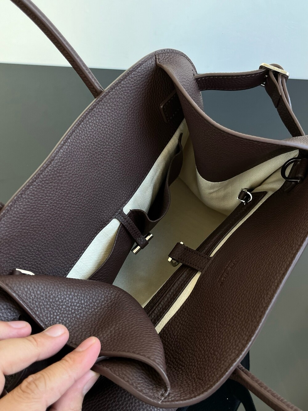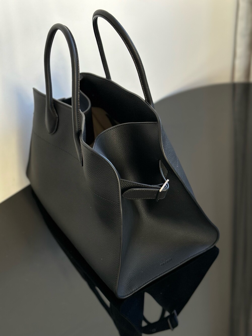 매트 그레인 카프스킨 가죽 소재의 소프트 스트럭처 탑 핸들 백. 벨트가 장식된 사이드 거싯 패널 및 내부 토글 클로저.