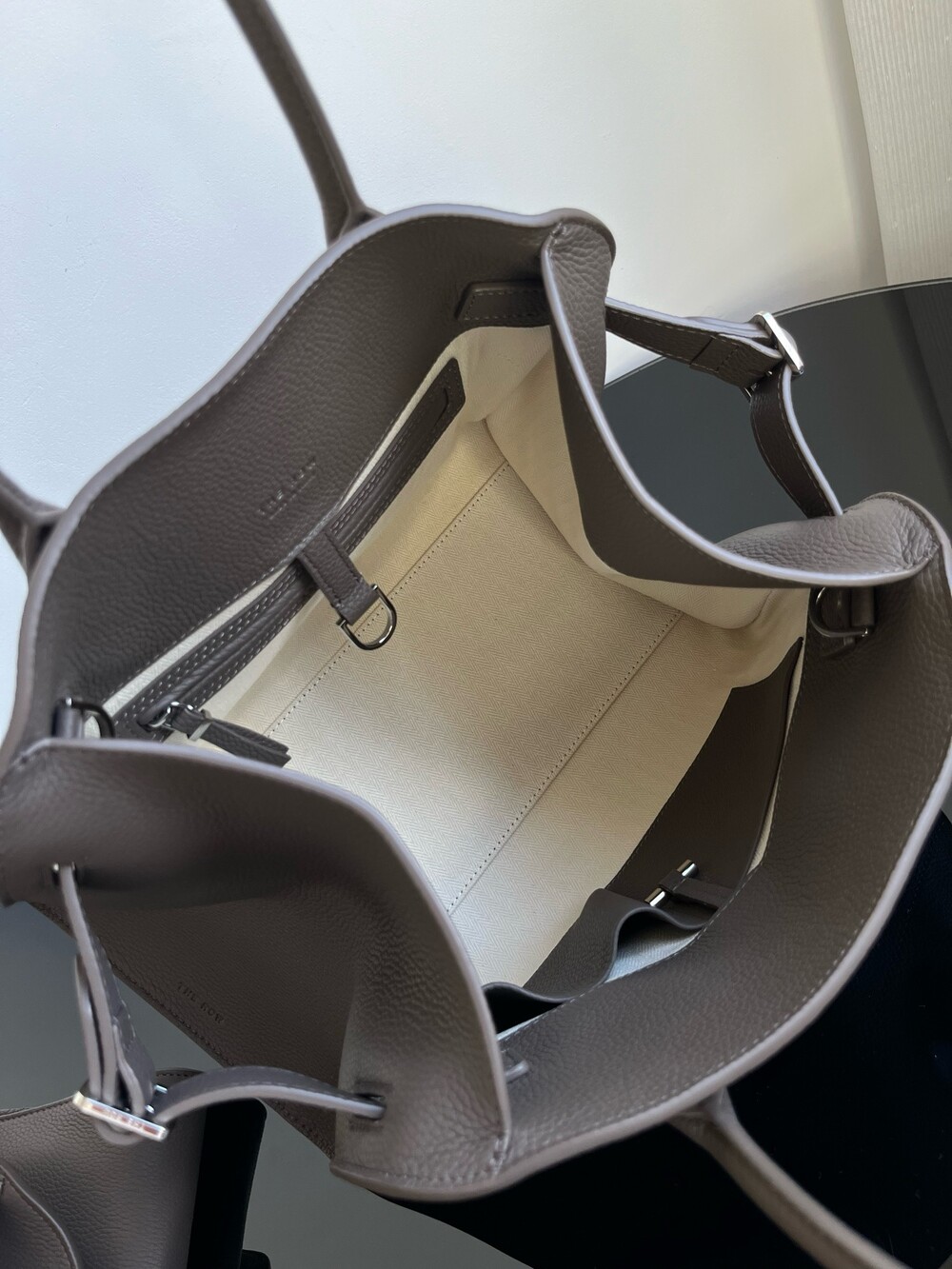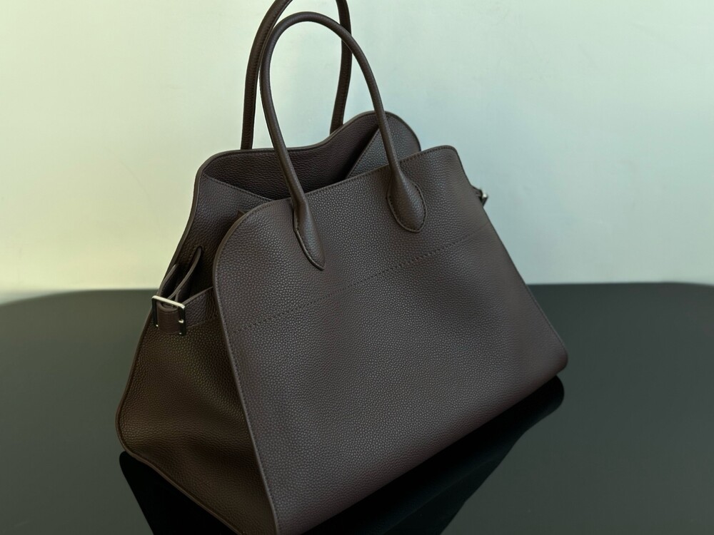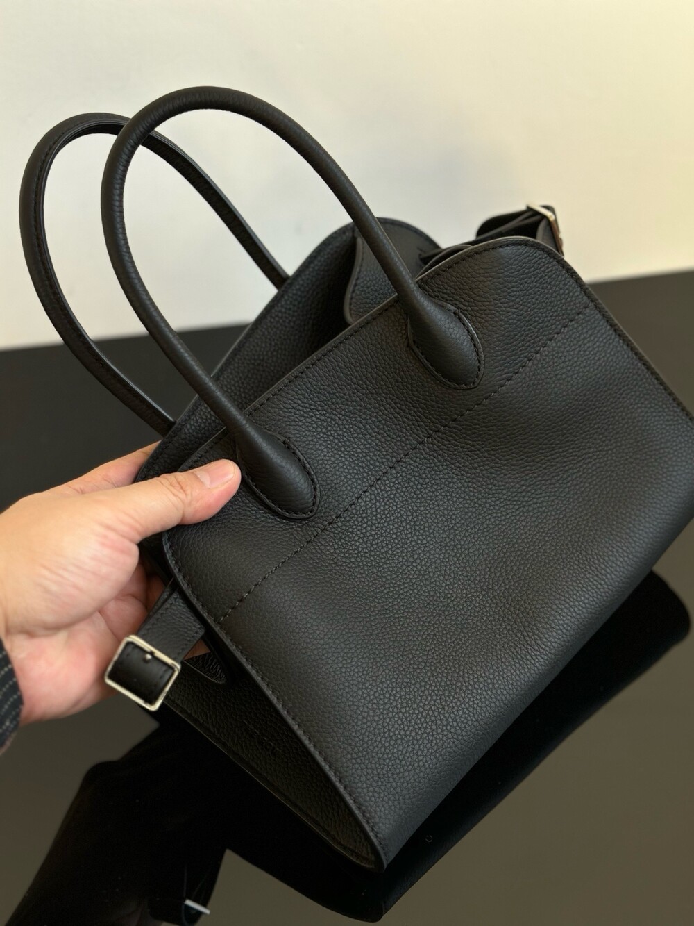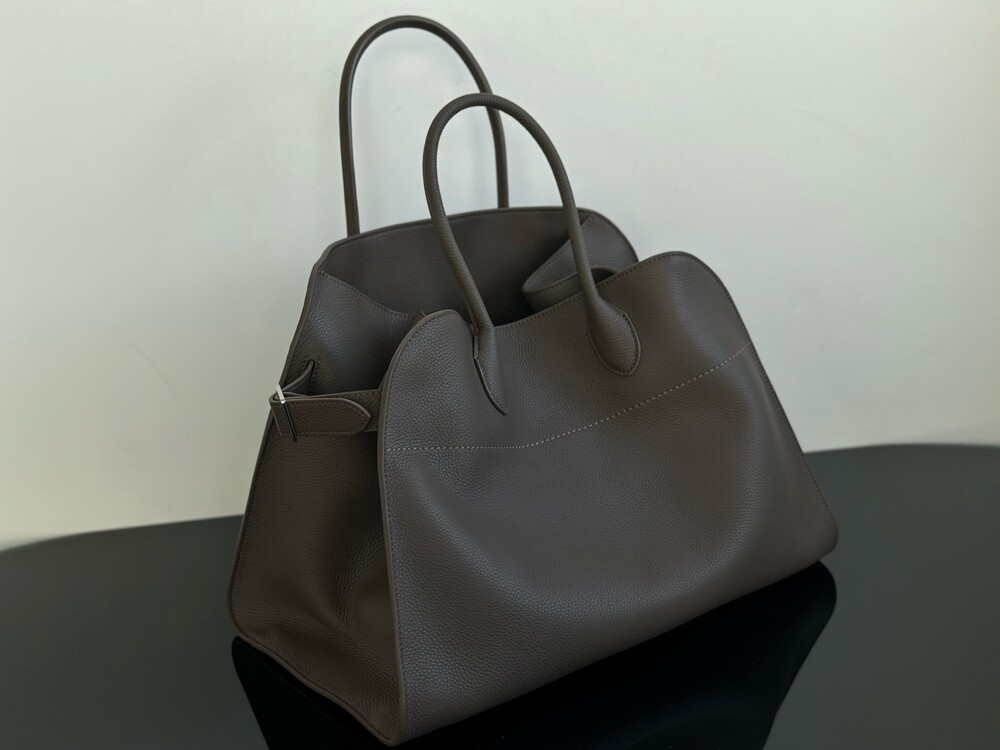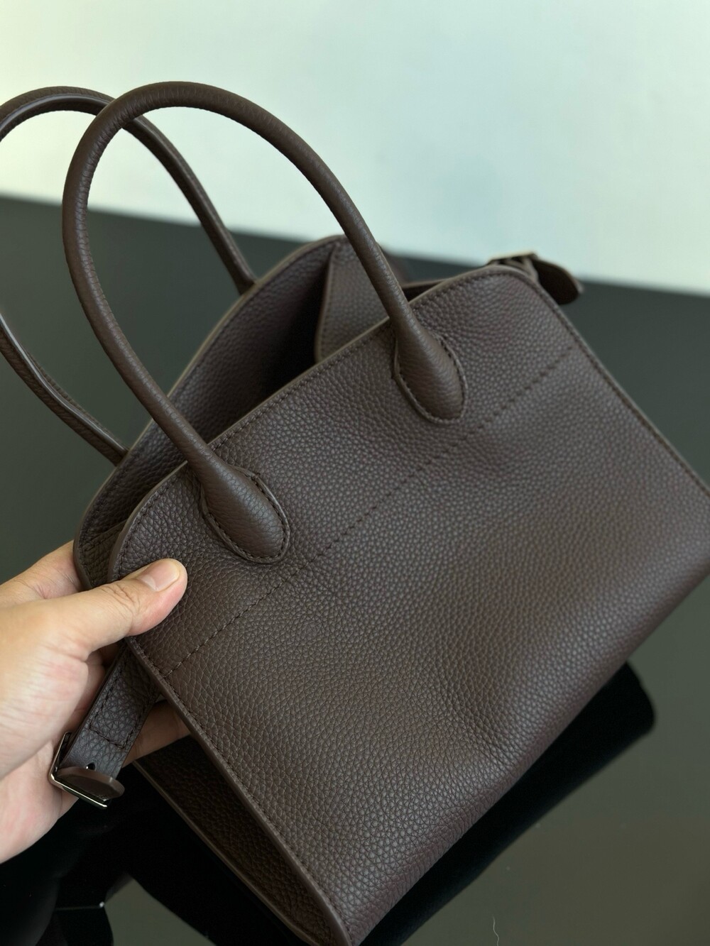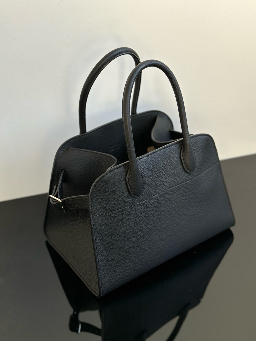 매트 그레인 카프스킨 가죽 소재의 소프트 스트럭처 탑 핸들 백. 벨트가 장식된 사이드 거싯 패널 및 내부 토글 클로저.