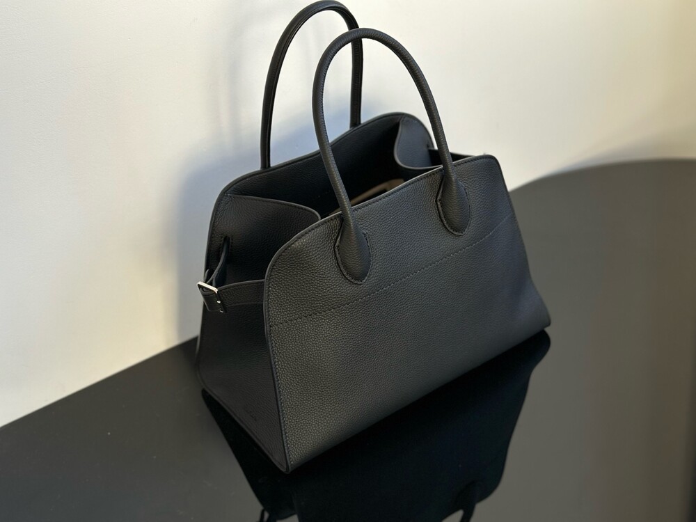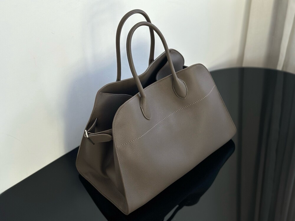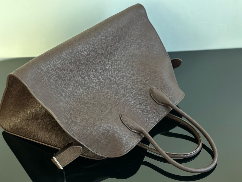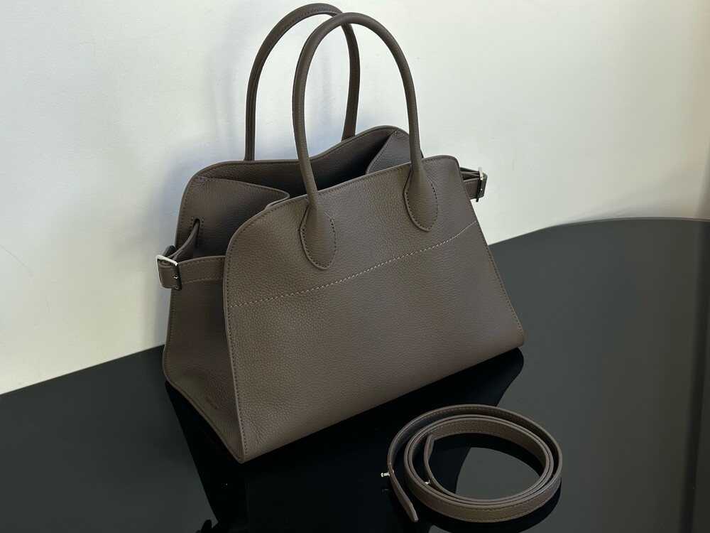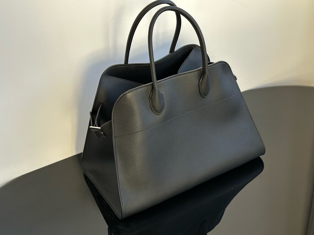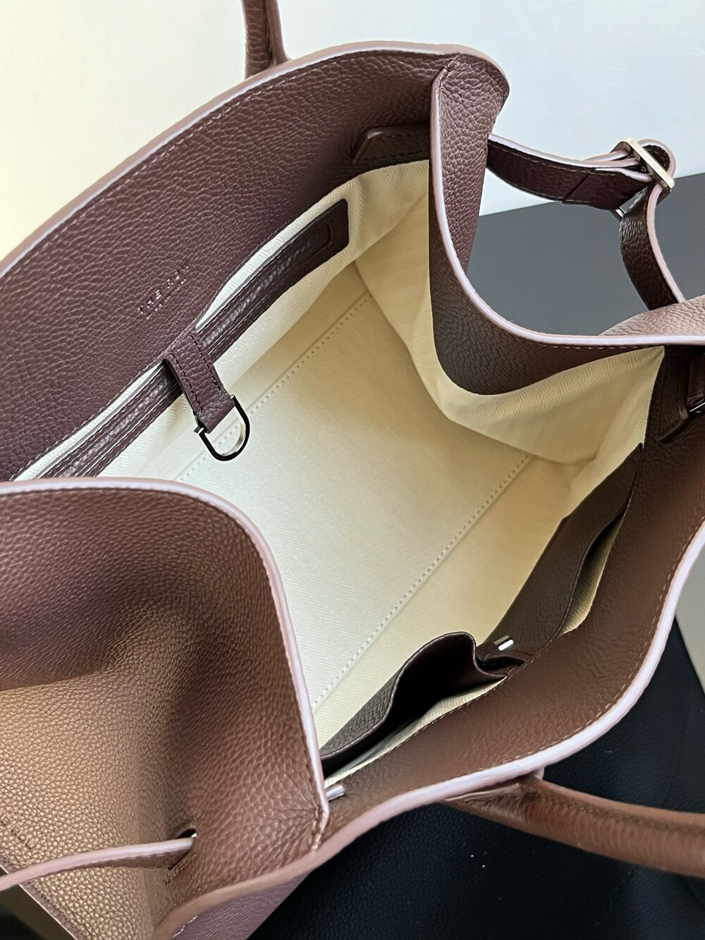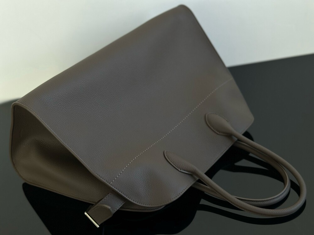 매트 그레인 카프스킨 가죽 소재의 소프트 스트럭처 탑 핸들 백. 벨트가 장식된 사이드 거싯 패널 및 내부 토글 클로저.