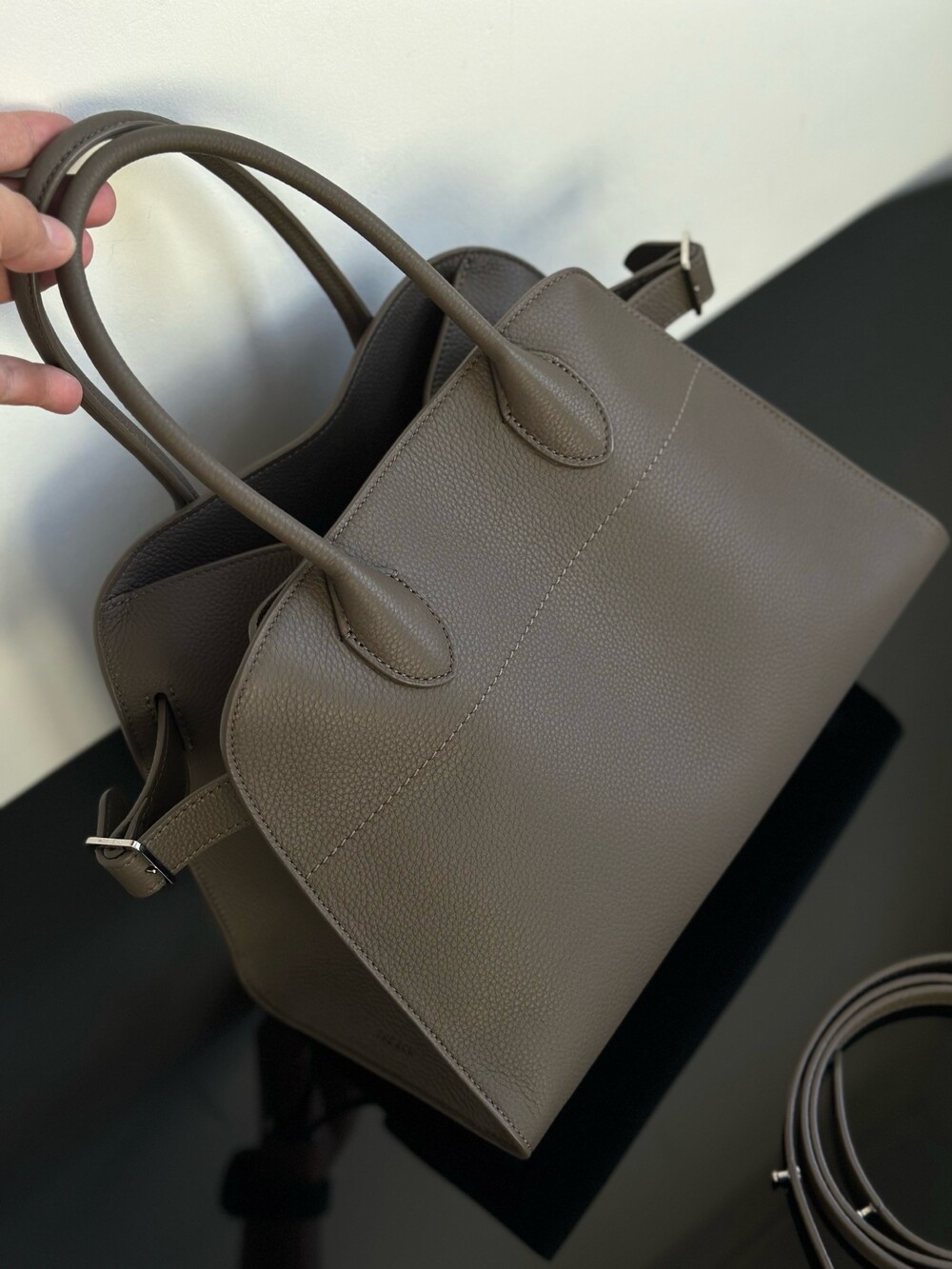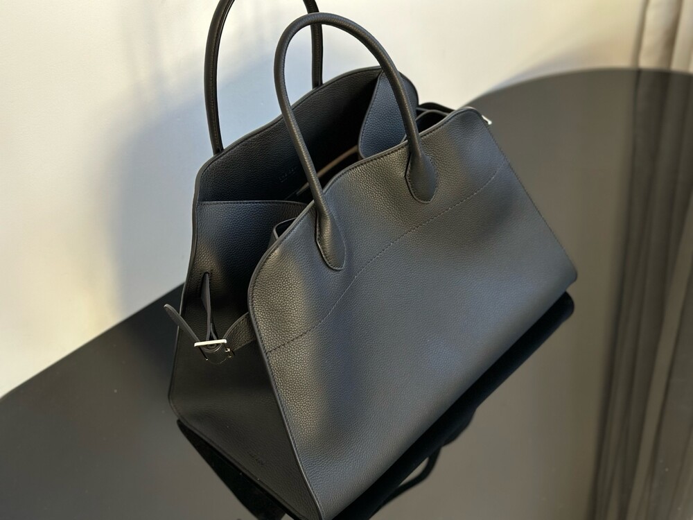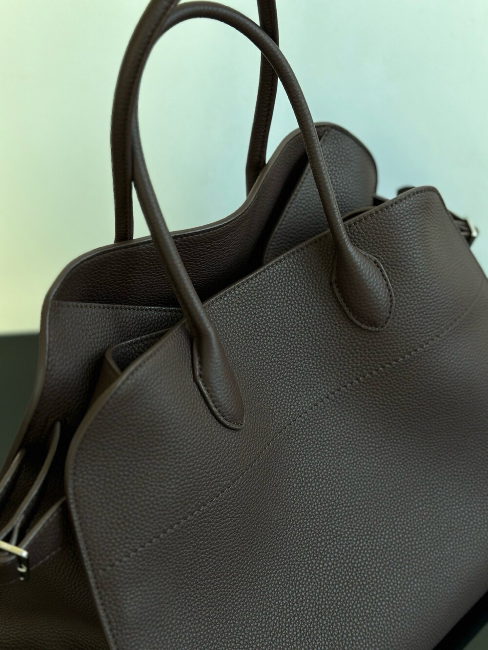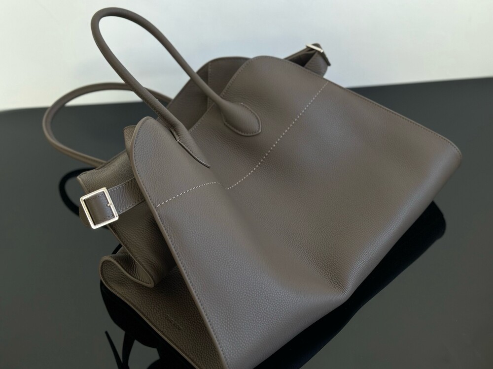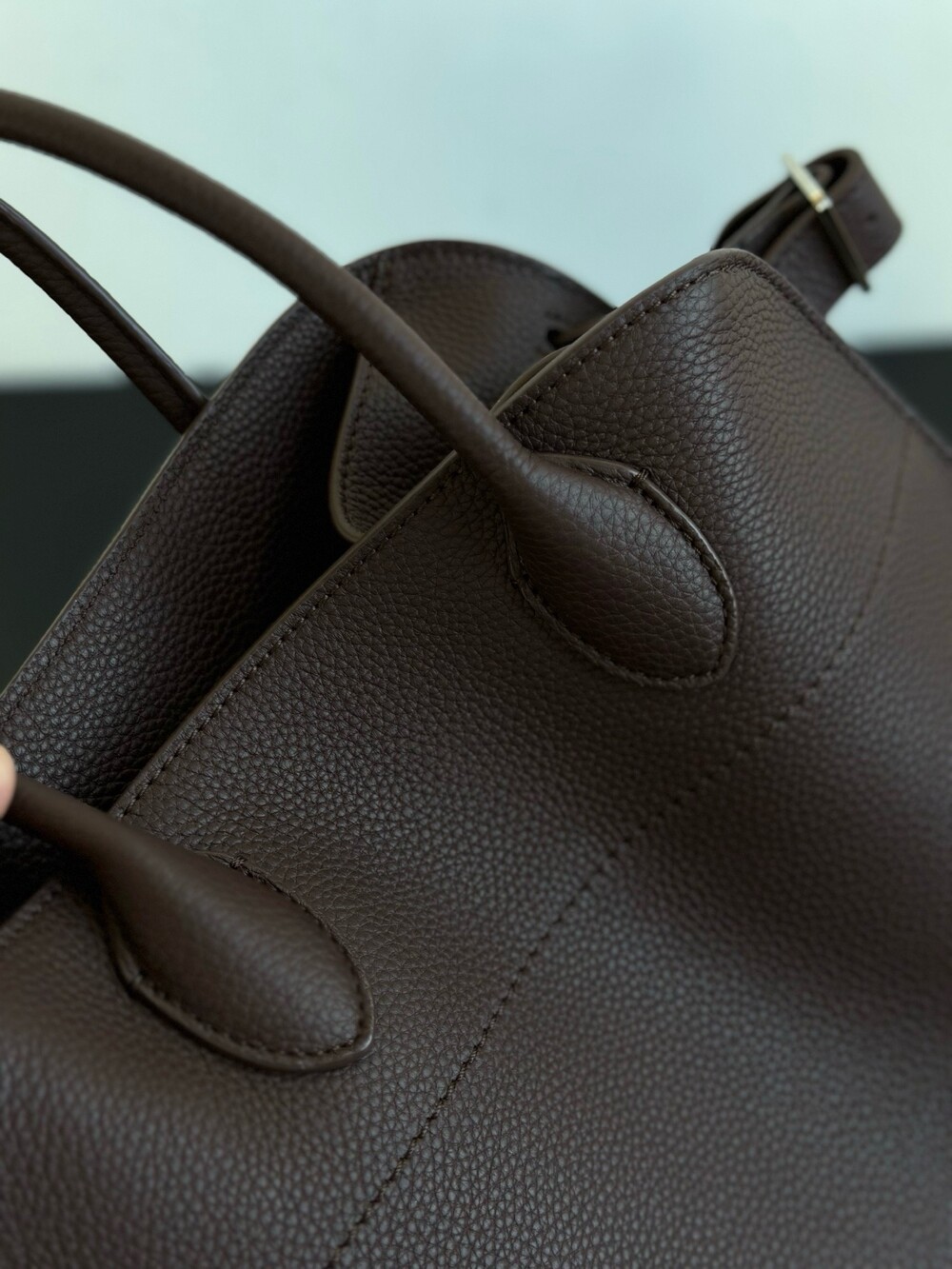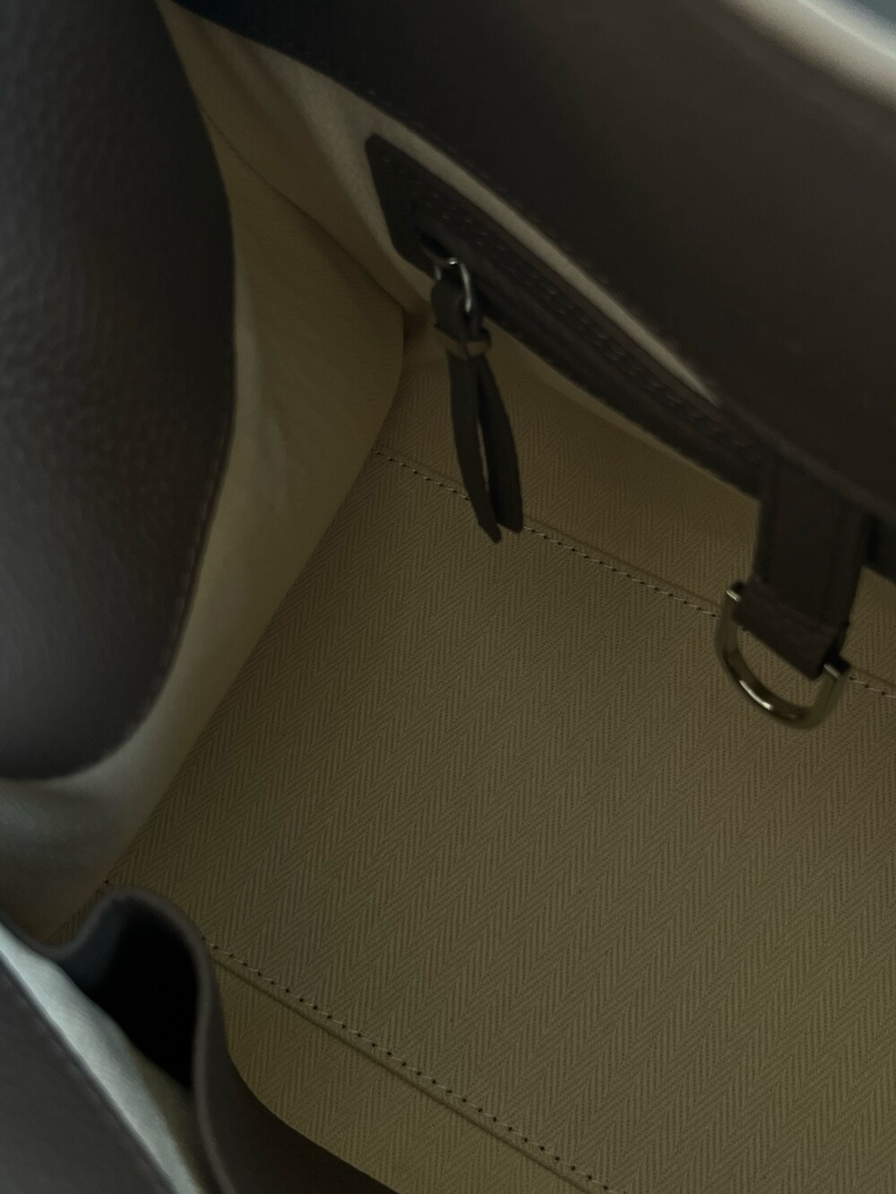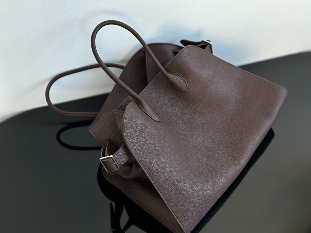 매트 그레인 카프스킨 가죽 소재의 소프트 스트럭처 탑 핸들 백. 벨트가 장식된 사이드 거싯 패널 및 내부 토글 클로저.