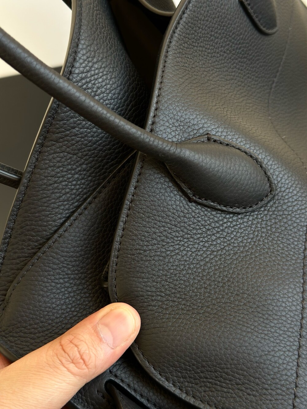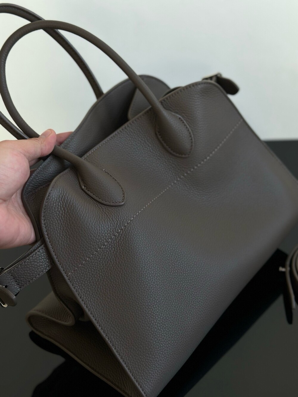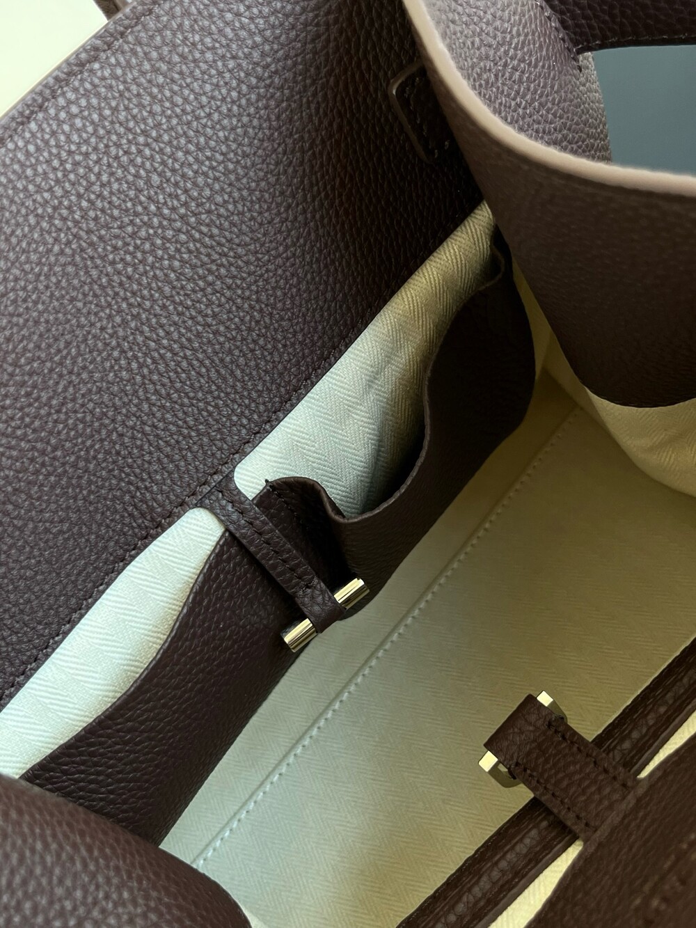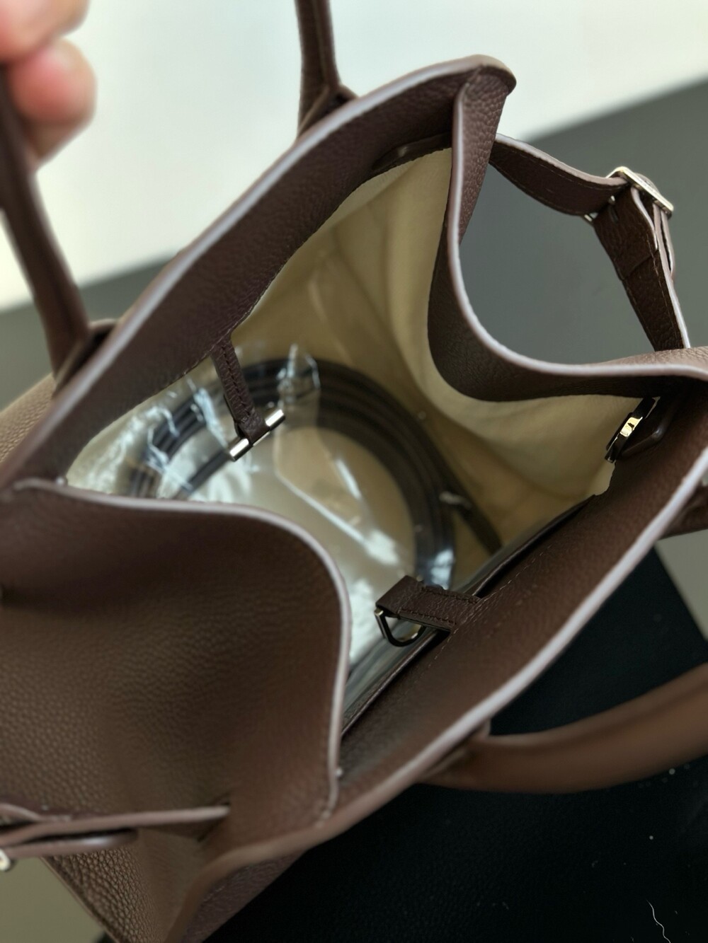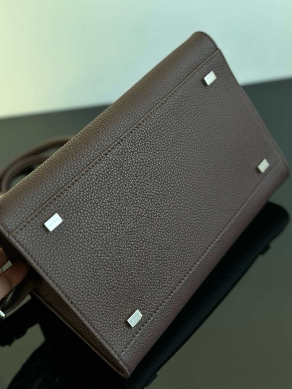 매트 그레인 카프스킨 가죽 소재의 소프트 스트럭처 탑 핸들 백. 벨트가 장식된 사이드 거싯 패널 및 내부 토글 클로저.