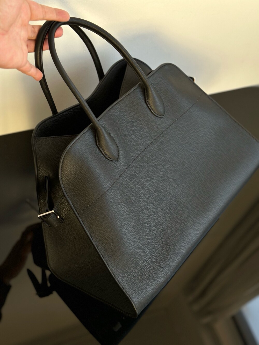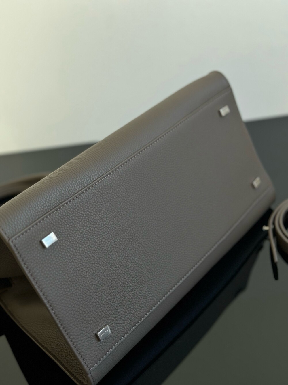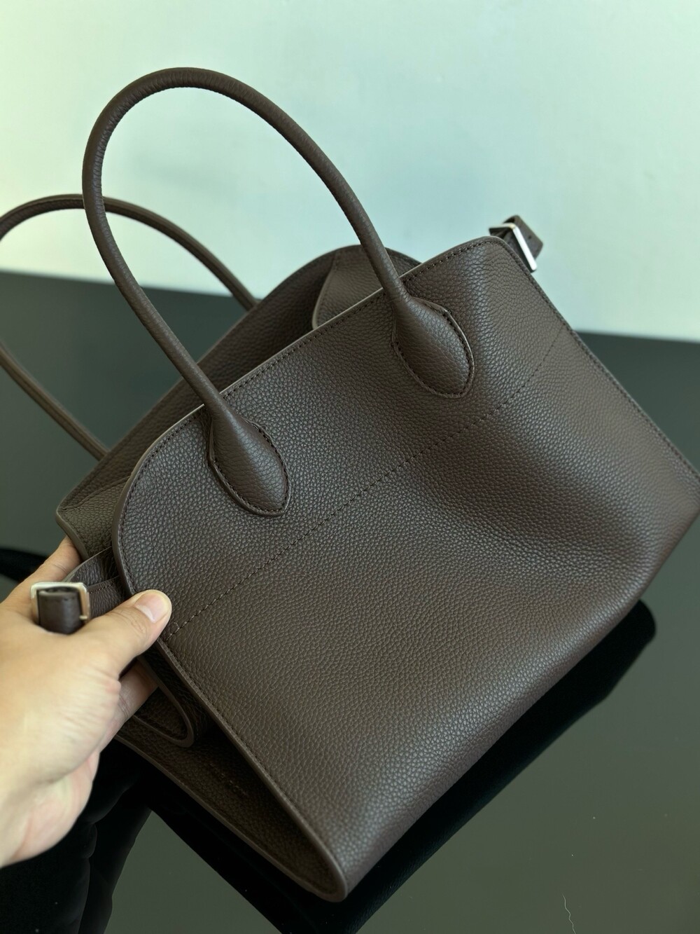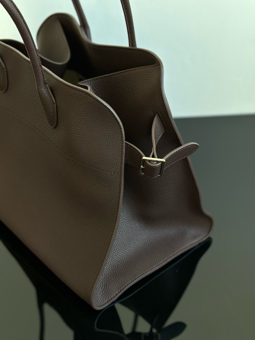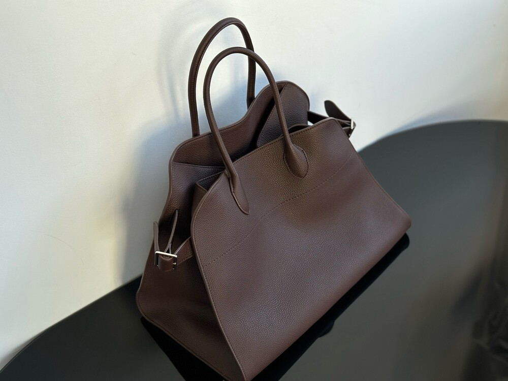 매트 그레인 카프스킨 가죽 소재의 소프트 스트럭처 탑 핸들 백. 벨트가 장식된 사이드 거싯 패널 및 내부 토글 클로저.