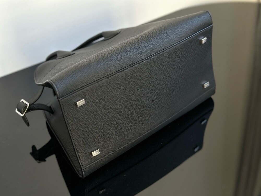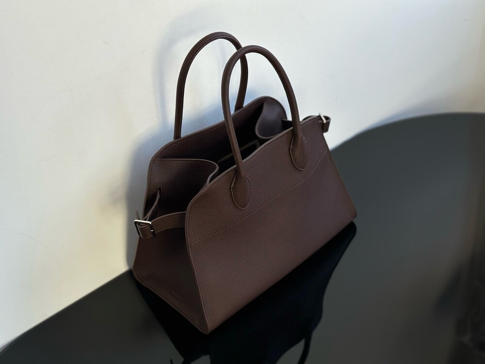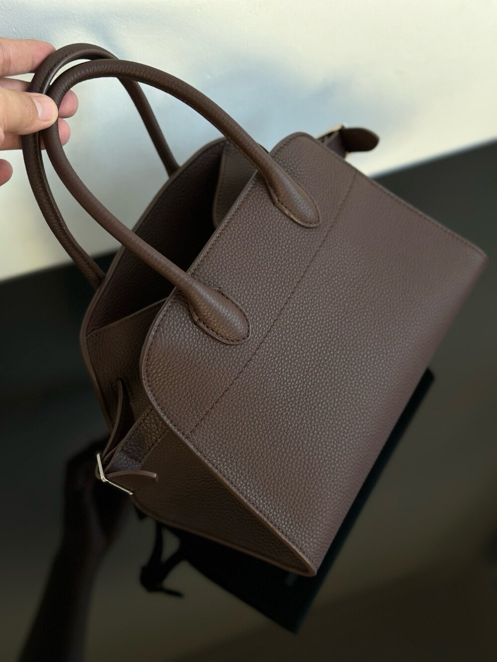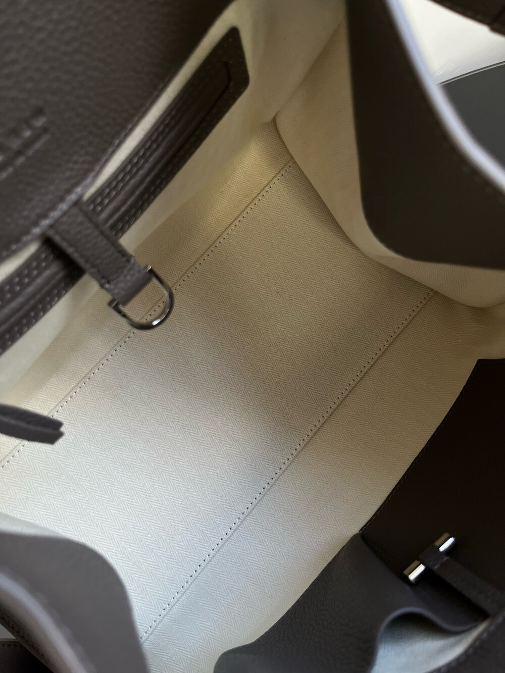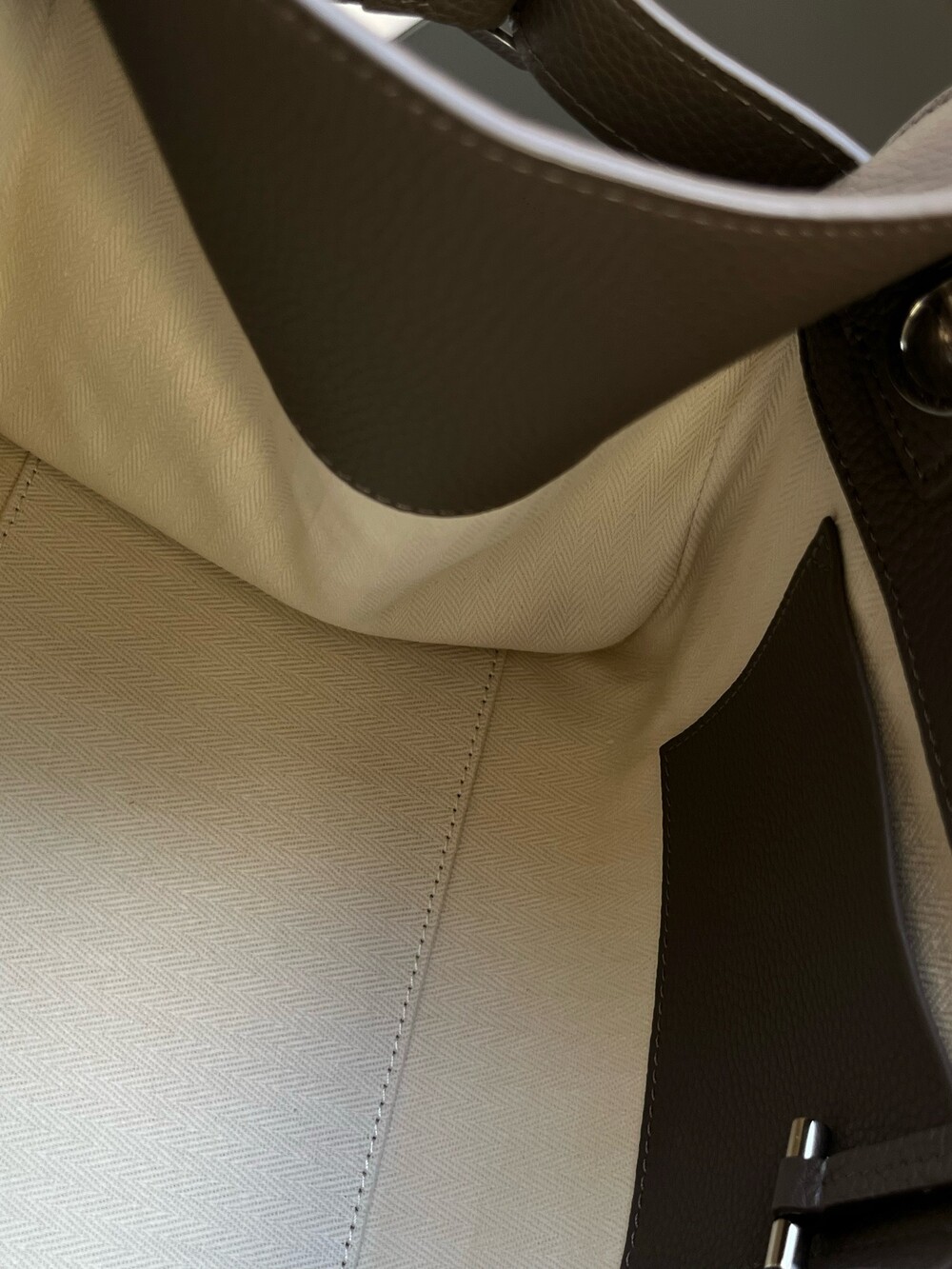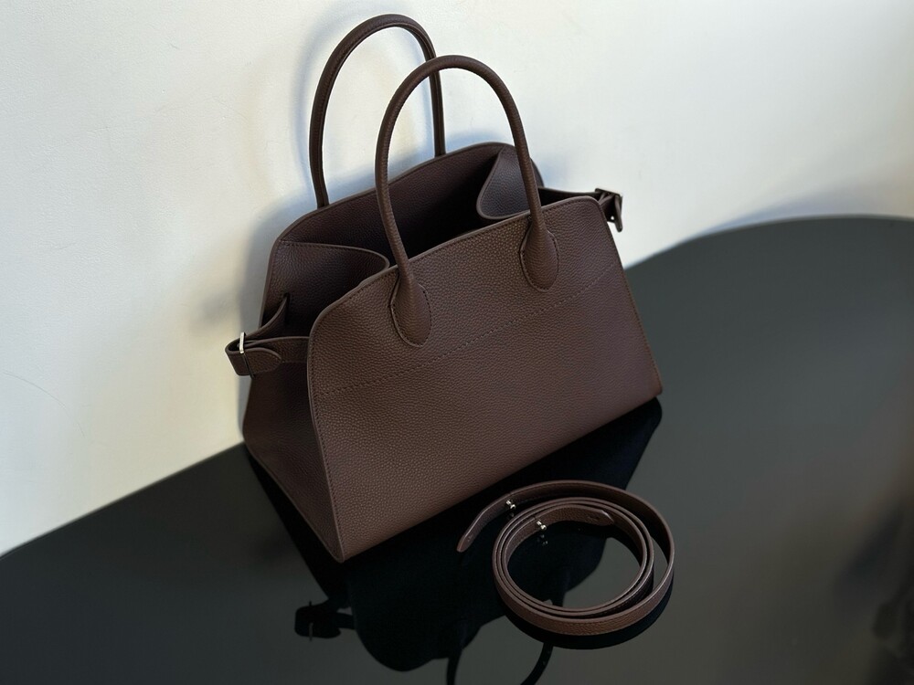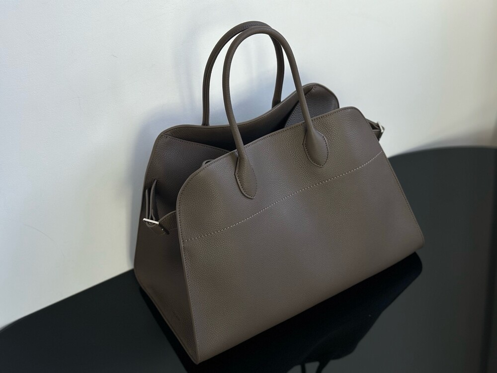 매트 그레인 카프스킨 가죽 소재의 소프트 스트럭처 탑 핸들 백. 벨트가 장식된 사이드 거싯 패널 및 내부 토글 클로저.