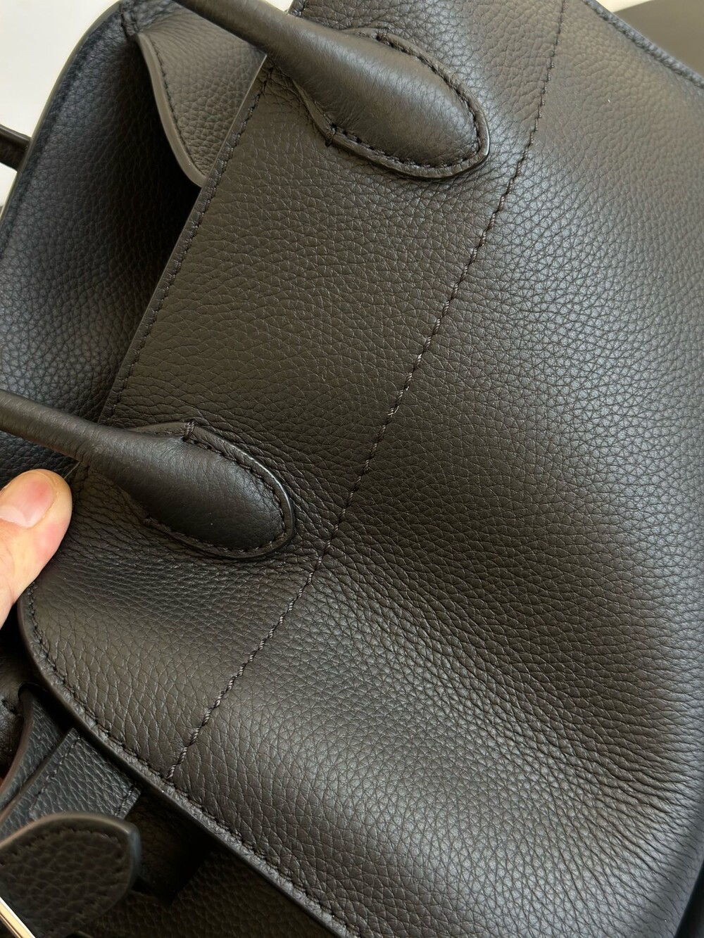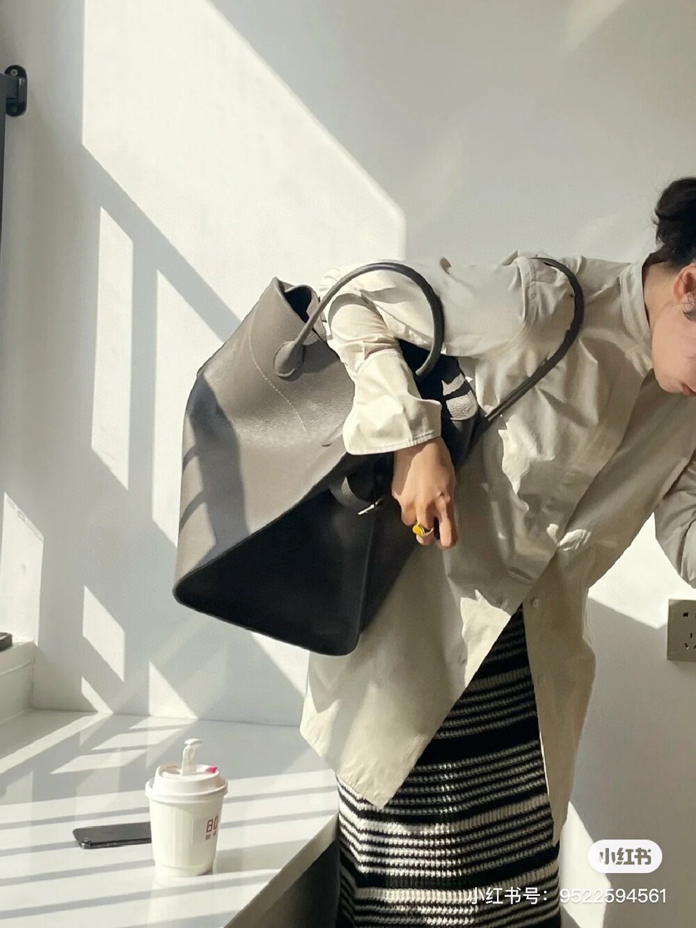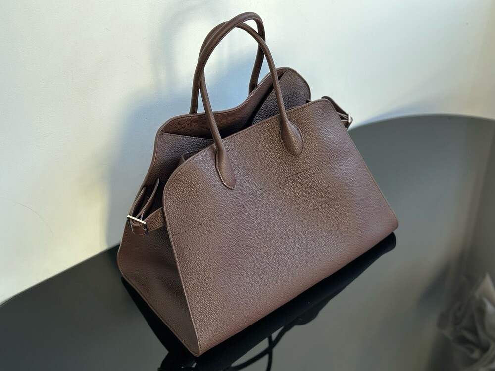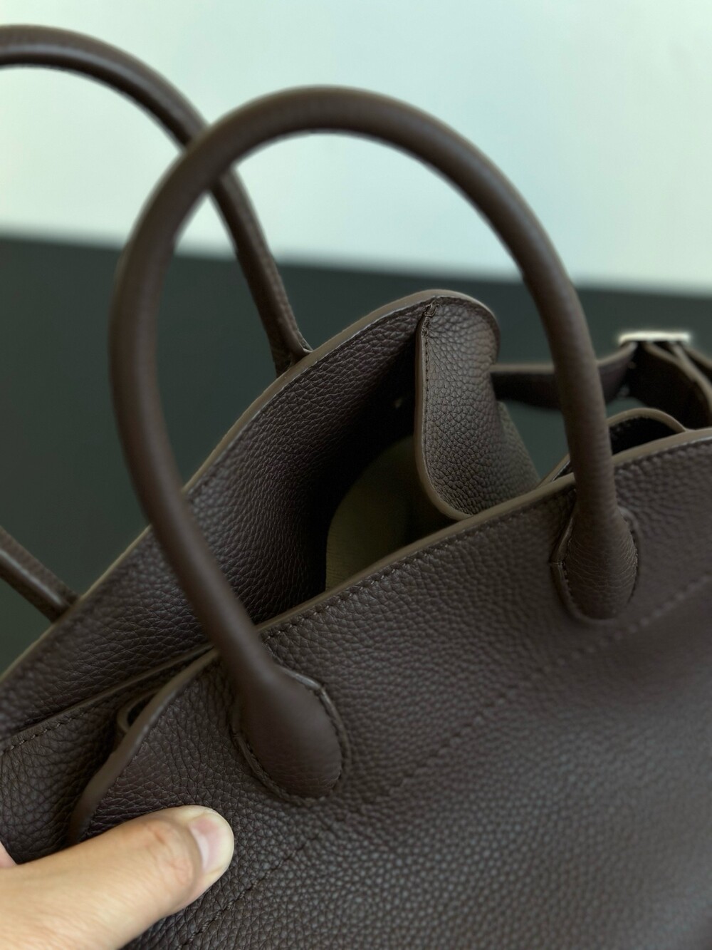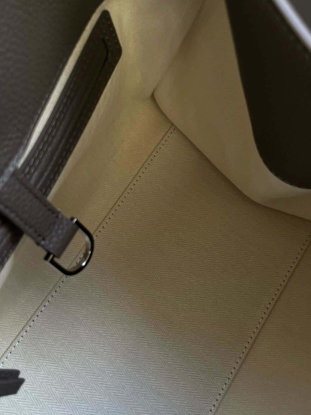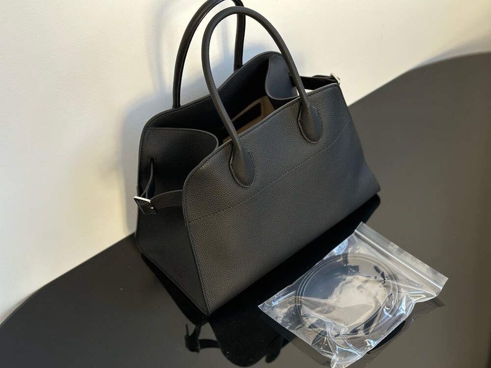 매트 그레인 카프스킨 가죽 소재의 소프트 스트럭처 탑 핸들 백. 벨트가 장식된 사이드 거싯 패널 및 내부 토글 클로저.
