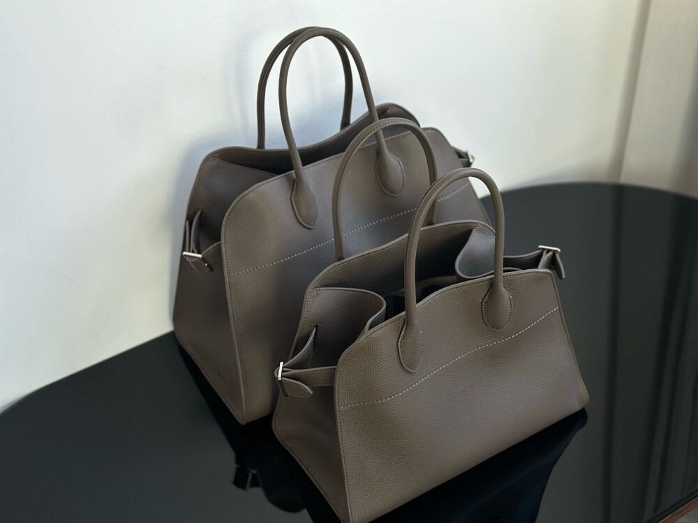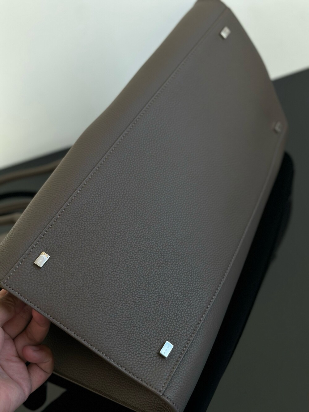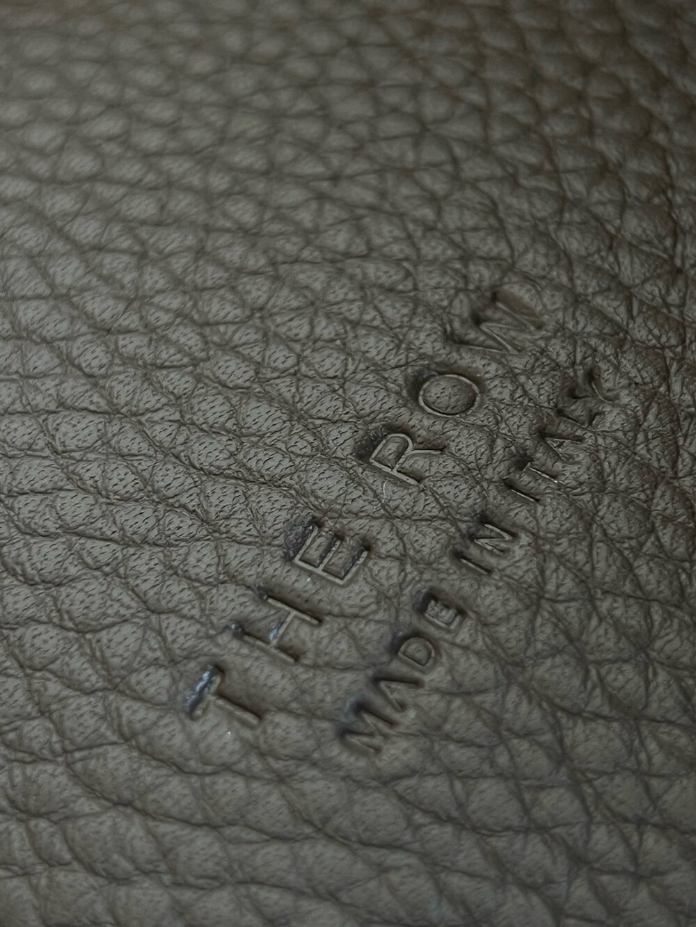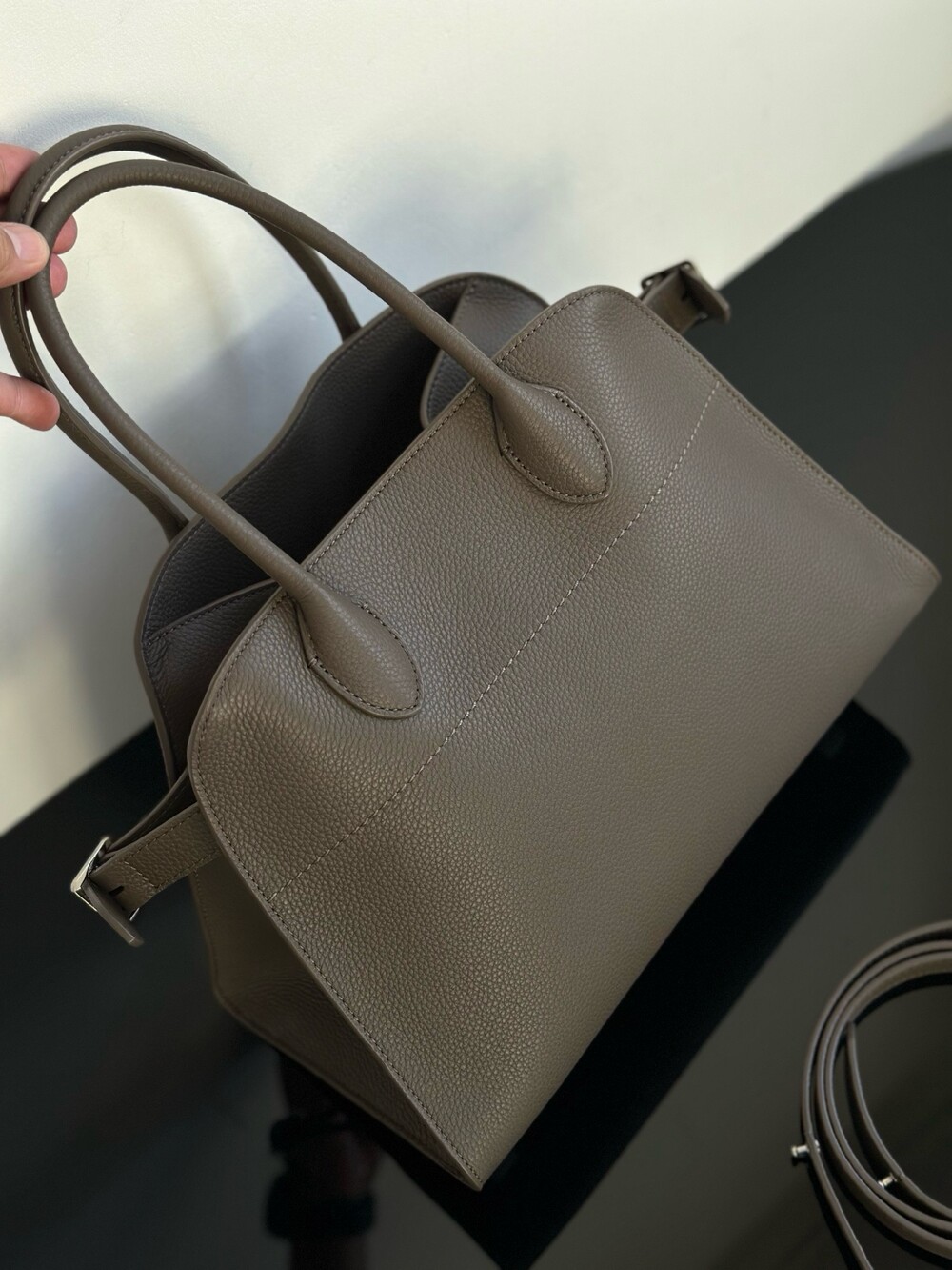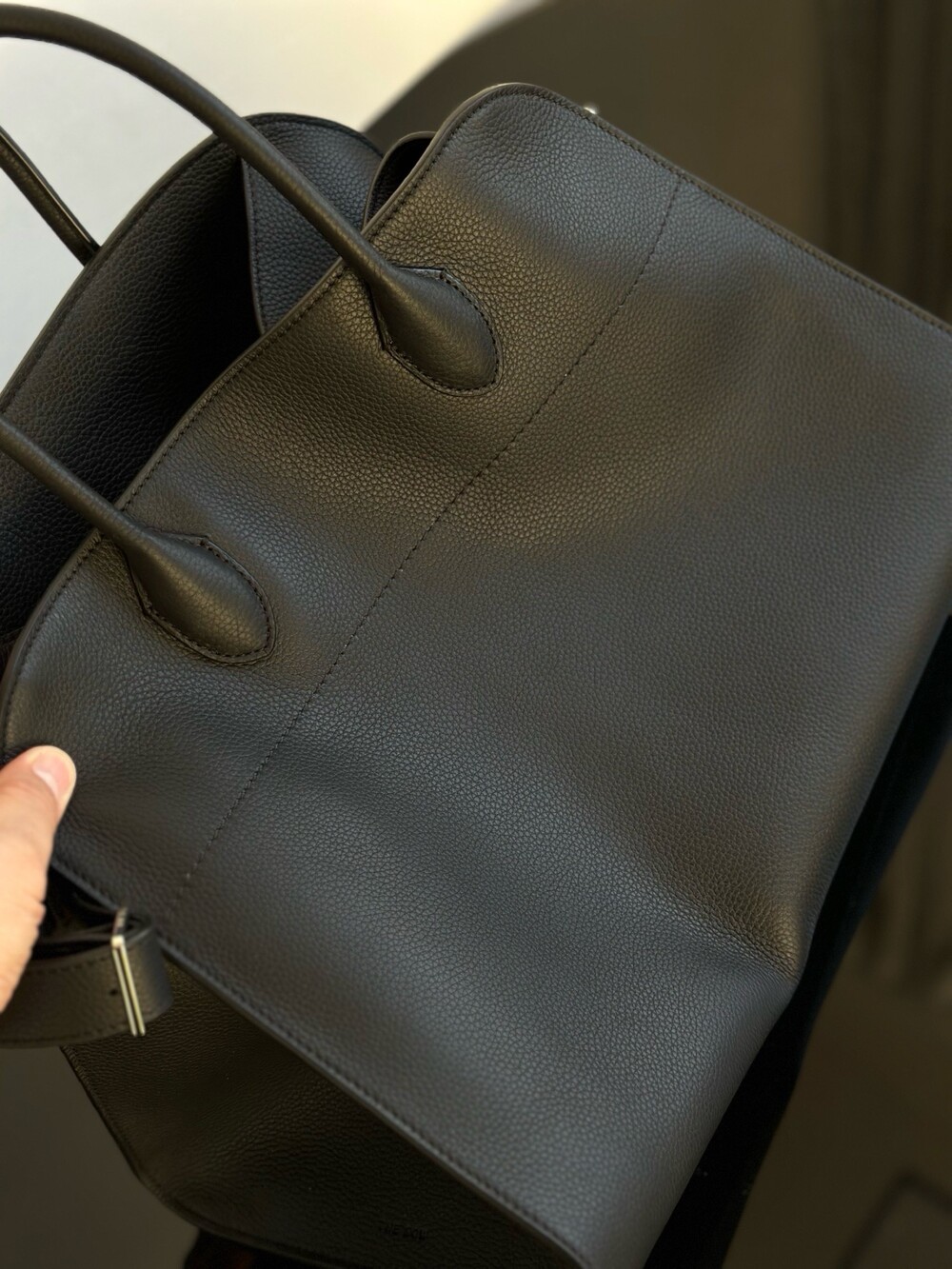 매트 그레인 카프스킨 가죽 소재의 소프트 스트럭처 탑 핸들 백. 벨트가 장식된 사이드 거싯 패널 및 내부 토글 클로저.