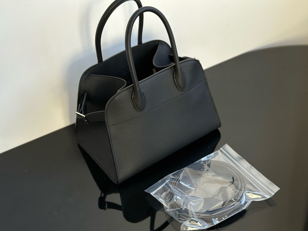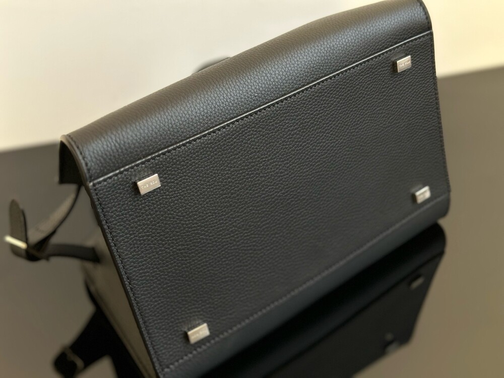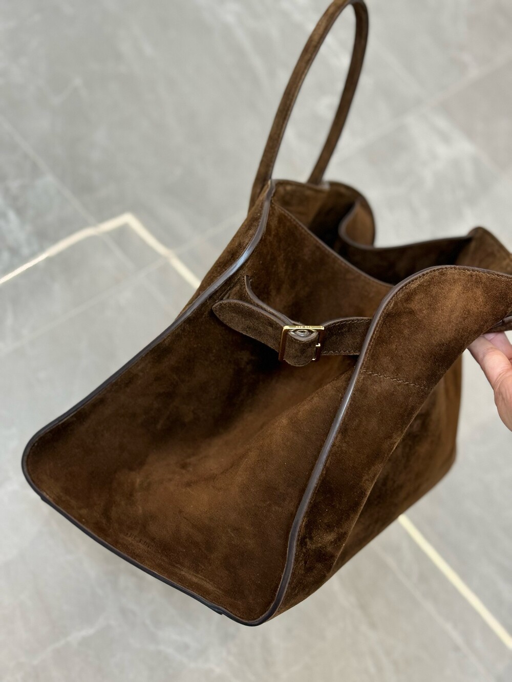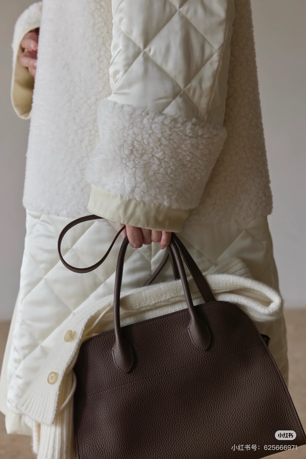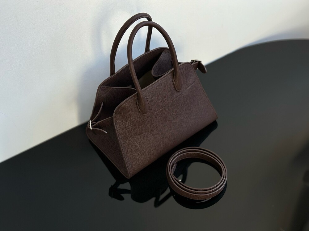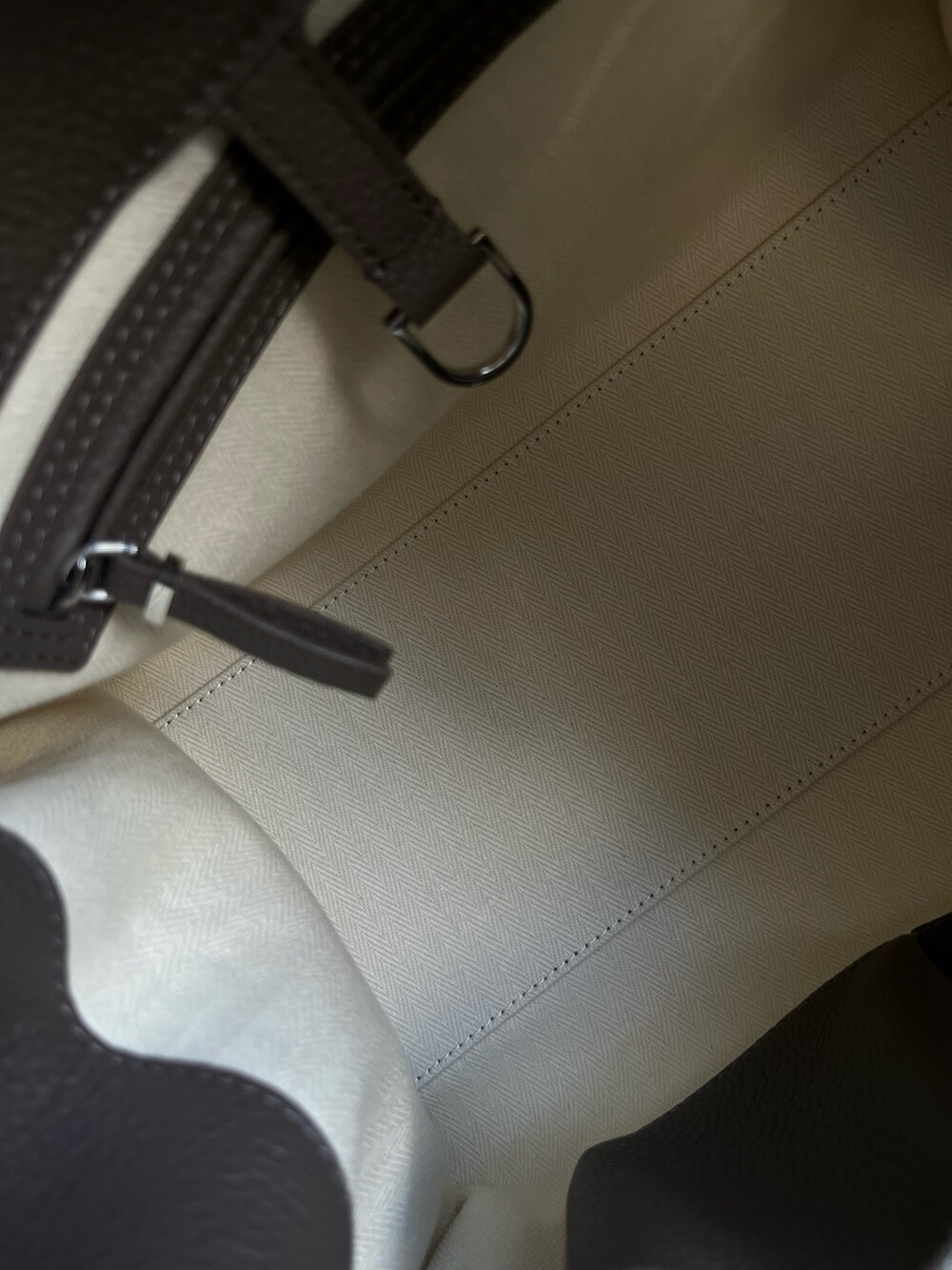 매트 그레인 카프스킨 가죽 소재의 소프트 스트럭처 탑 핸들 백. 벨트가 장식된 사이드 거싯 패널 및 내부 토글 클로저.