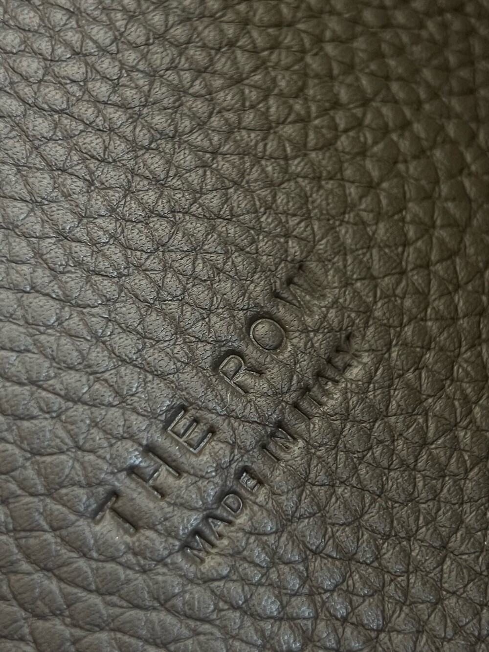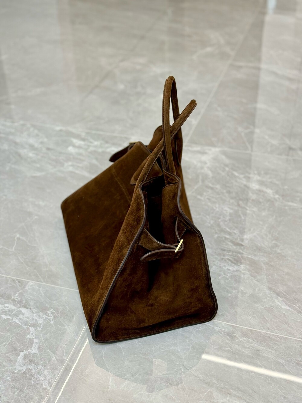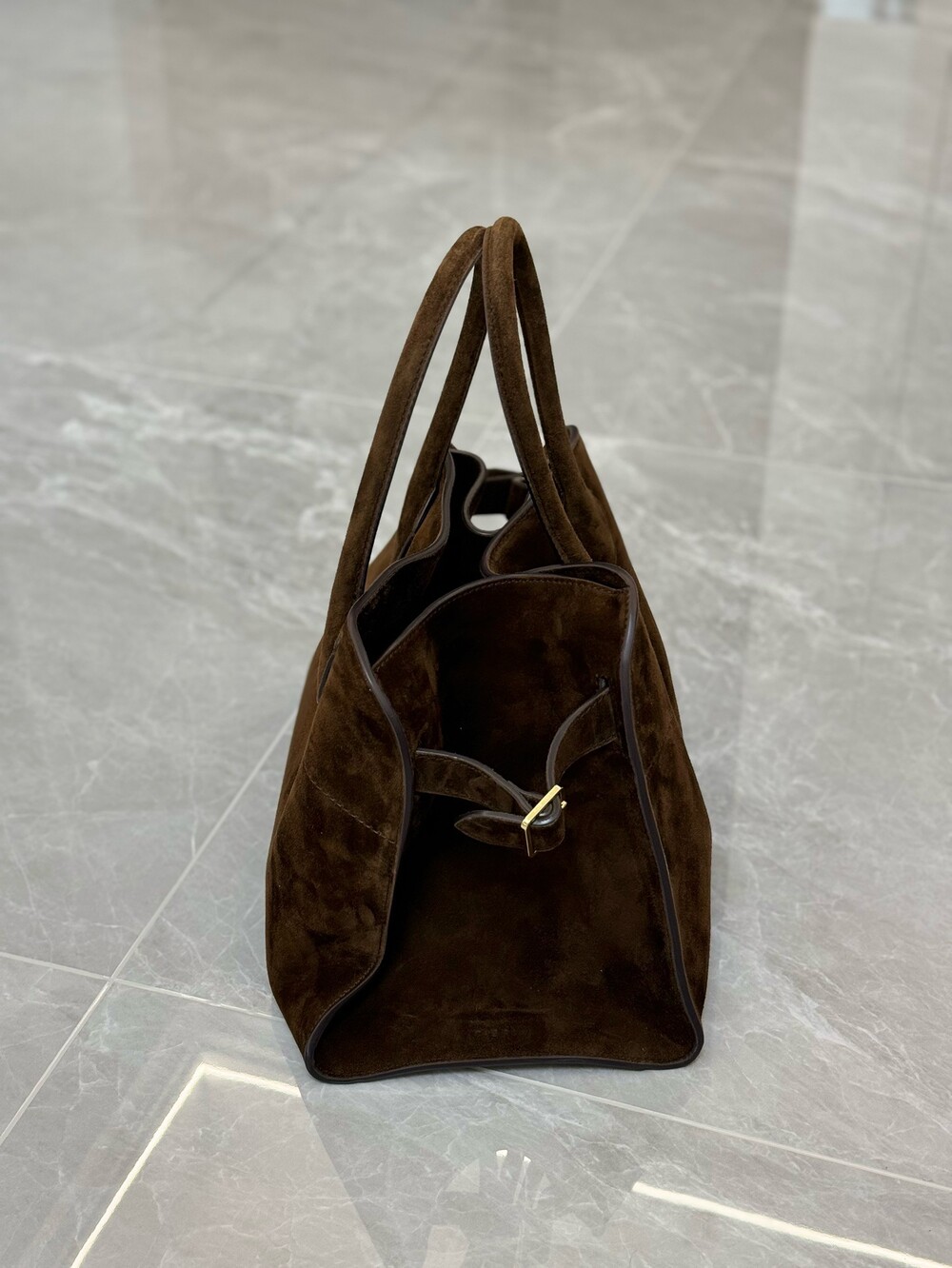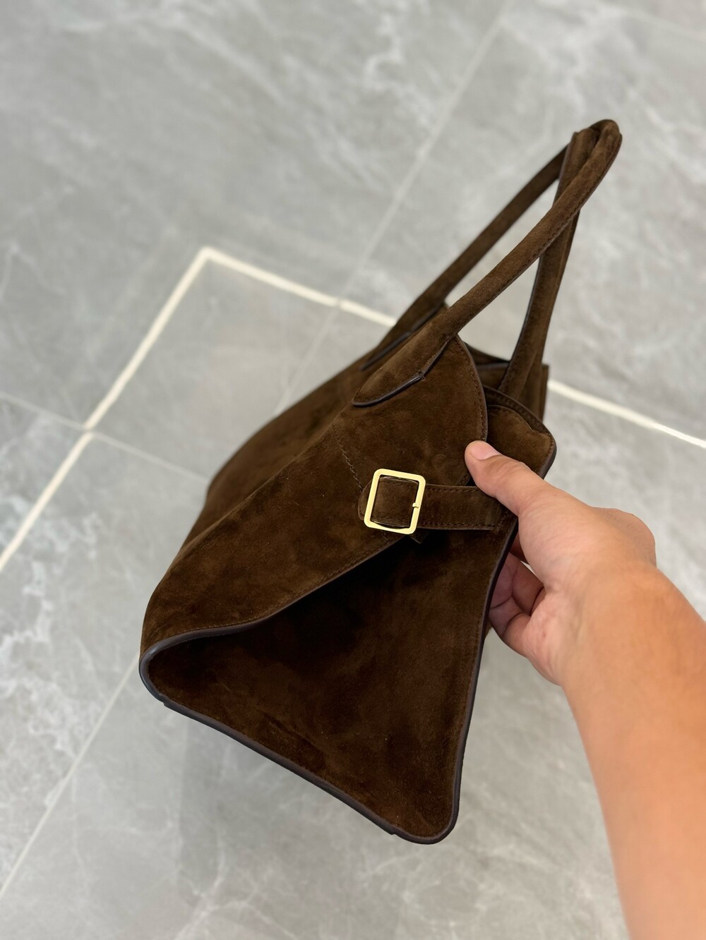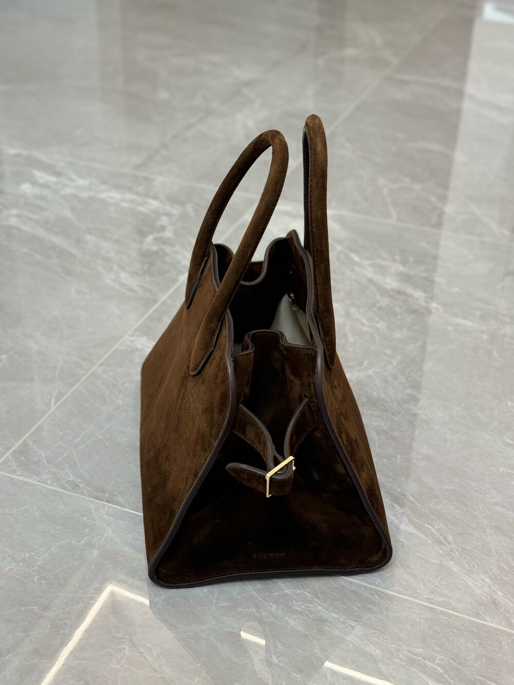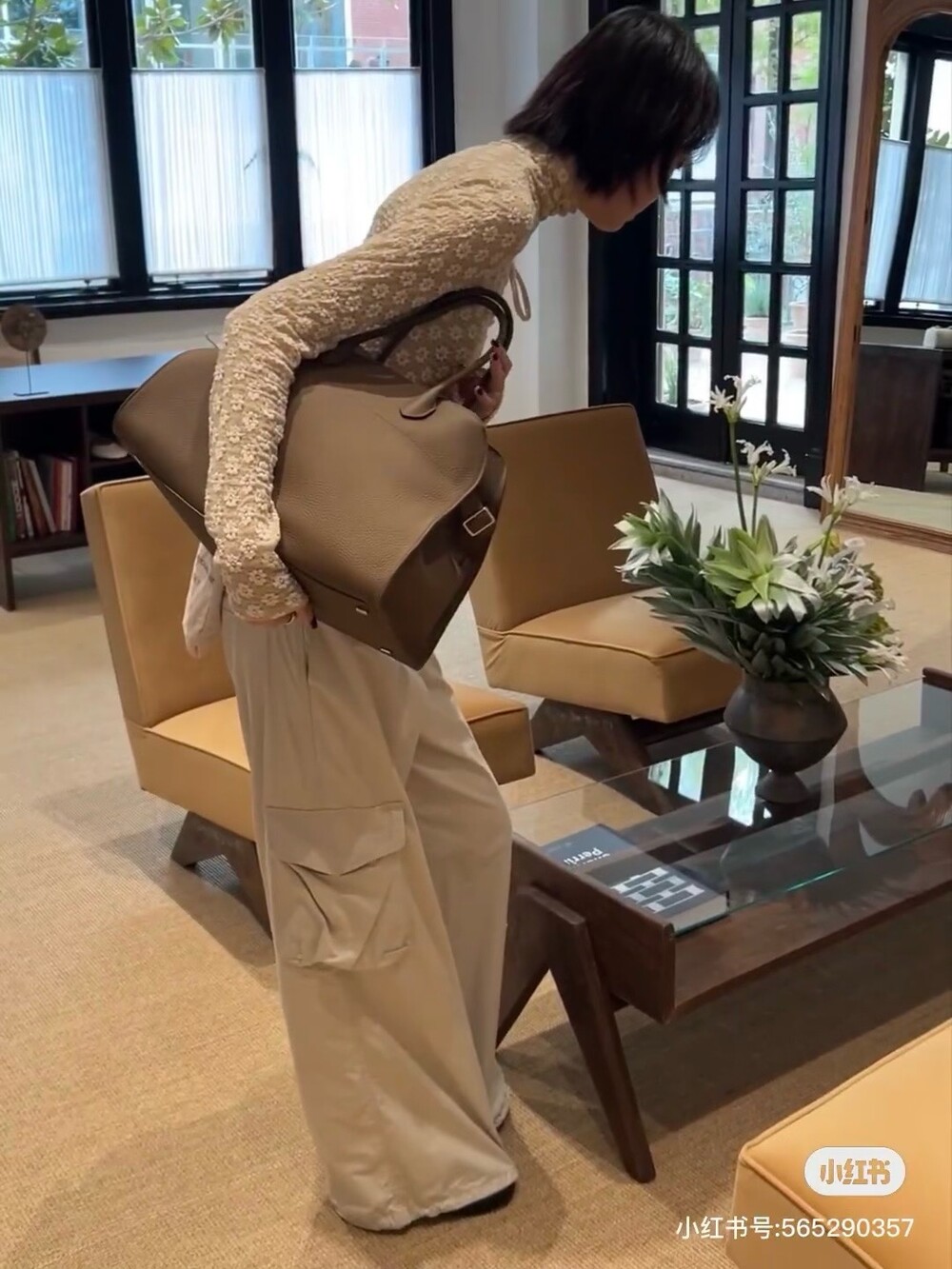 매트 그레인 카프스킨 가죽 소재의 소프트 스트럭처 탑 핸들 백. 벨트가 장식된 사이드 거싯 패널 및 내부 토글 클로저.