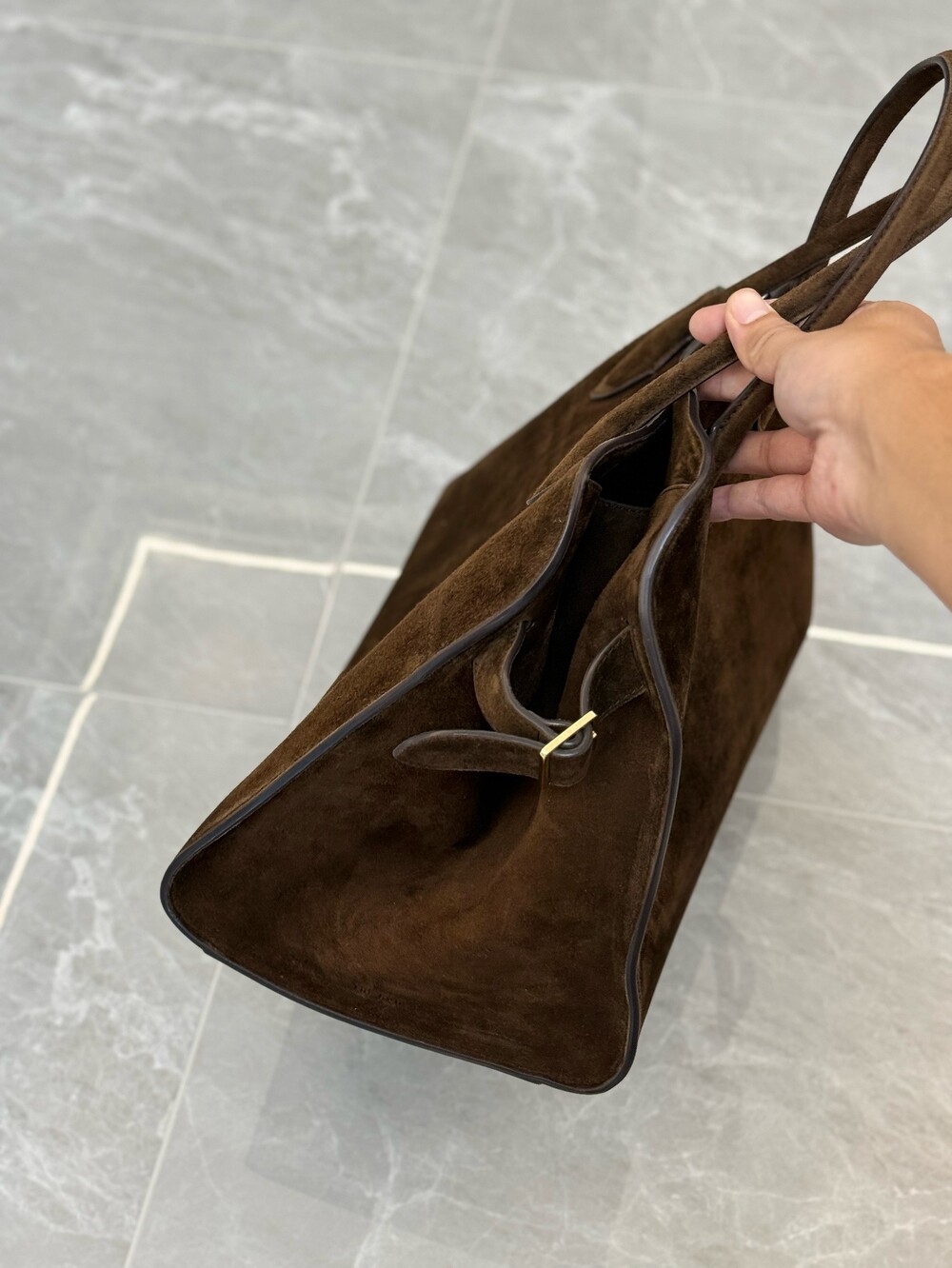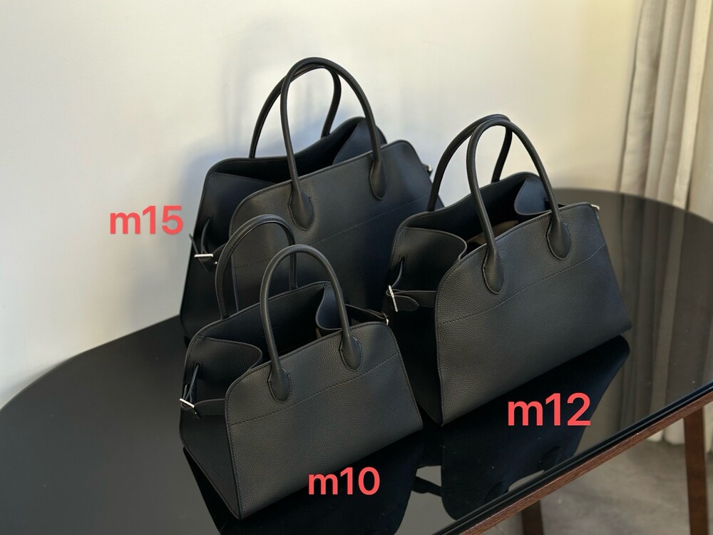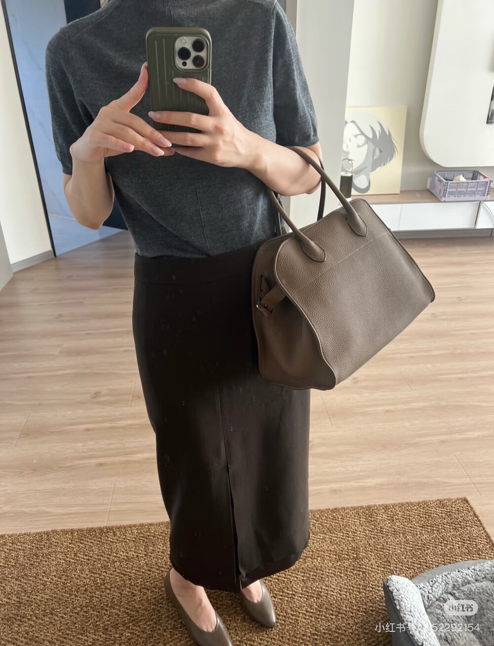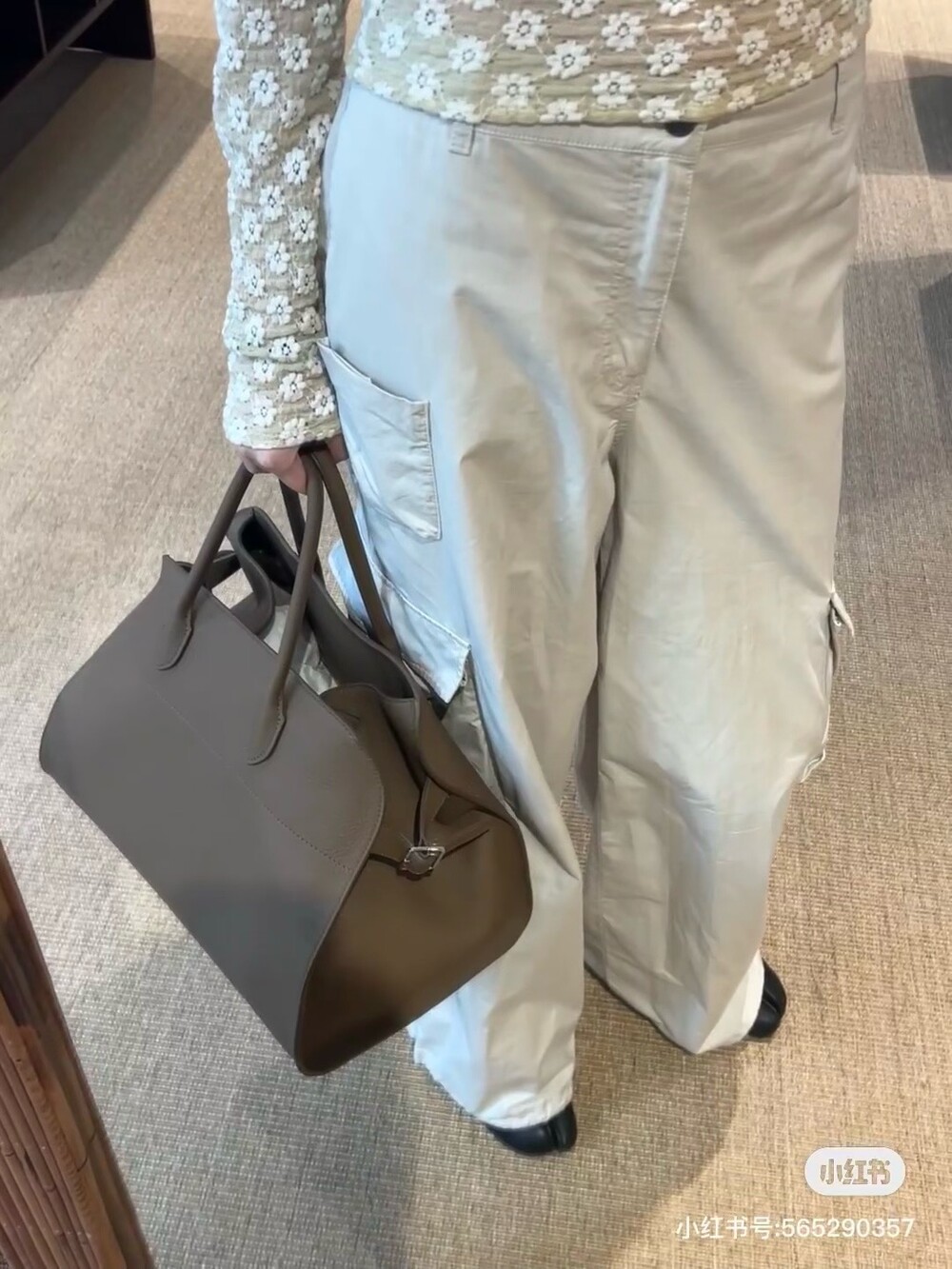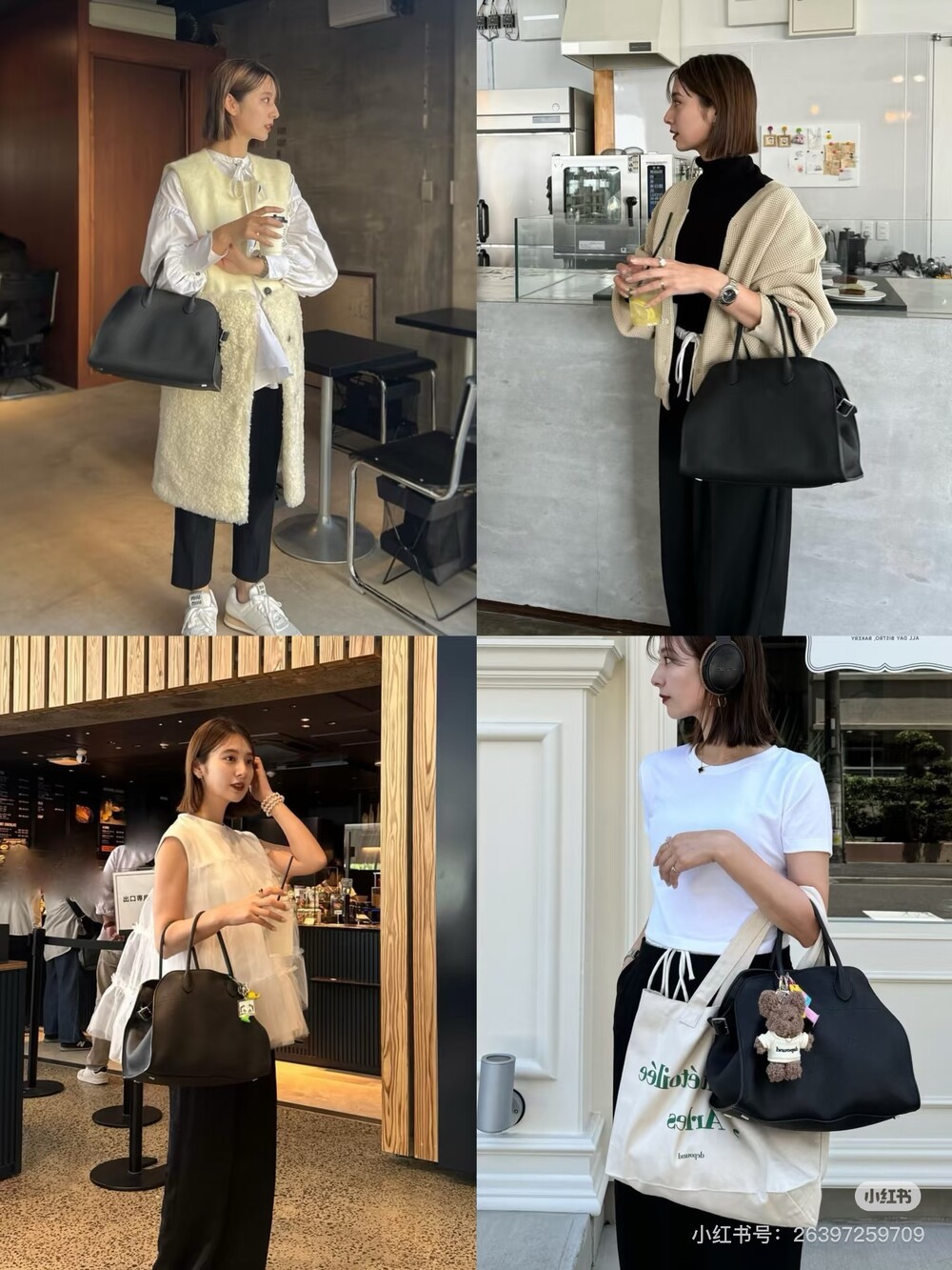 매트 그레인 카프스킨 가죽 소재의 소프트 스트럭처 탑 핸들 백. 벨트가 장식된 사이드 거싯 패널 및 내부 토글 클로저.