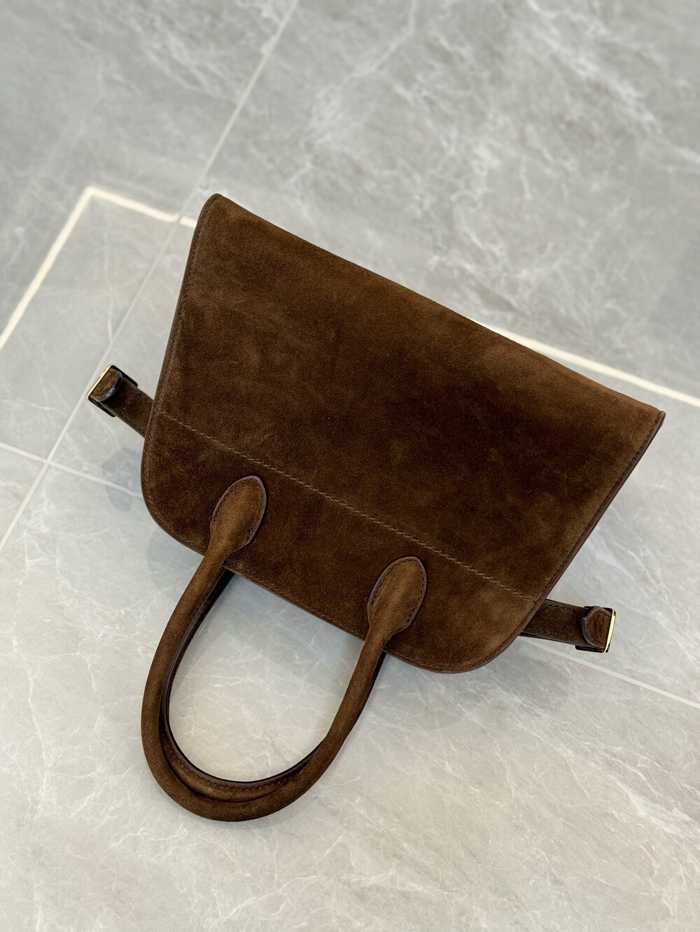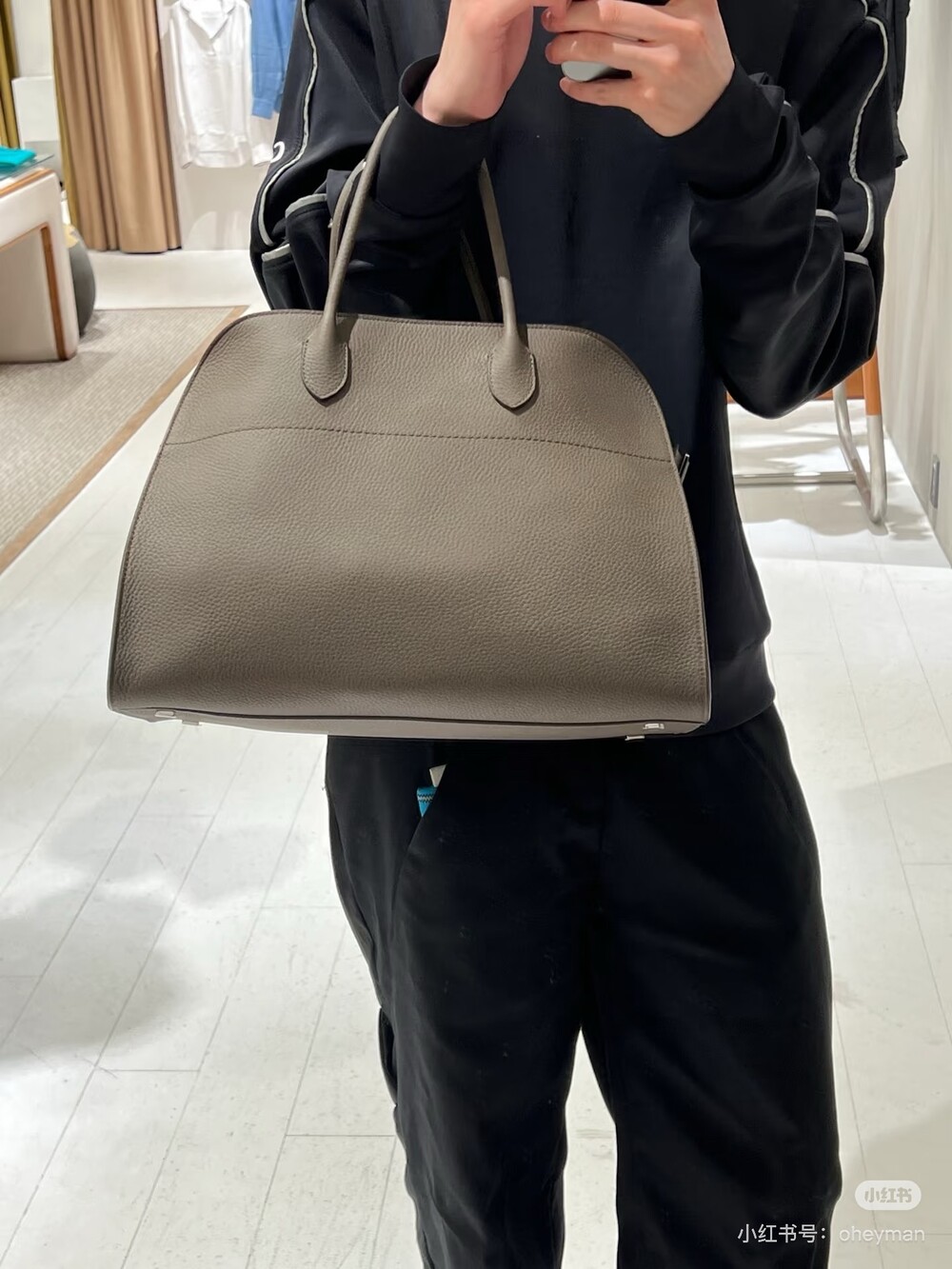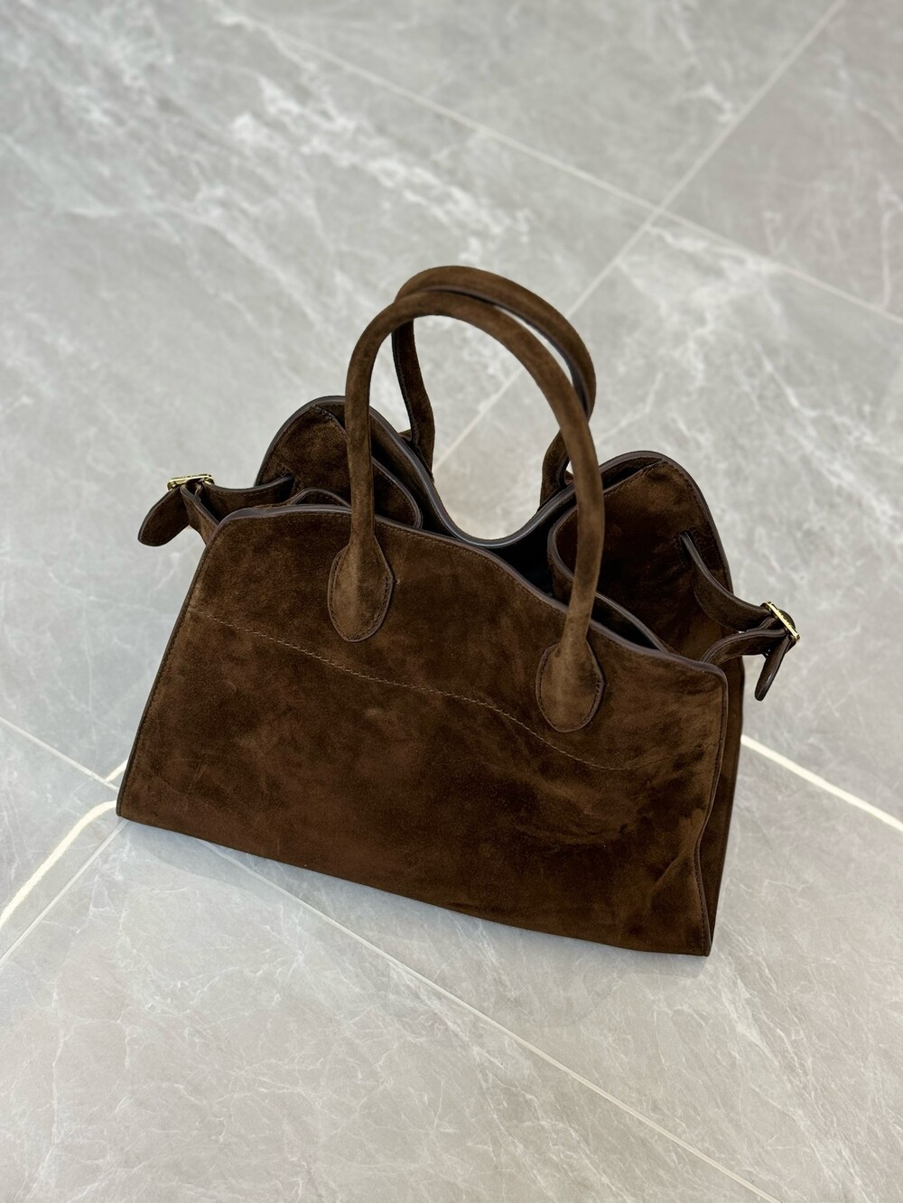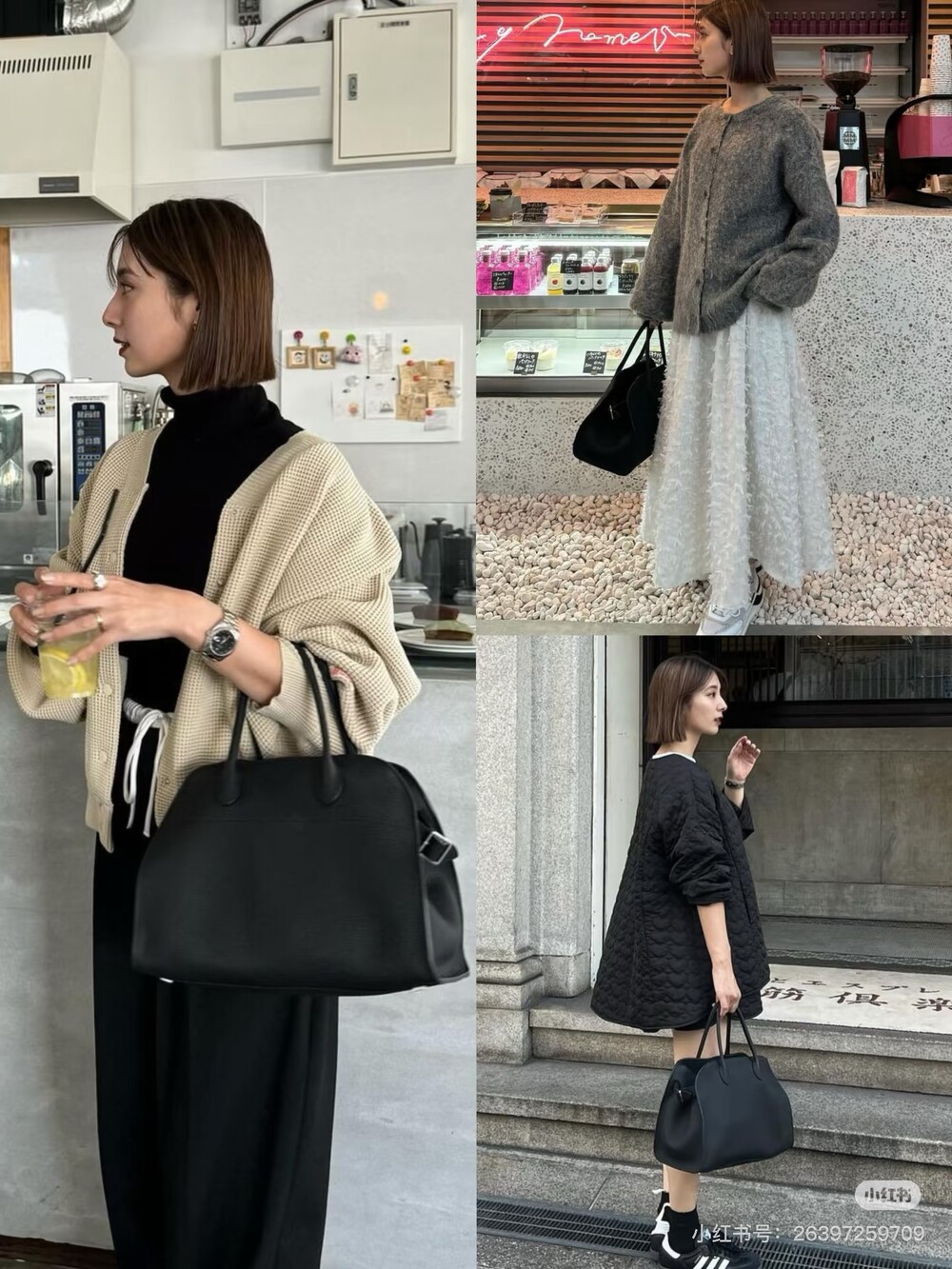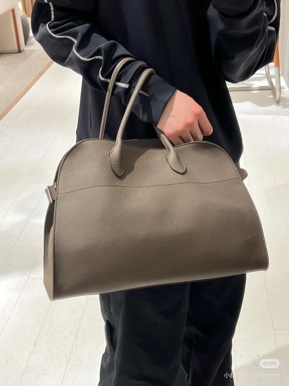 매트 그레인 카프스킨 가죽 소재의 소프트 스트럭처 탑 핸들 백. 벨트가 장식된 사이드 거싯 패널 및 내부 토글 클로저.
