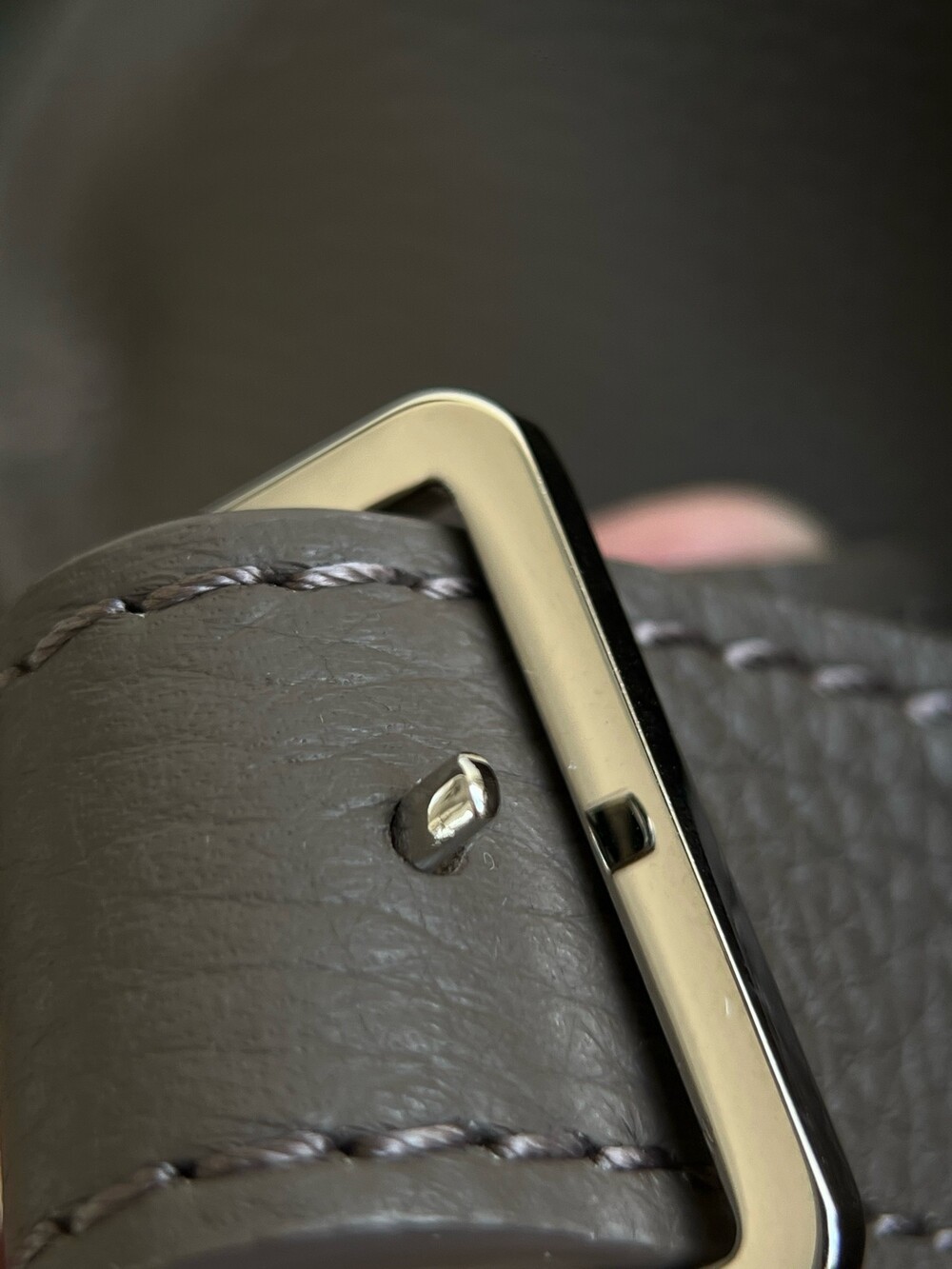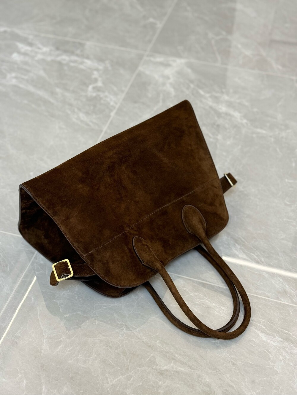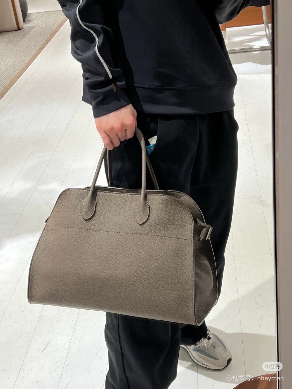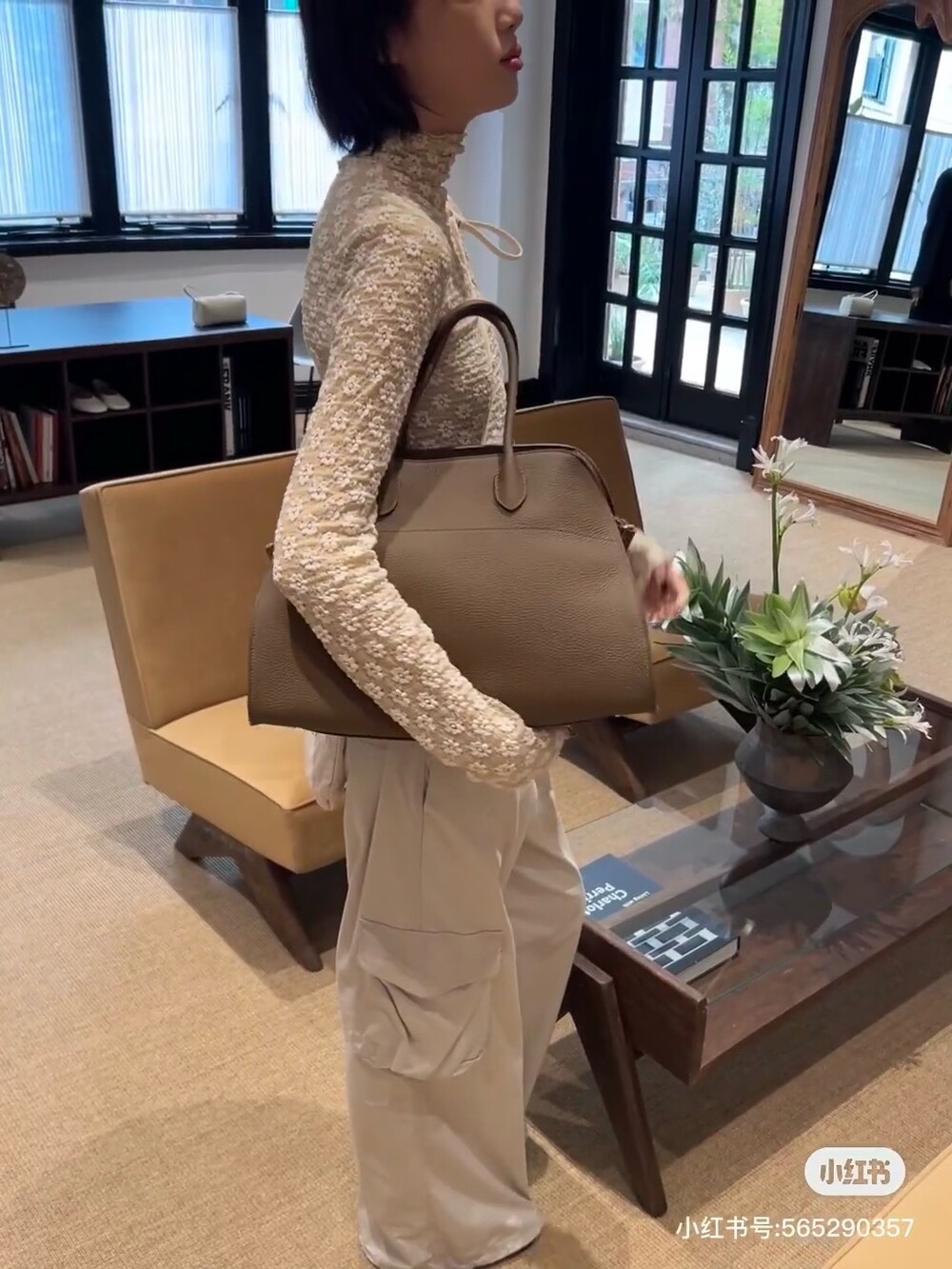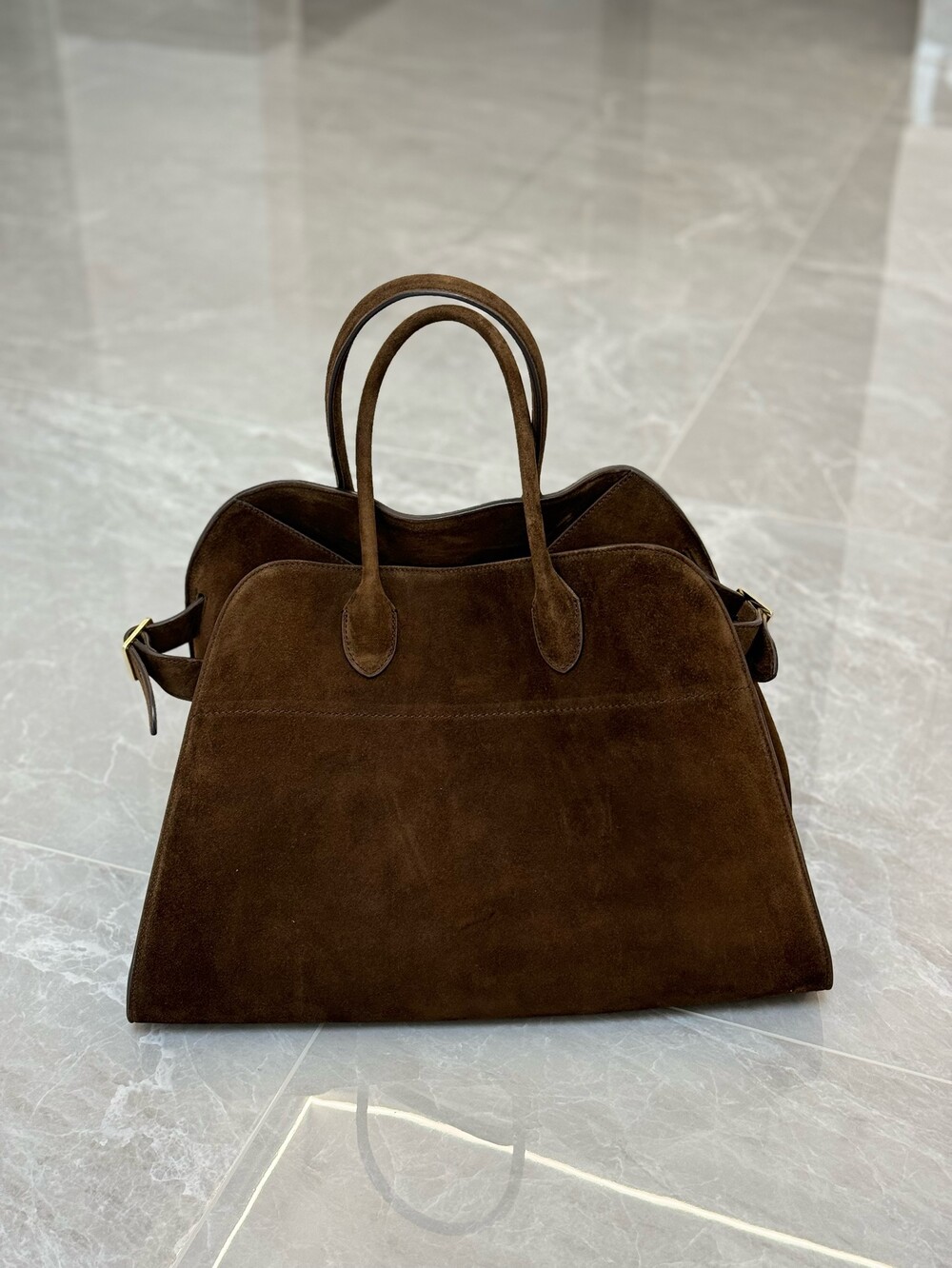 매트 그레인 카프스킨 가죽 소재의 소프트 스트럭처 탑 핸들 백. 벨트가 장식된 사이드 거싯 패널 및 내부 토글 클로저.