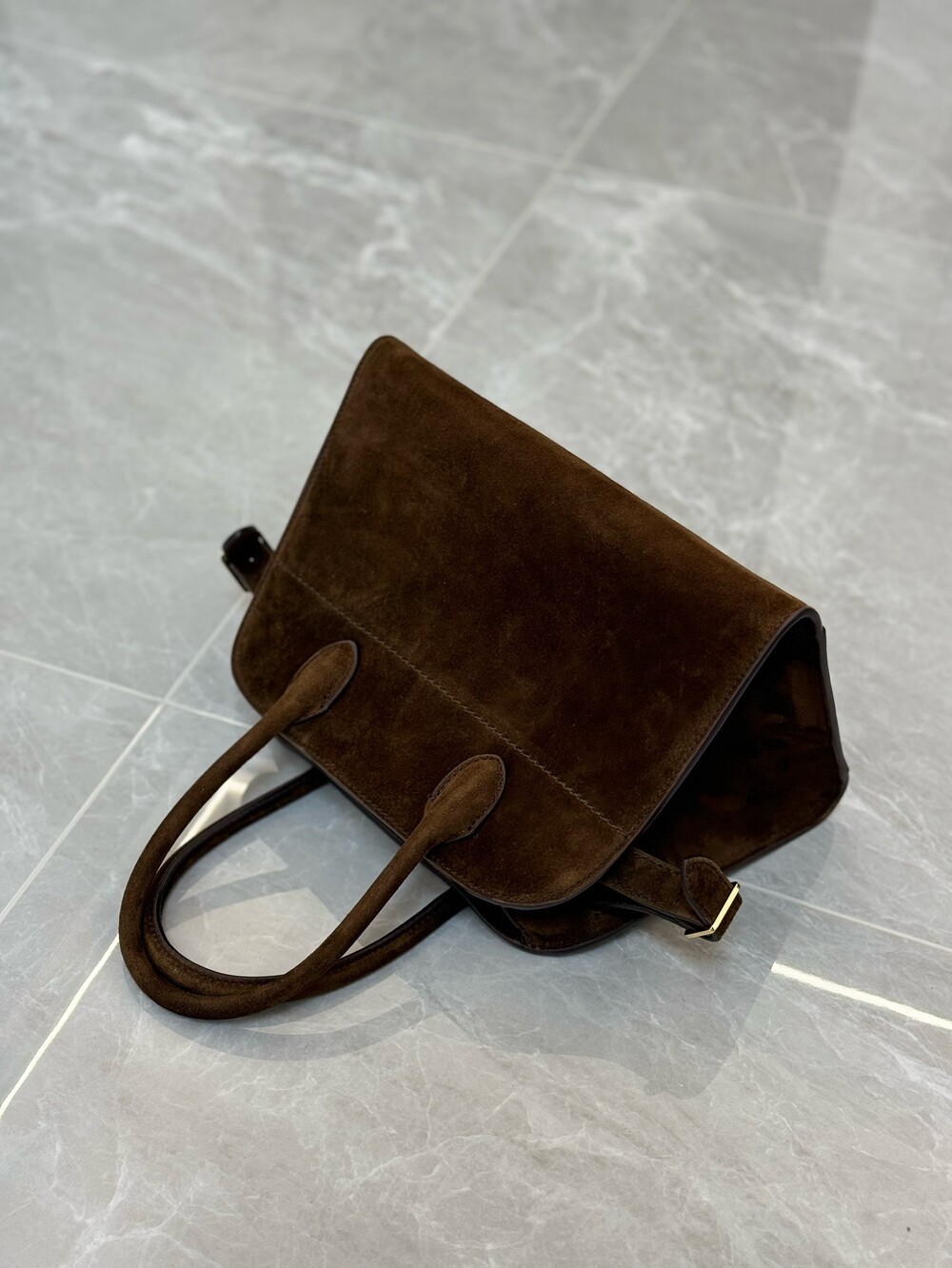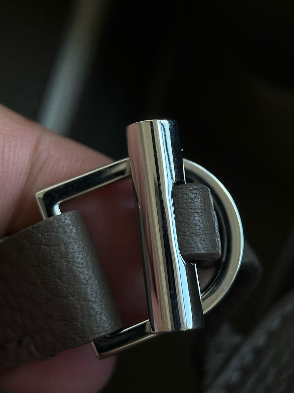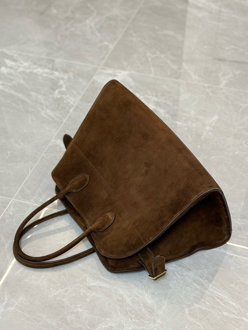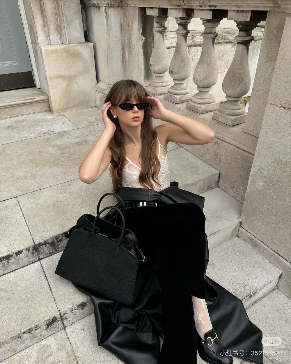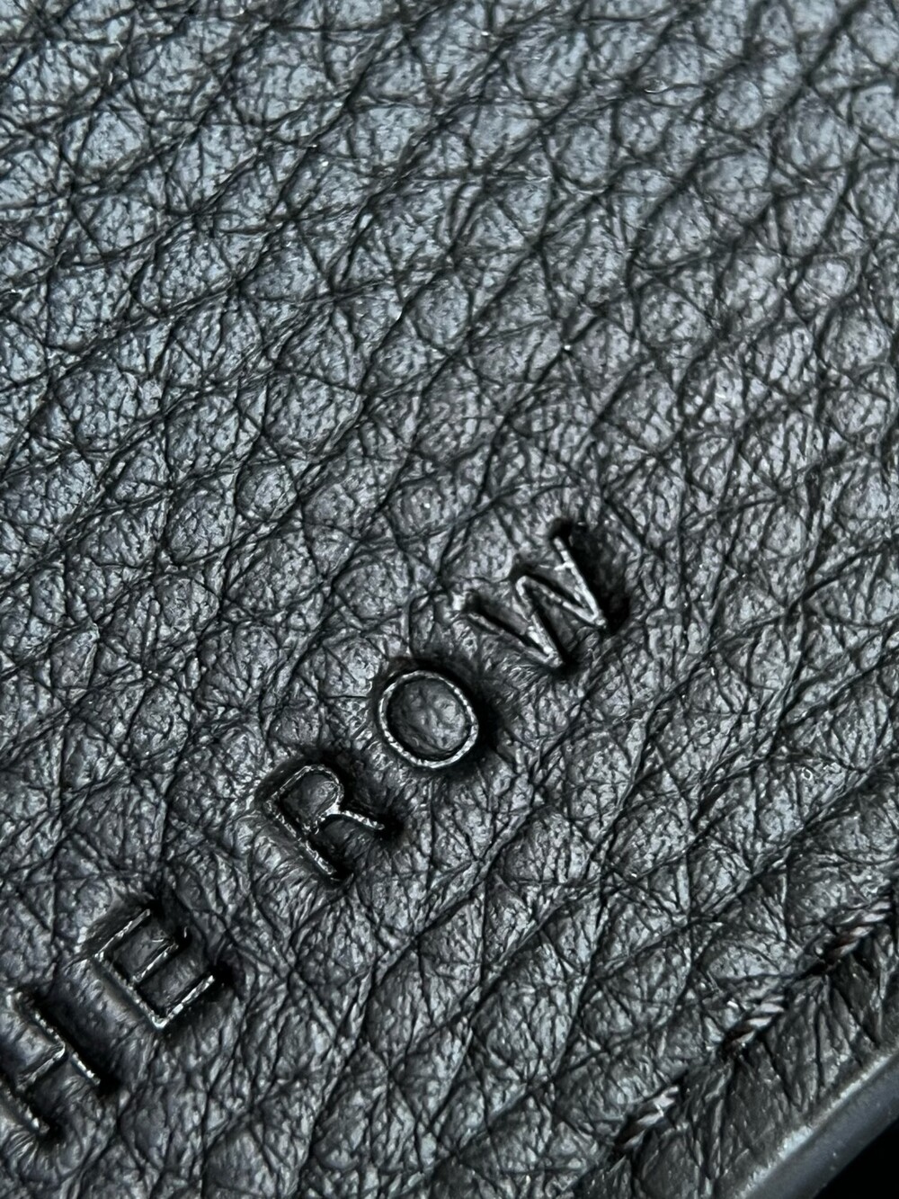 매트 그레인 카프스킨 가죽 소재의 소프트 스트럭처 탑 핸들 백. 벨트가 장식된 사이드 거싯 패널 및 내부 토글 클로저.